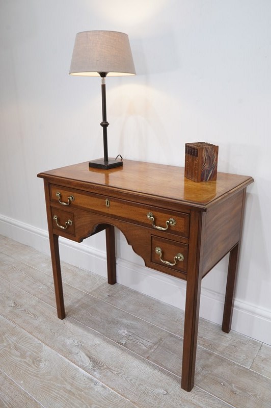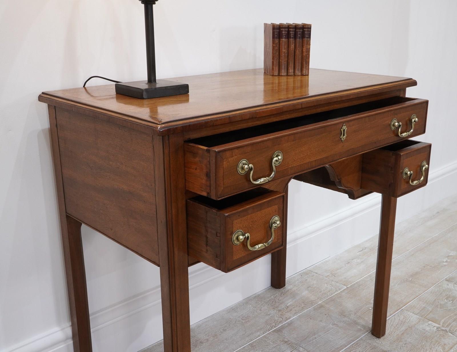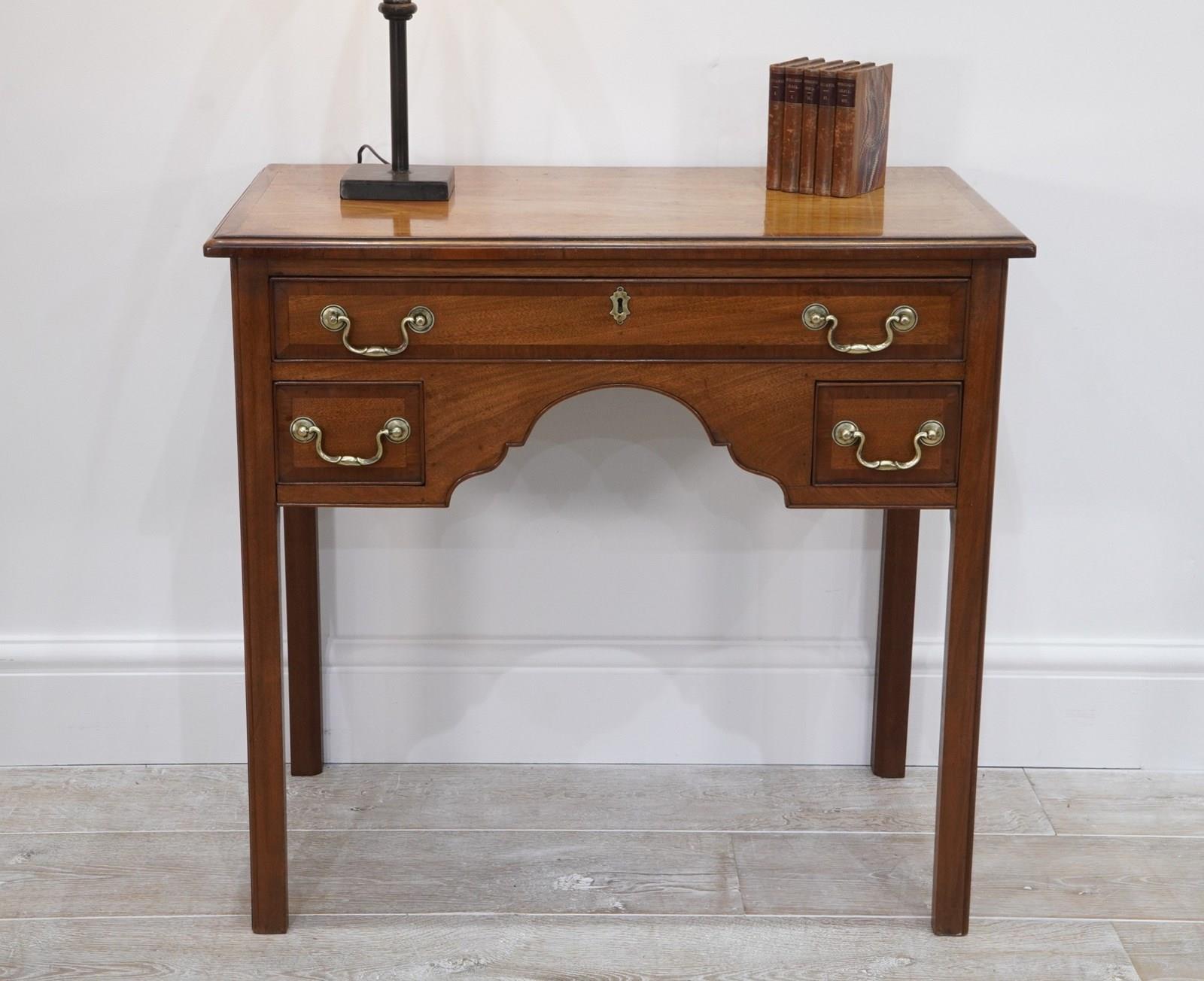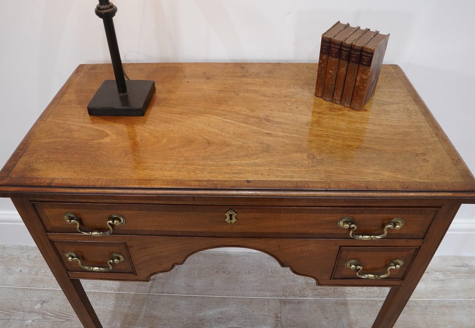 An English Georgian lowboy. This elegant lowboy boasts three useful drawers with neat cross banding detail to the edges together with the original patinated brass handles. The mahogany timbers have mellowed to a beautiful golden colour over the passage of time developing a richly patinated surface along the way. Standing on four solid mahogany legs. Superb condition. Cleaned and polished ready to be placed in the home with no fuss! Georgian mahogany lowboy. Circa 1820.