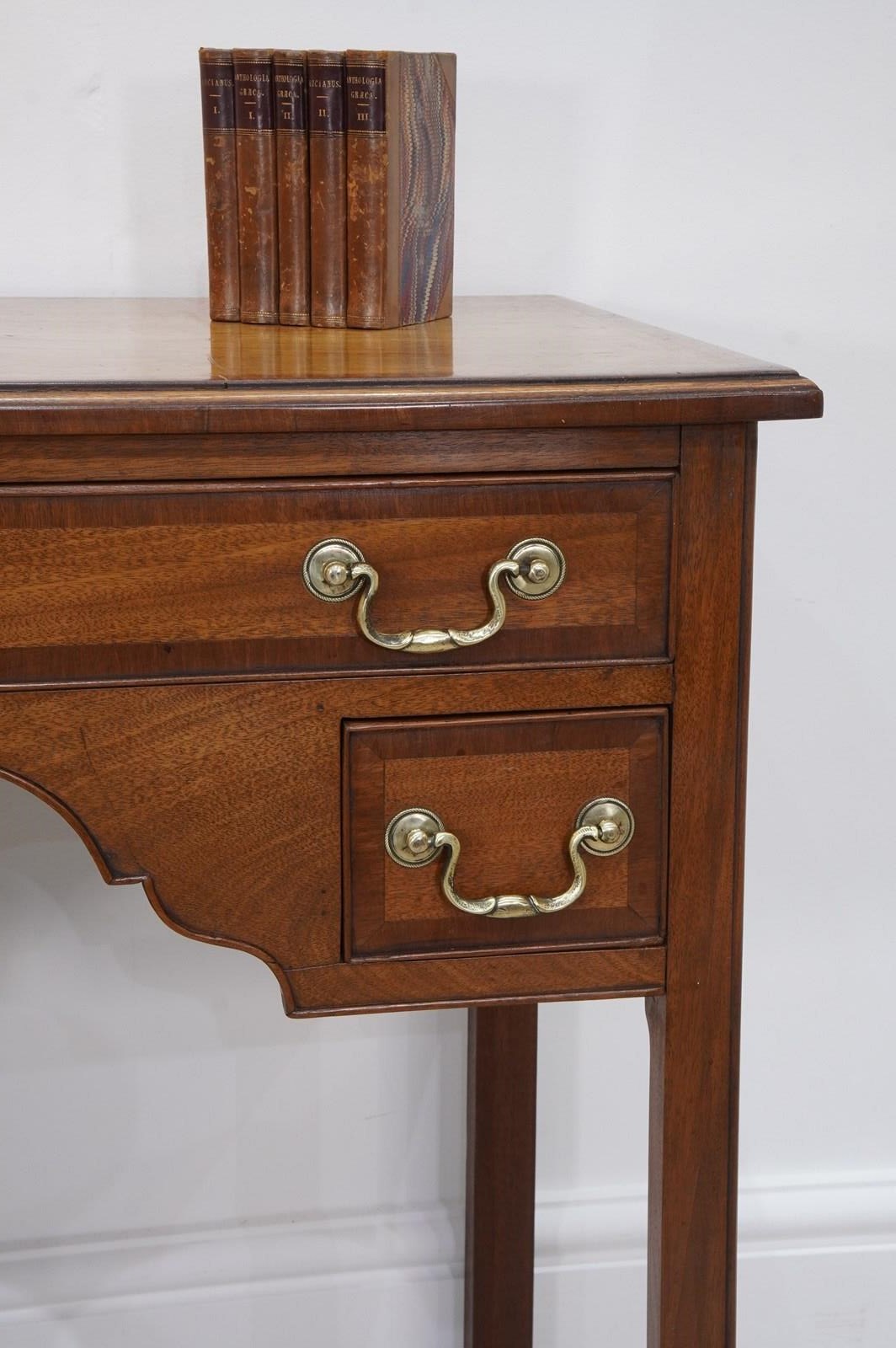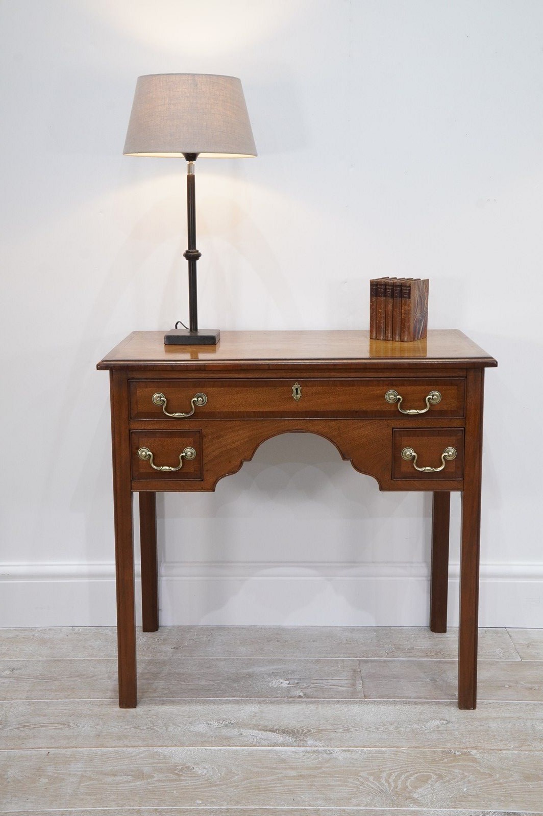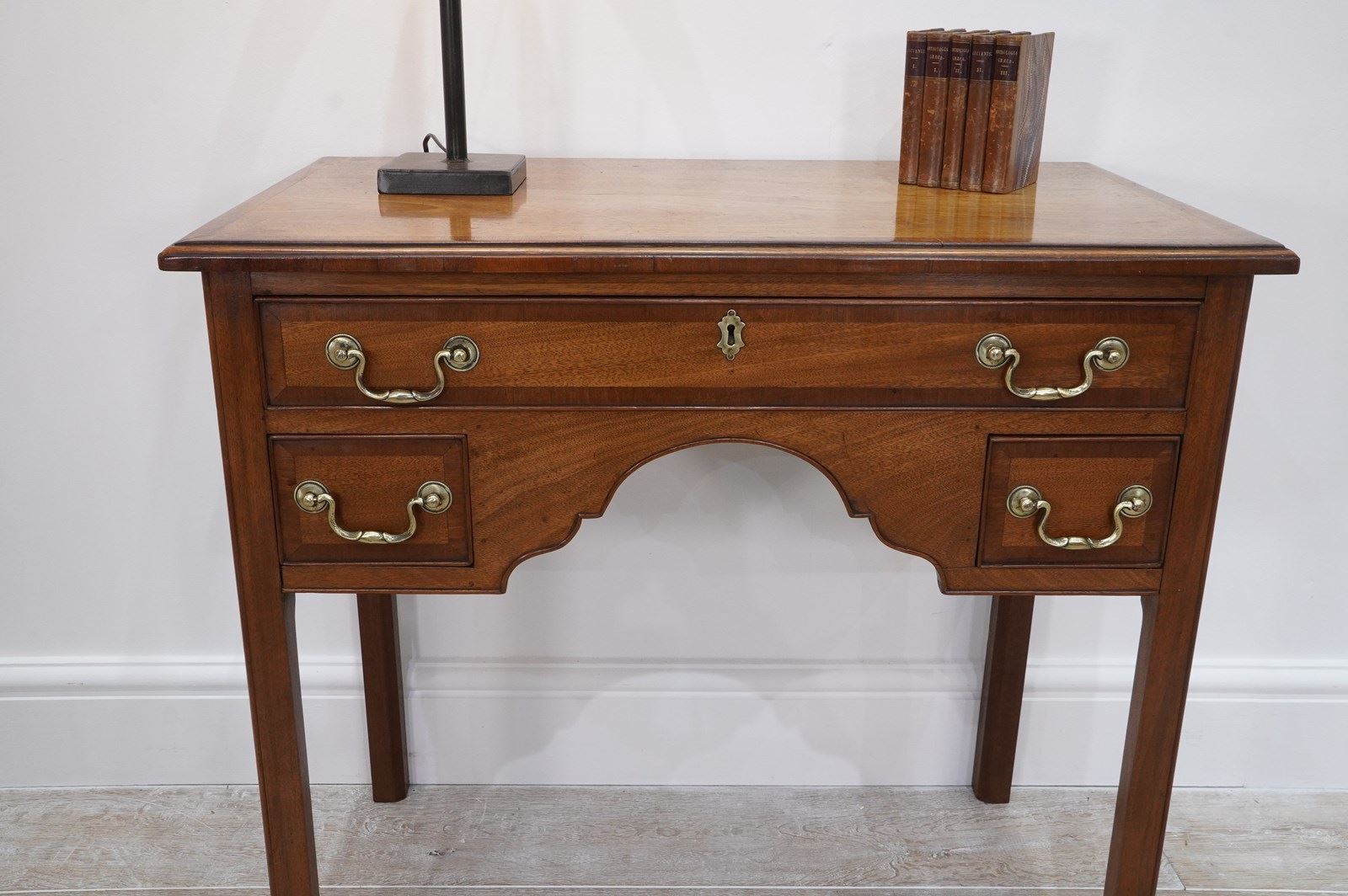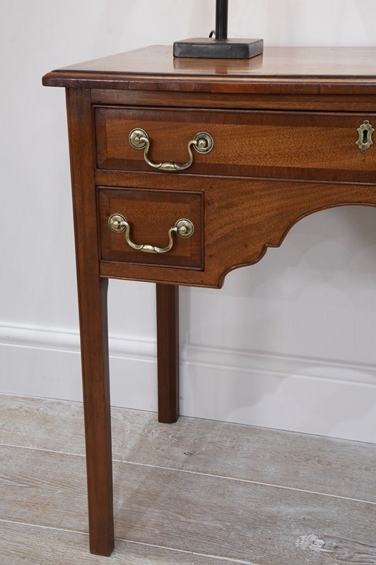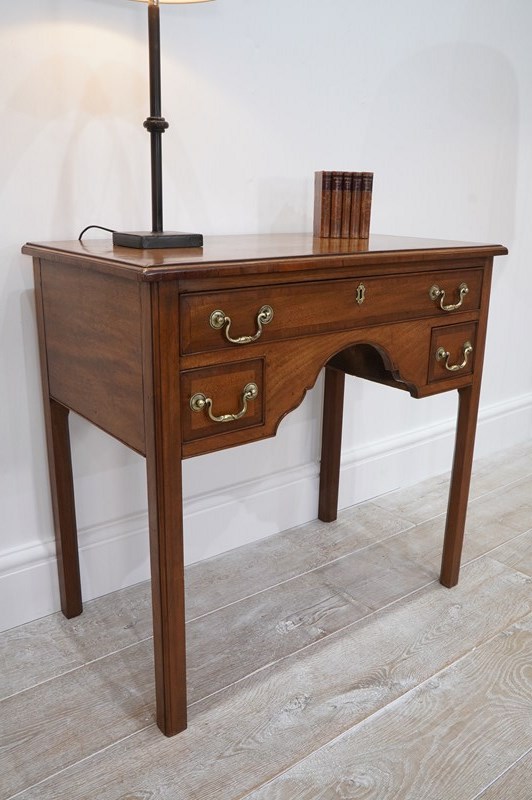 An English Georgian lowboy. This elegant lowboy boasts three useful drawers with neat cross banding detail to the edges together with the original patinated brass handles. The mahogany timbers have mellowed to a beautiful golden colour over the passage of time developing a richly patinated surface along the way. Standing on four solid mahogany legs. Superb condition. Cleaned and polished ready to be placed in the home with no fuss! Georgian mahogany lowboy. Circa 1820.