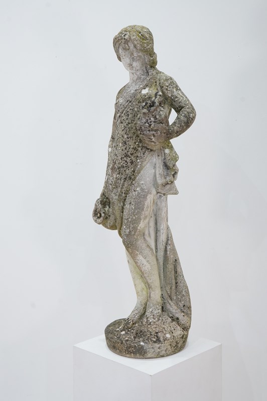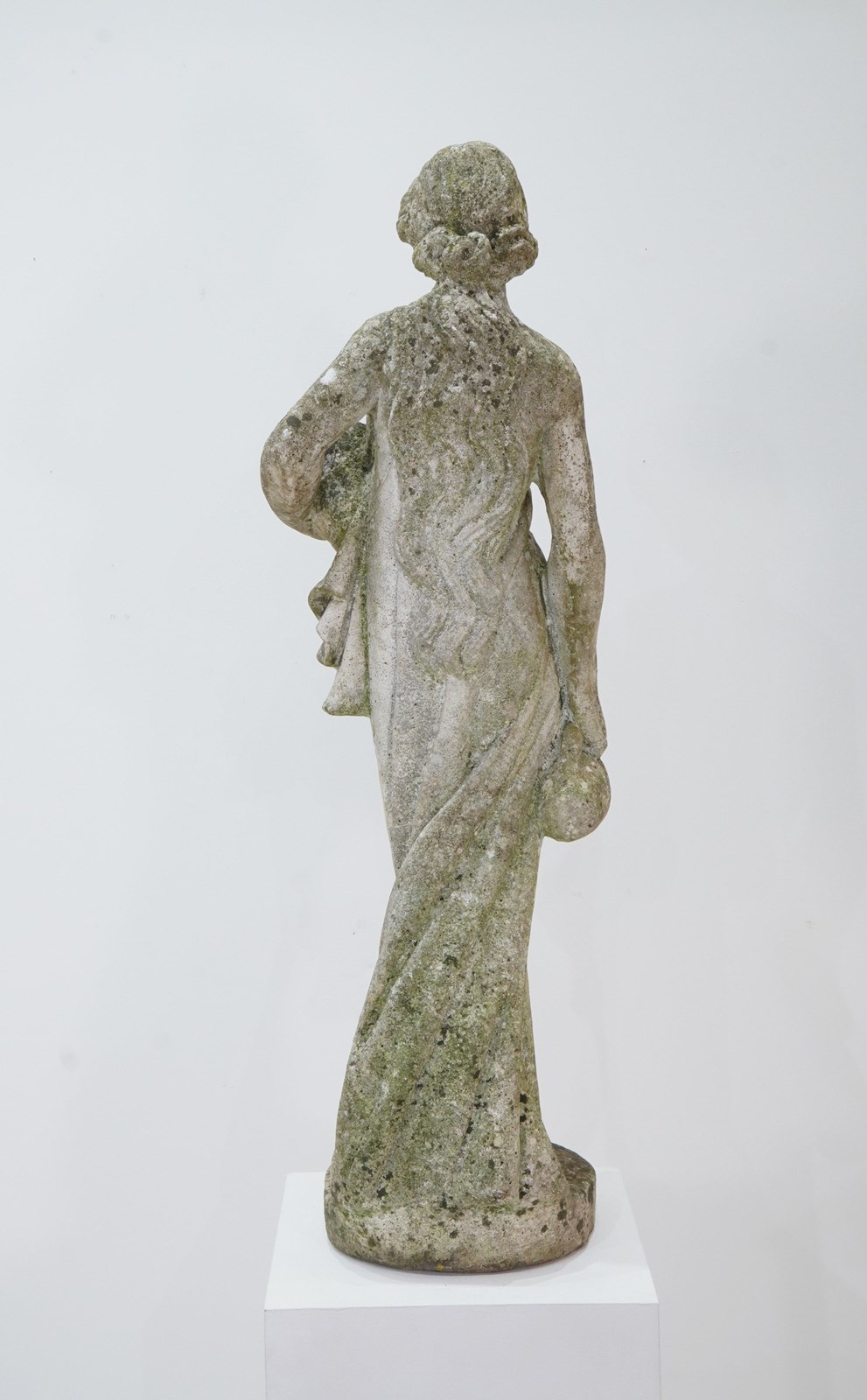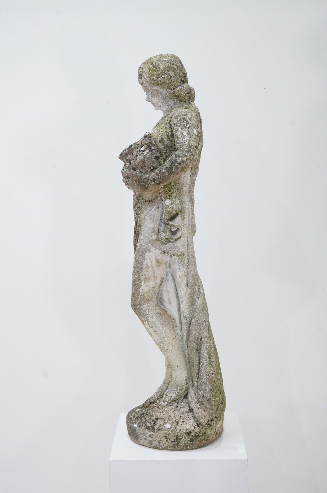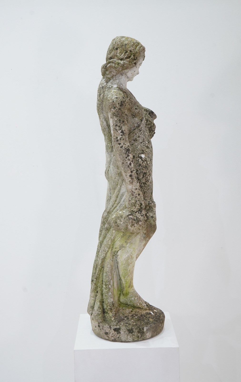 A mid century cast stone female garden statue. This evocative little statue maybe smaller in scale but she holds enormous charm with gentle elegant contours and fine detail. Nicely weathered with patina from years of garden exposure but would be equally suitable inside the home. Super good condition with no fractures.
