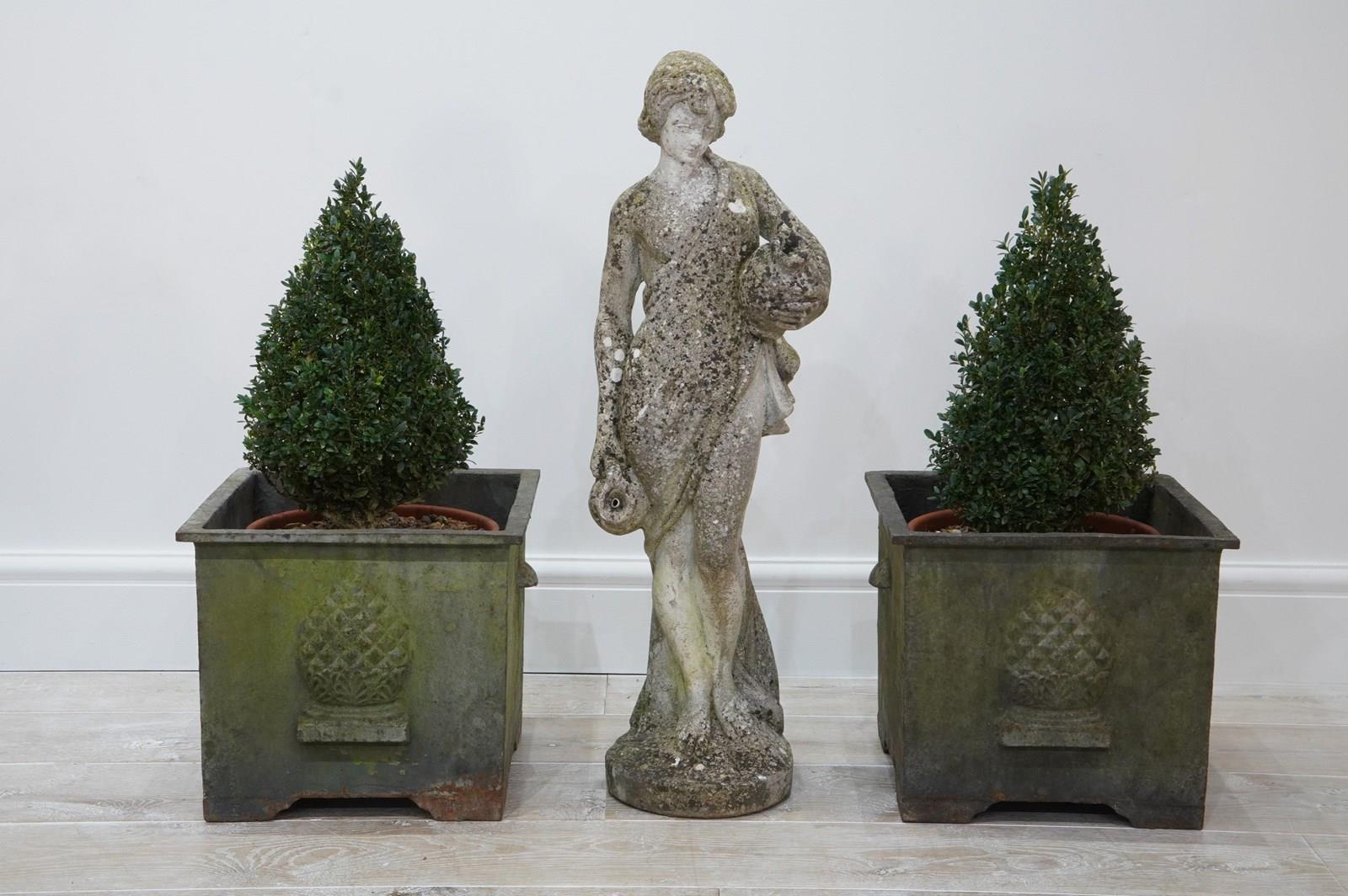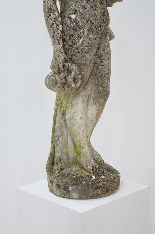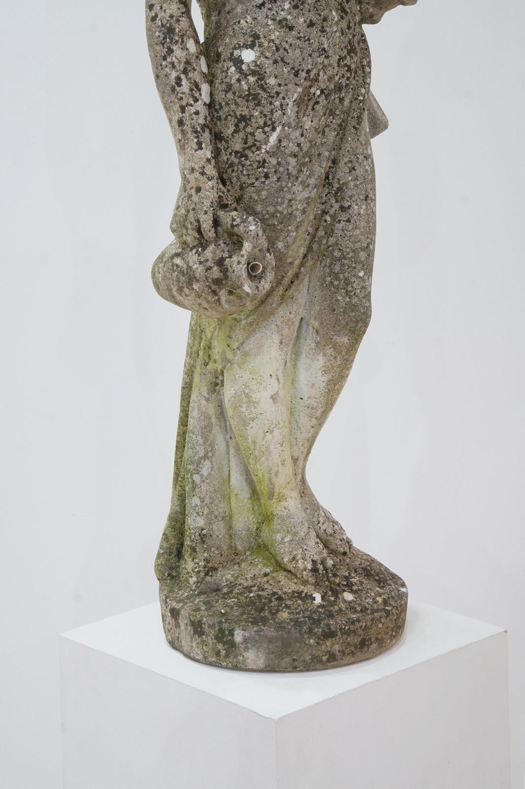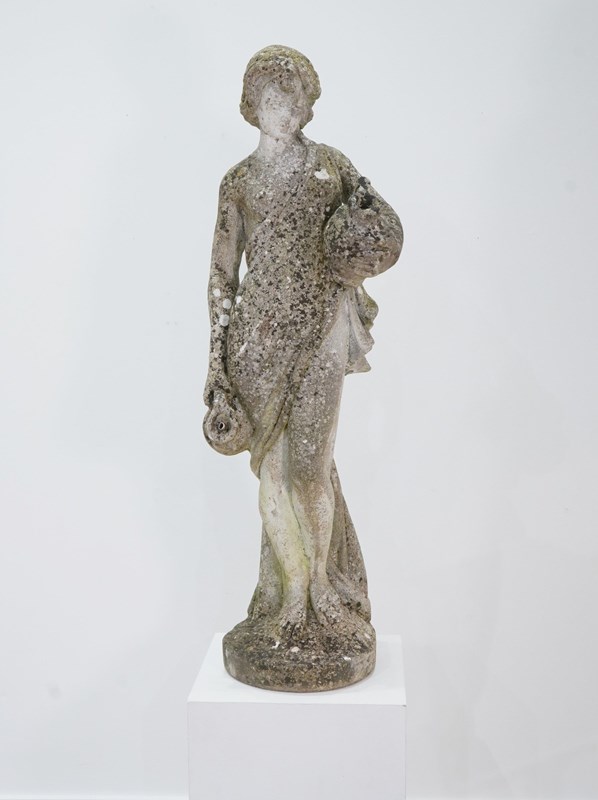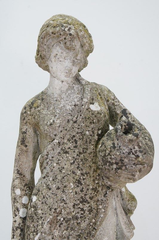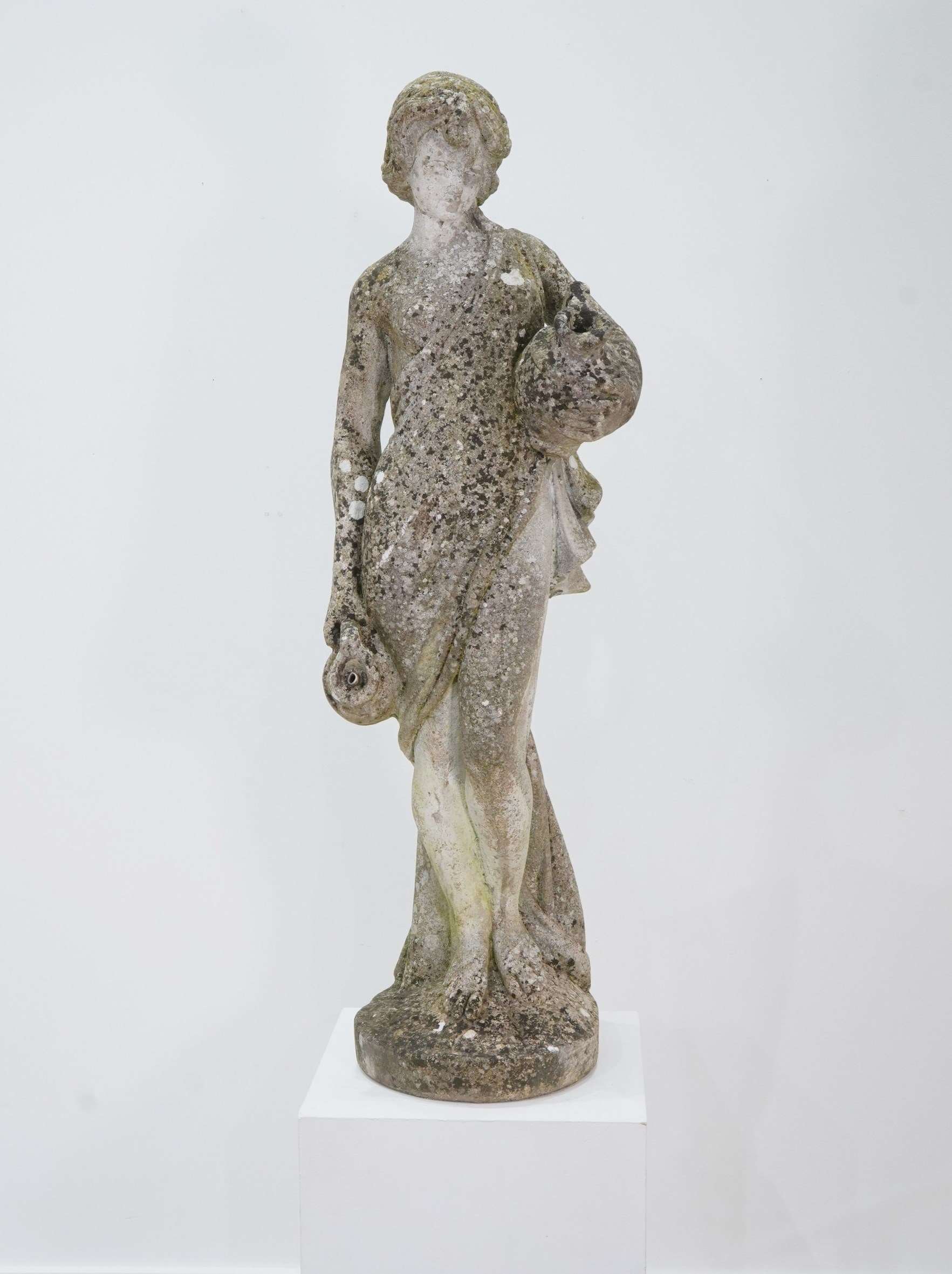 A mid century cast stone female garden statue. This evocative little statue maybe smaller in scale but she holds enormous charm with gentle elegant contours and fine detail. Nicely weathered with patina from years of garden exposure but would be equally suitable inside the home. Super good condition with no fractures.