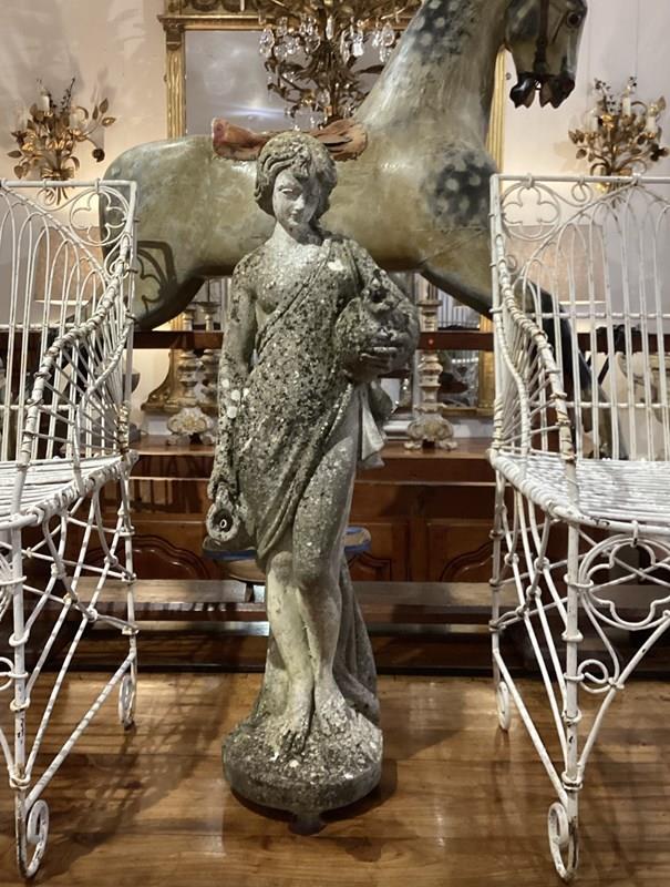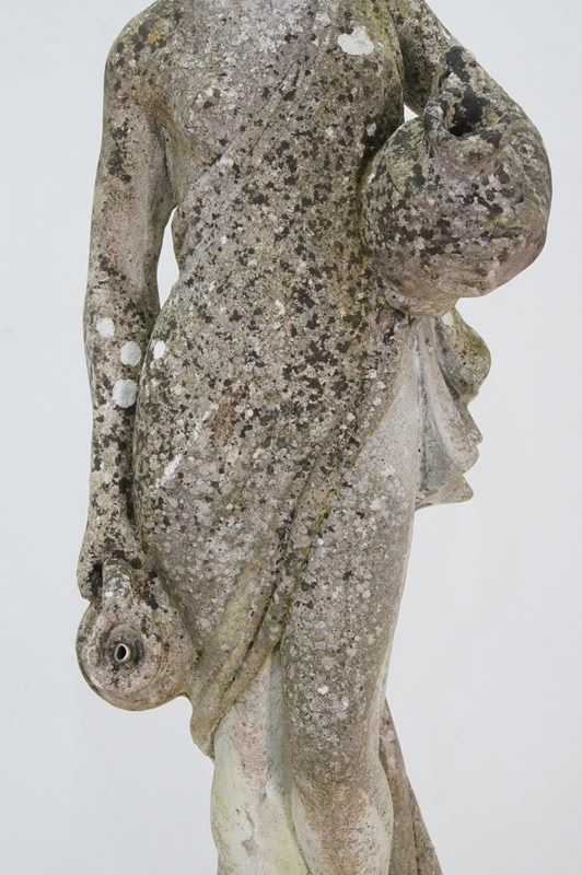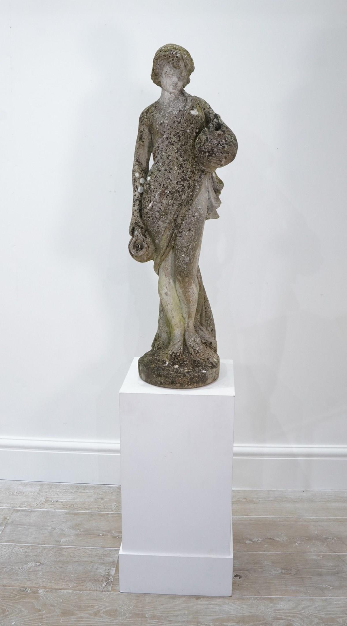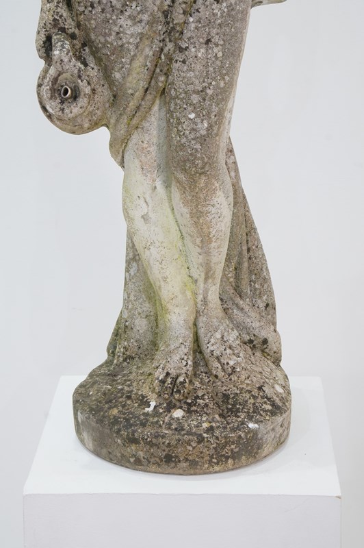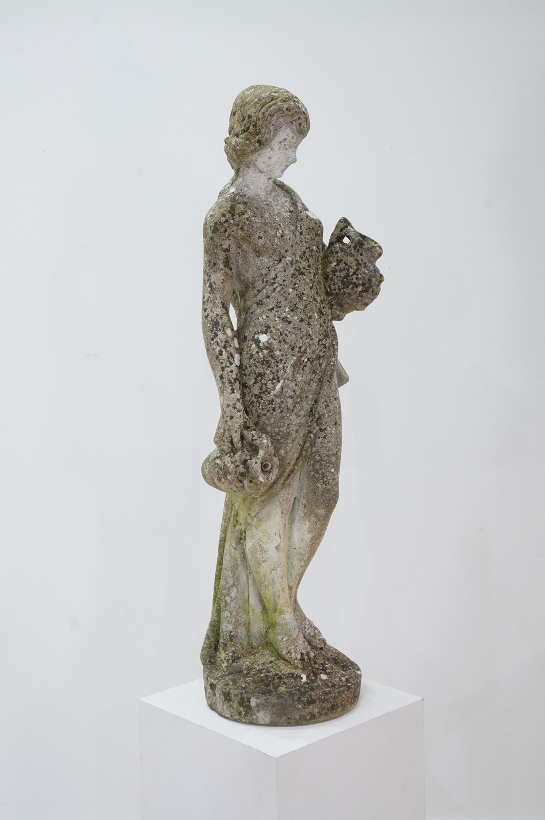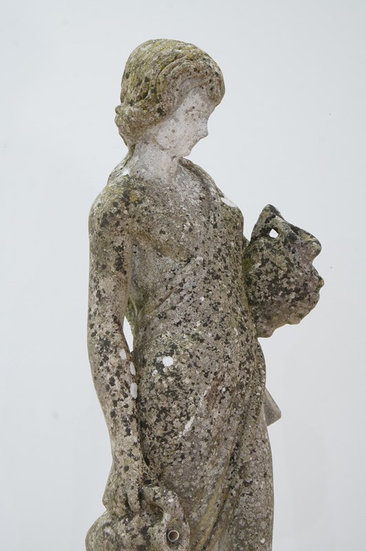 A mid century cast stone female garden statue. This evocative little statue maybe smaller in scale but she holds enormous charm with gentle elegant contours and fine detail. Nicely weathered with patina from years of garden exposure but would be equally suitable inside the home. Super good condition with no fractures.
