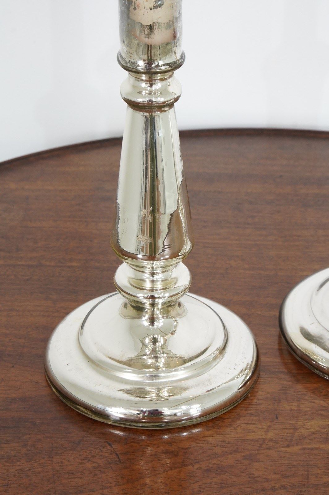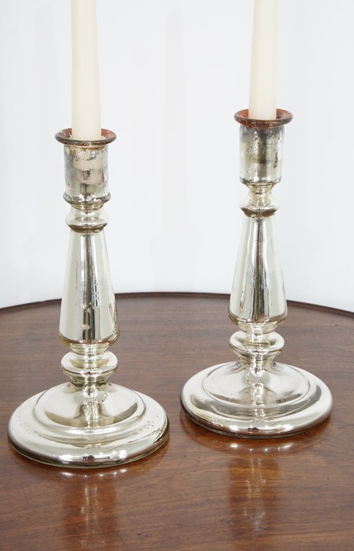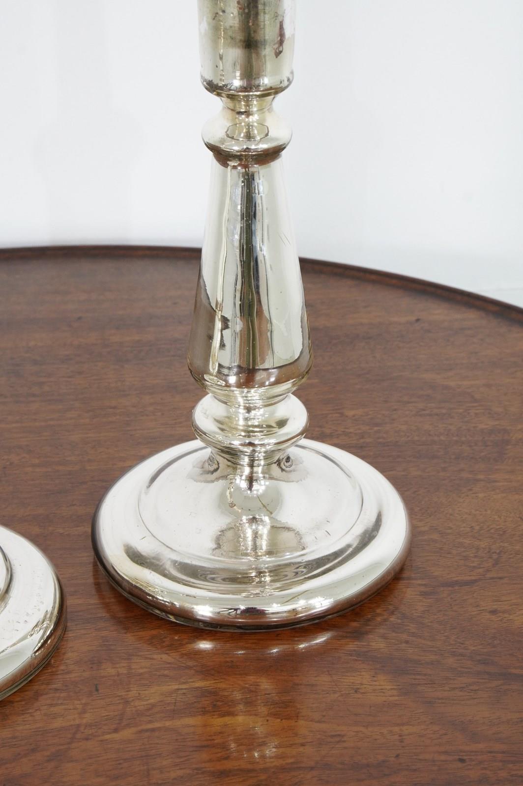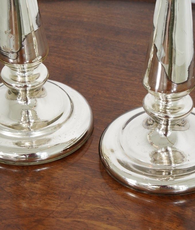 A pair of late 19th century heavy quality mercury glass candlesticks, the necks having contrasting terracotta painted interiors. Superb original condition. Circa 1890.