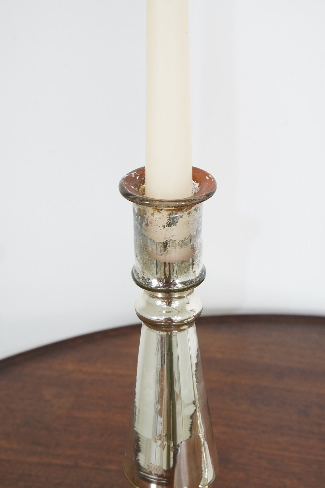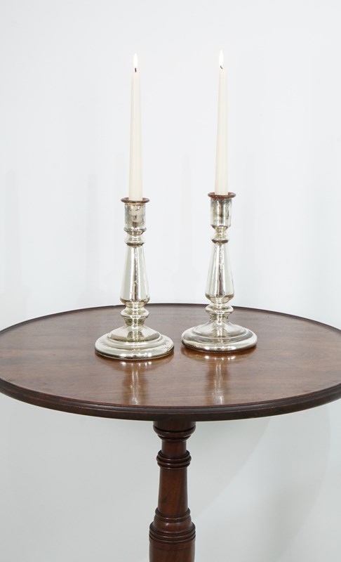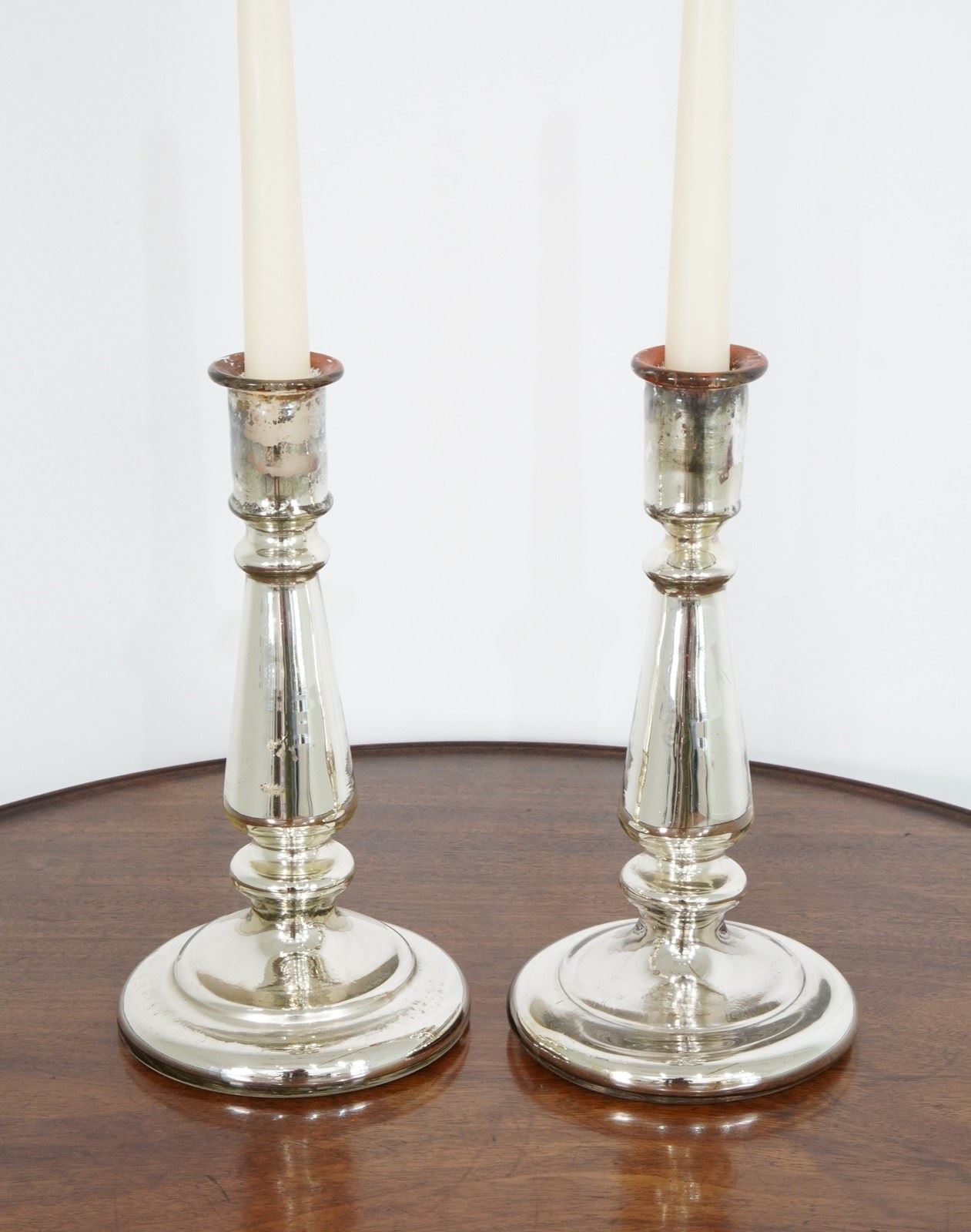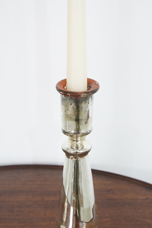 A pair of late 19th century heavy quality mercury glass candlesticks, the necks having contrasting terracotta painted interiors. Superb original condition. Circa 1890.