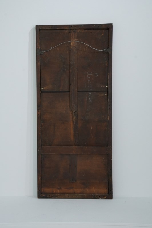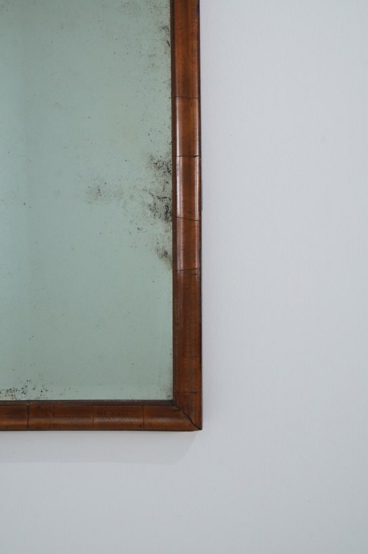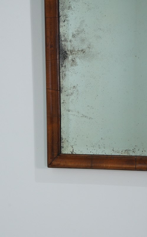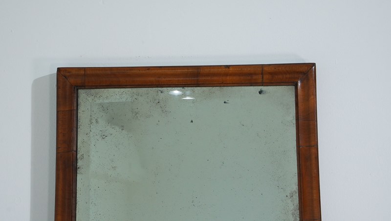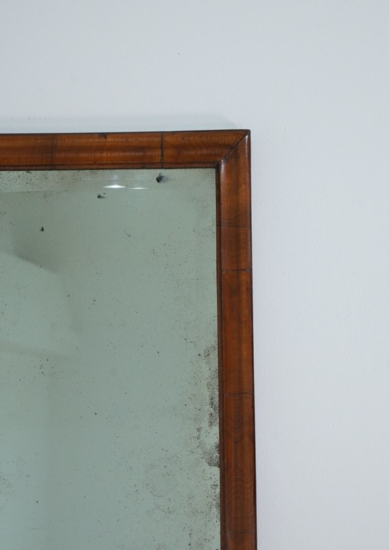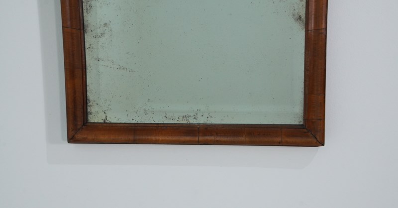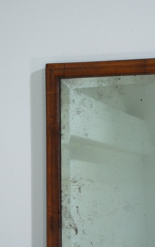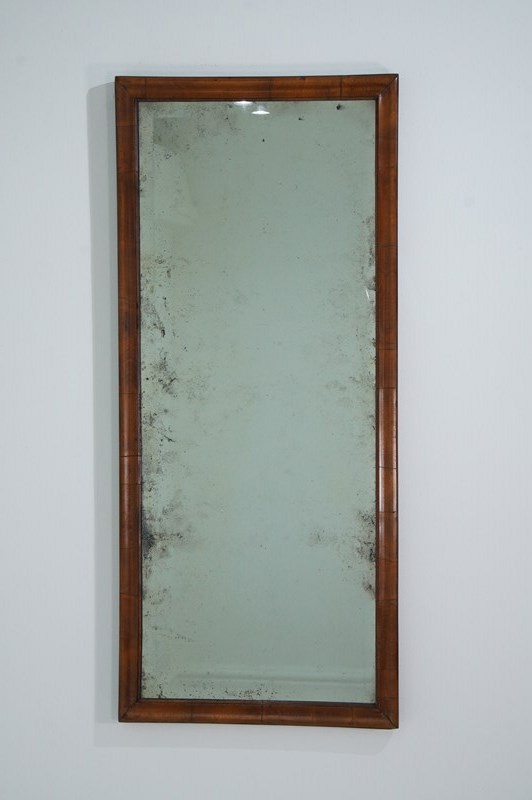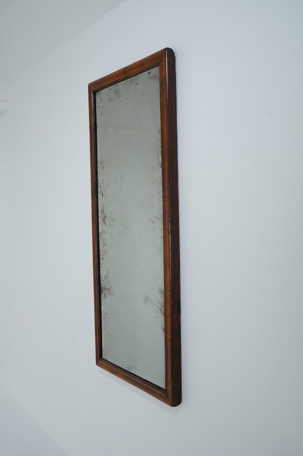 An early 19th century alcove/ wall mirror of narrower proportions. The narrow polished walnut surround neatly frames the original bevelled period glass. Some foxing only enhancing its character and history.