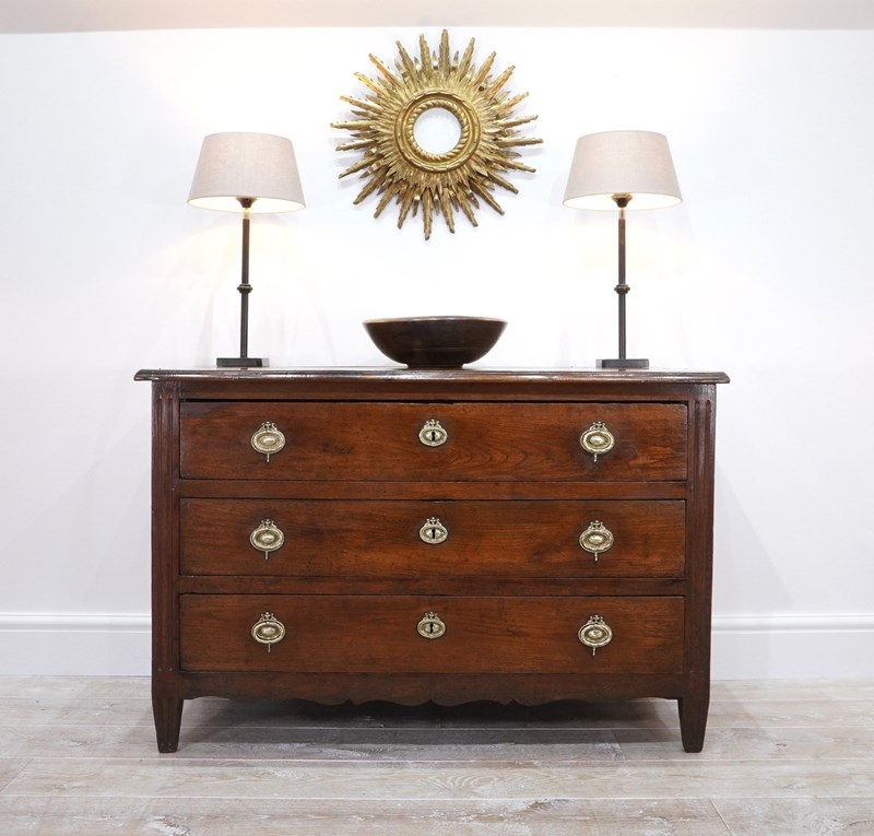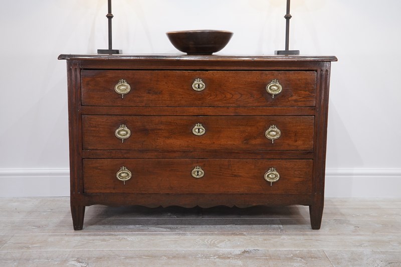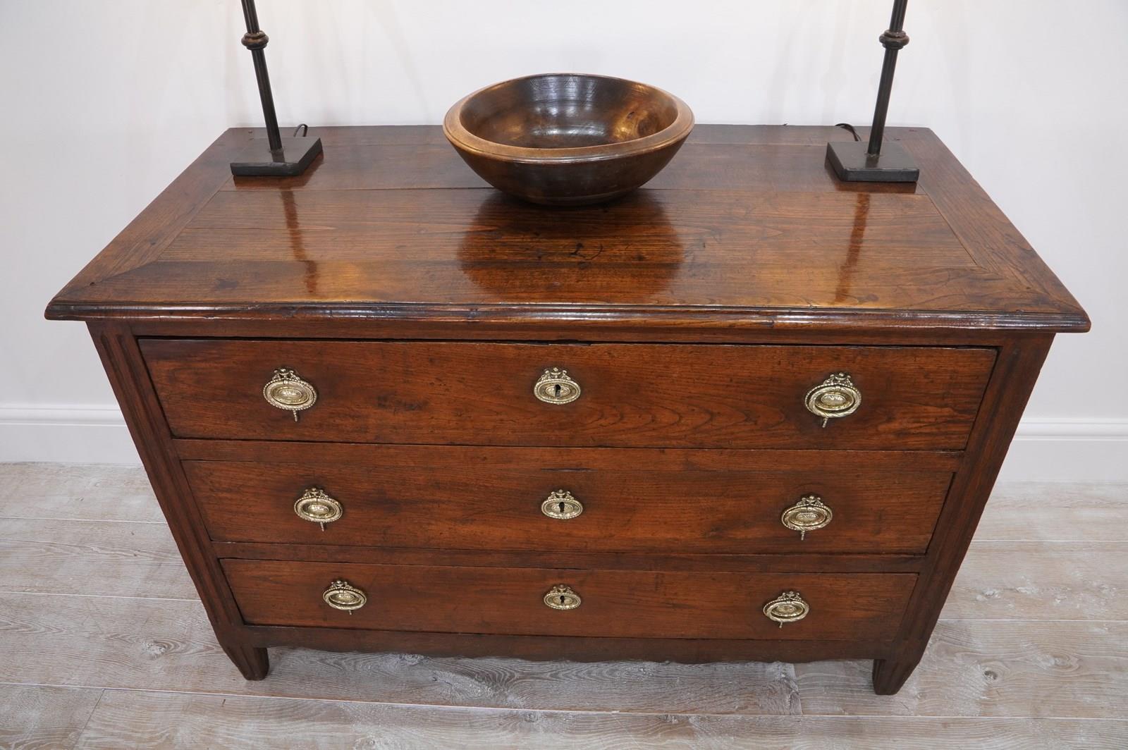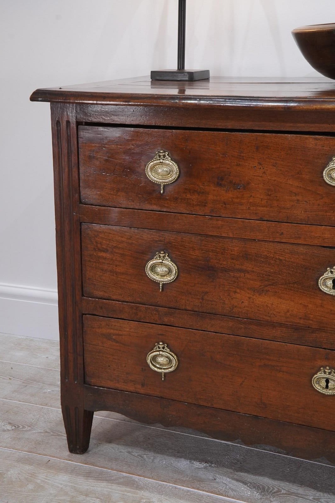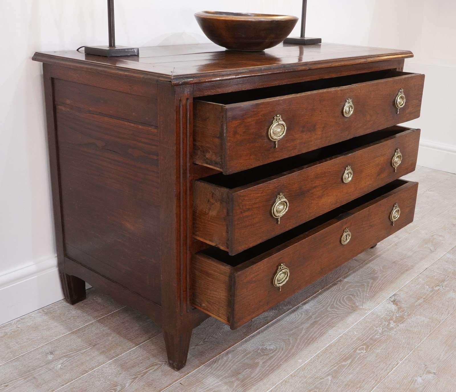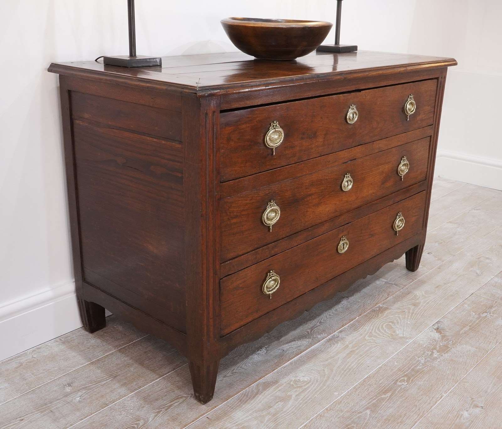 An early 19th century French commode chest of three drawers. This substantial chest offers three long well fitting drawers beneath a solid chestnut top. The drawers boast the prettiest original handles with matching escutcheons all housed within a solid chestnut carcass raised on low feet united by a decorative shaped frieze beneath. Constructed nearly two centuries ago developing the most glorious colour and deep patina in this time. French chestnut commode circa 1820.
