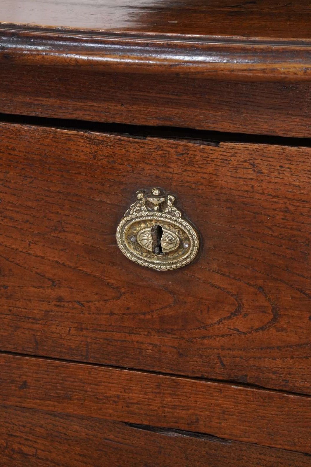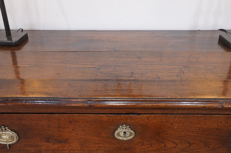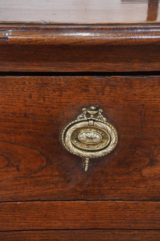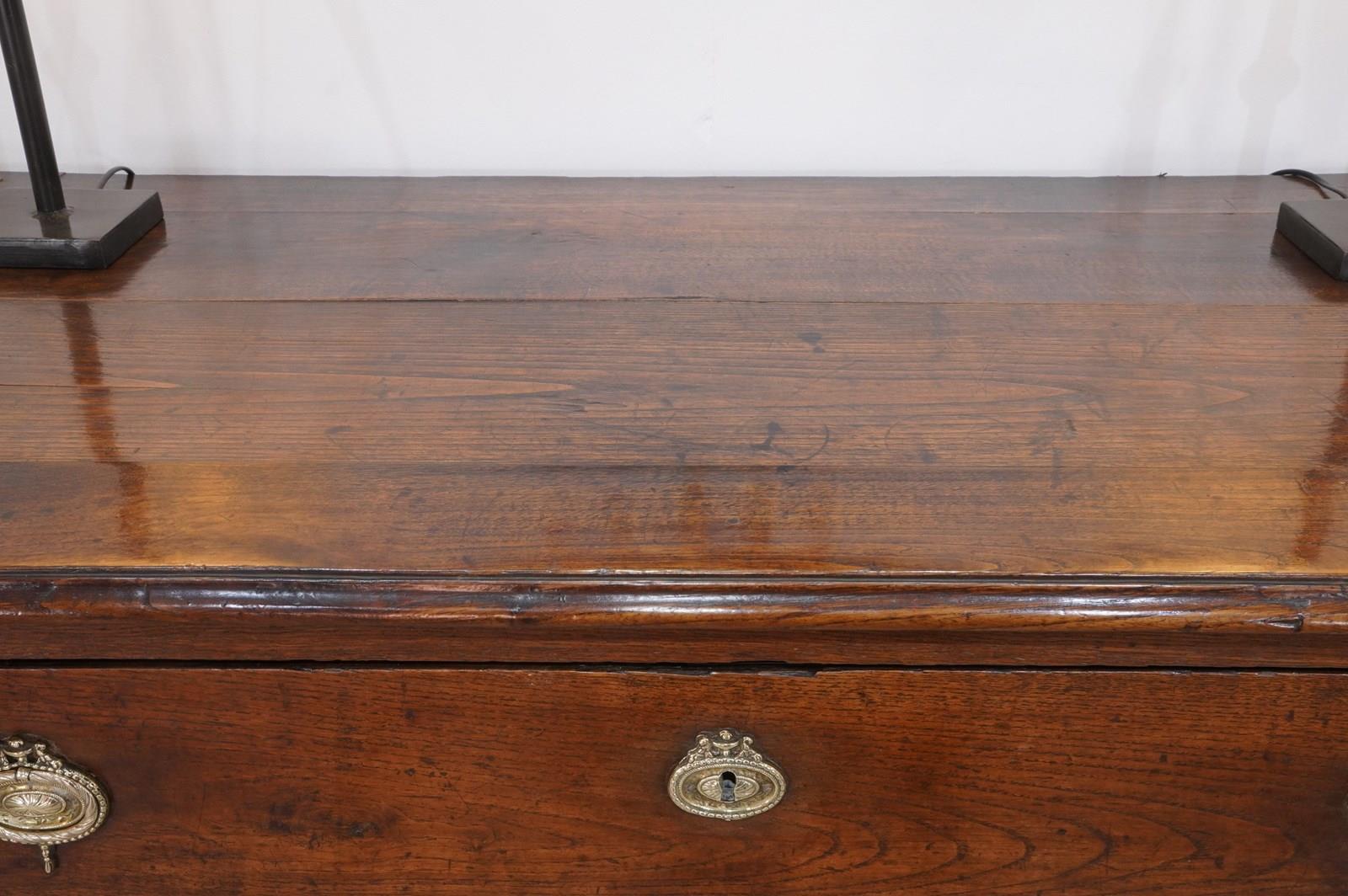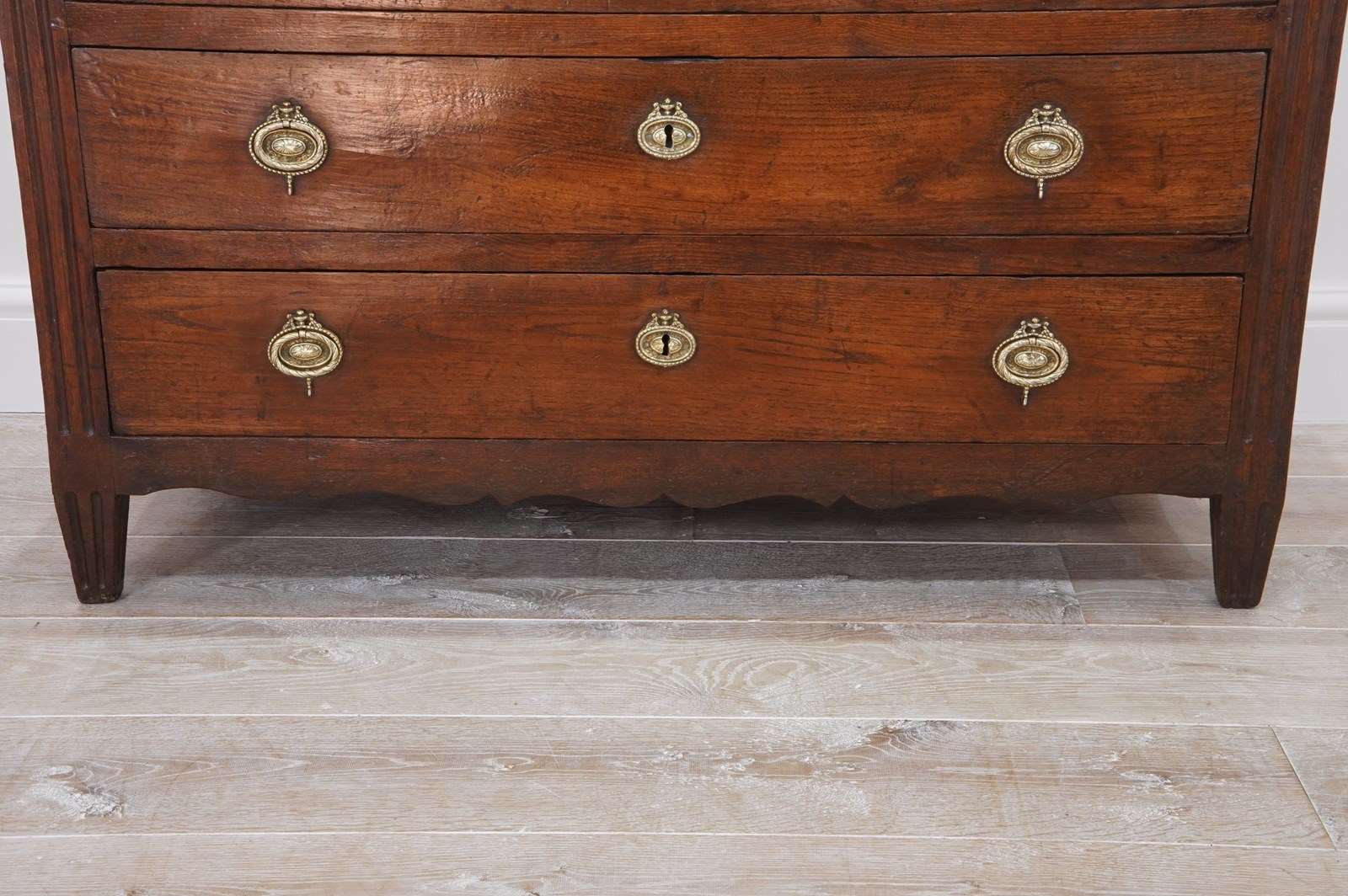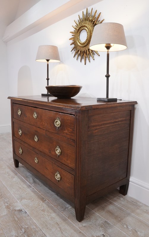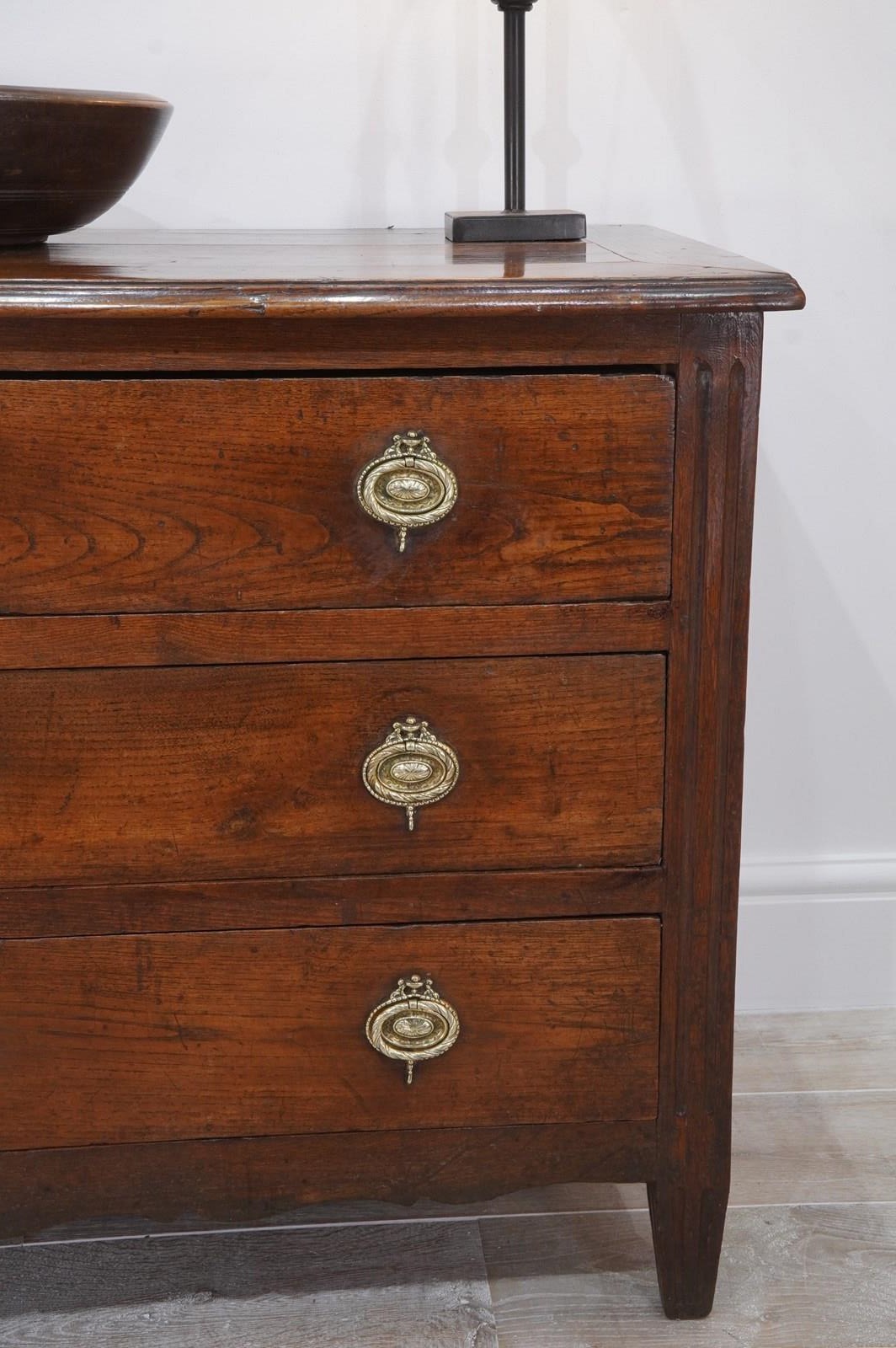An early 19th century French commode chest of three drawers. This substantial chest offers three long well fitting drawers beneath a solid chestnut top. The drawers boast the prettiest original handles with matching escutcheons all housed within a solid chestnut carcass raised on low feet united by a decorative shaped frieze beneath. Constructed nearly two centuries ago developing the most glorious colour and deep patina in this time. French chestnut commode circa 1820.