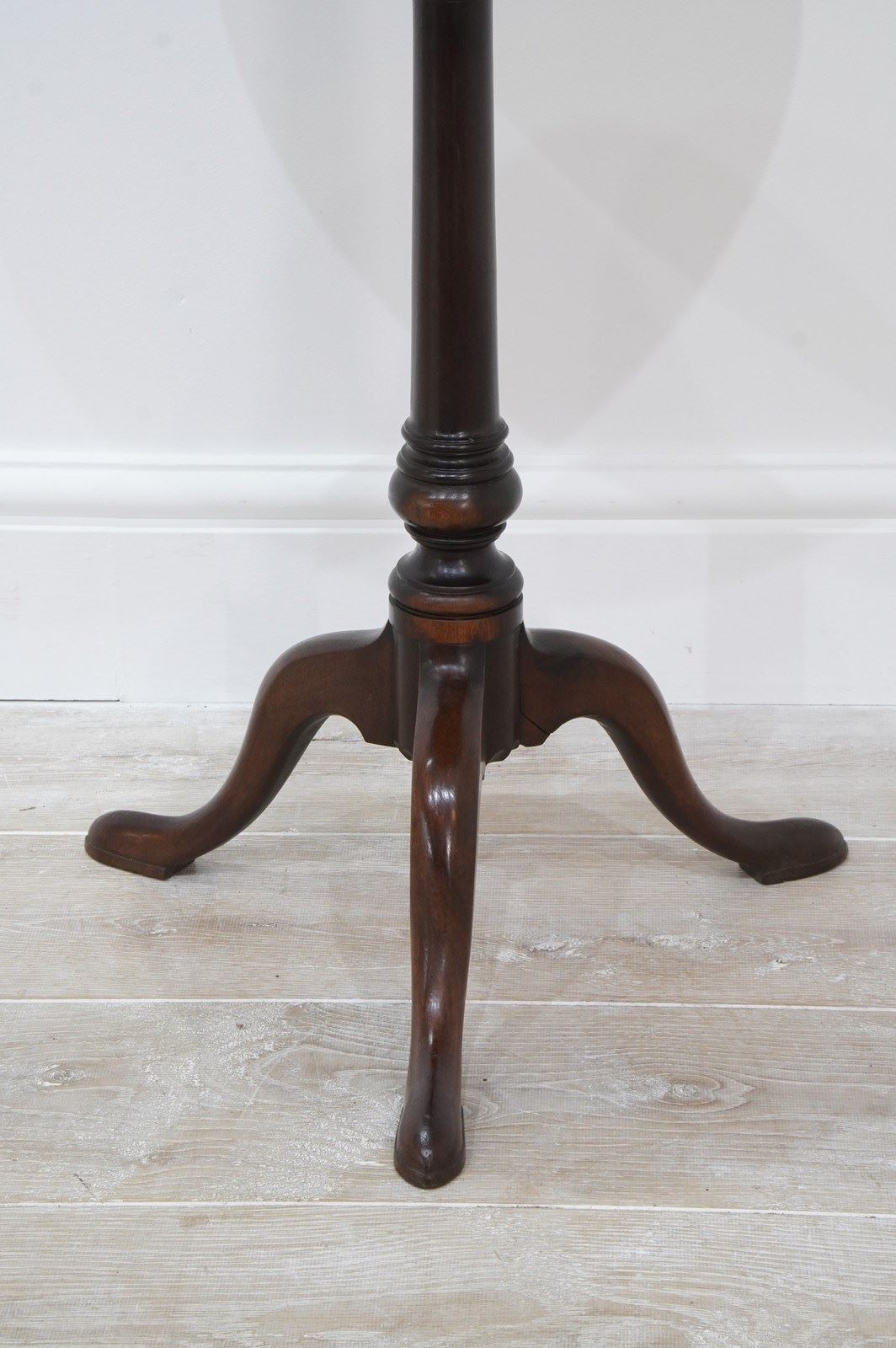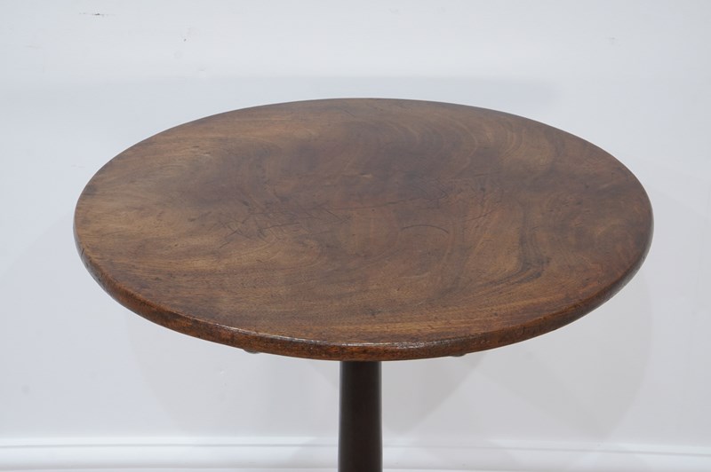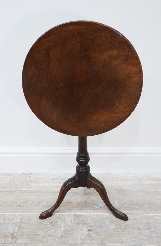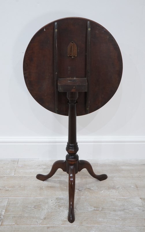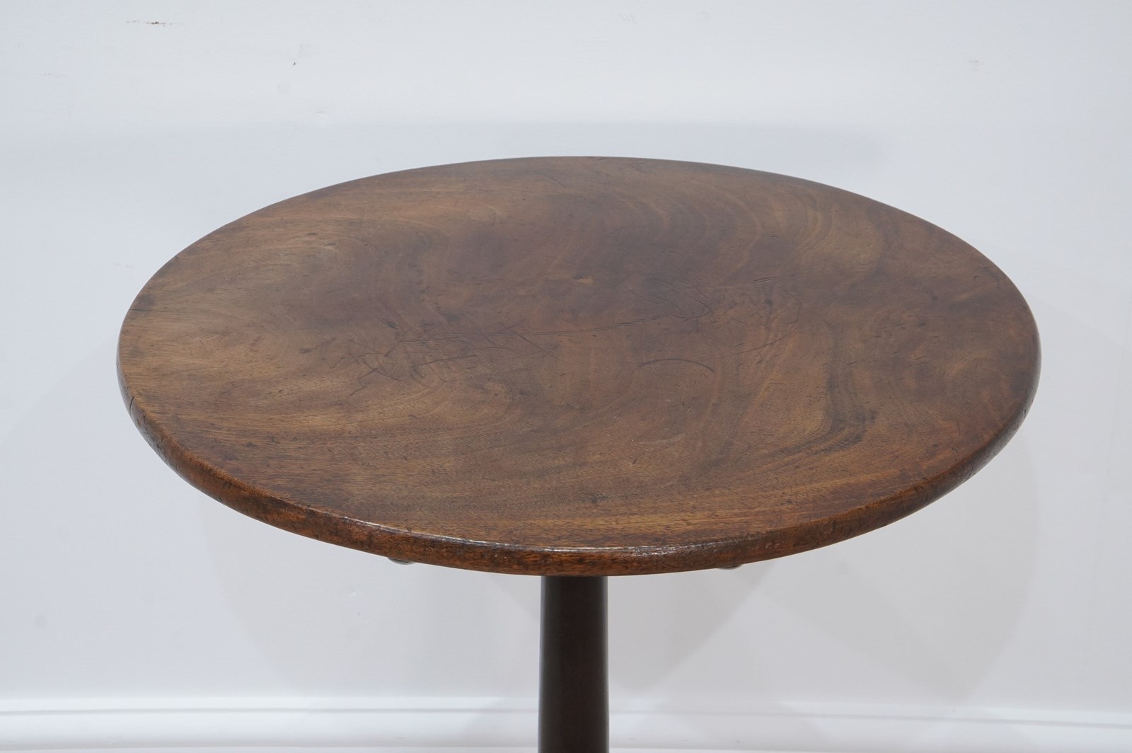 A mid 19th century mahogany tilt top table. The circular mahogany top to this pretty table is secured by a fastening catch to the underside which when released allows it to stand in the upright position. This is supported by an elegant turned mahogany stem upon a triform base. It has developed the most gorgeous colour over the years together with some historical surface marks only enhancing its history and character. Solid mahogany English tripod occasional table. Circa 1850.