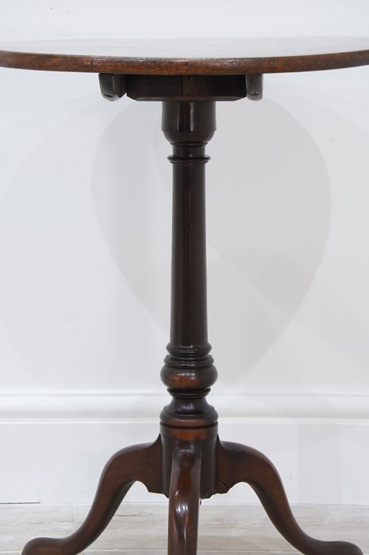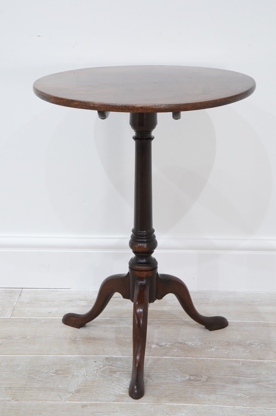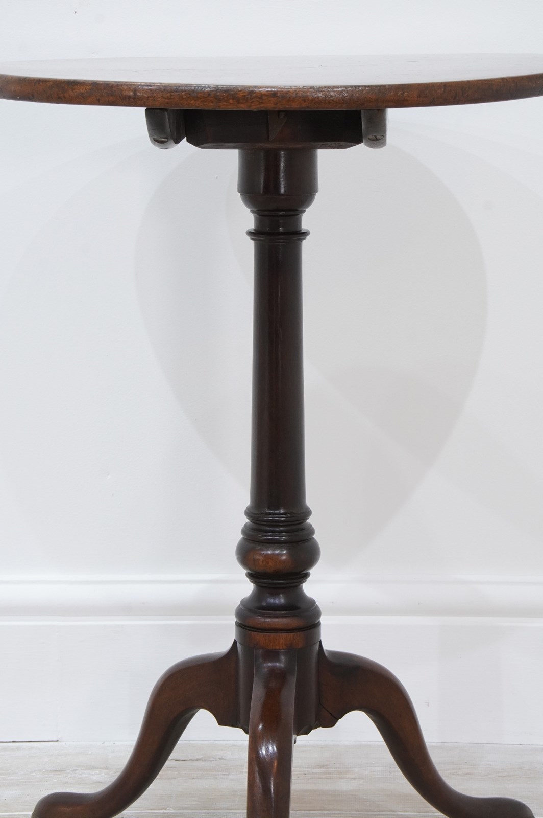 A mid 19th century mahogany tilt top table. The circular mahogany top to this pretty table is secured by a fastening catch to the underside which when released allows it to stand in the upright position. This is supported by an elegant turned mahogany stem upon a triform base. It has developed the most gorgeous colour over the years together with some historical surface marks only enhancing its history and character. Solid mahogany English tripod occasional table. Circa 1850.