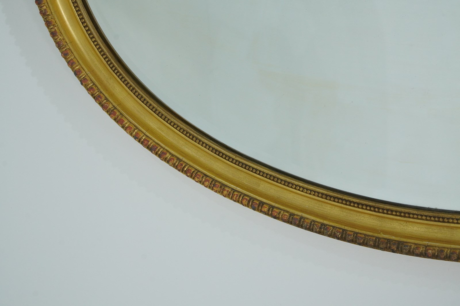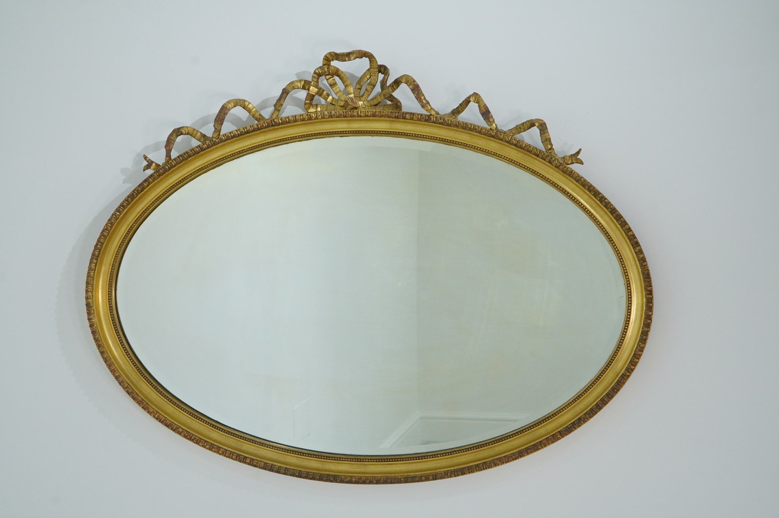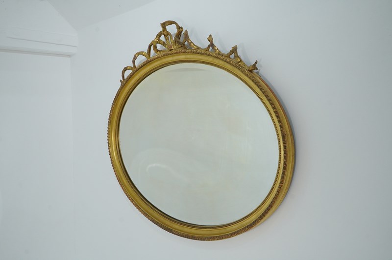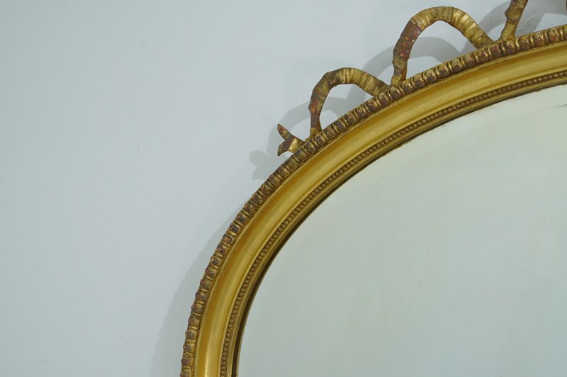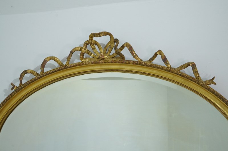 A late 19th century wall mirror in the Adam style. The top to this elegant landscape mirror is complimented by a lavish ribbon tied bow. The gilding has mellowed and faded over the past century with just a little historical wear with no damage or losses to the gesso decoration. The original bevelled mirror plate is presented in supreme flawless condition. Original wooden back board. Landscape wall mirror. England circa 1890.