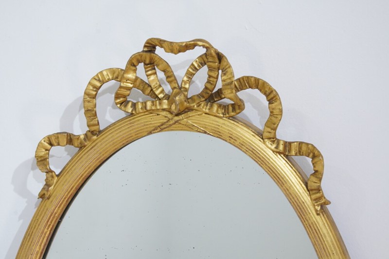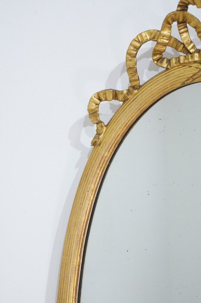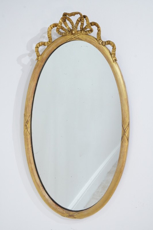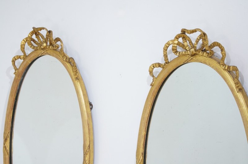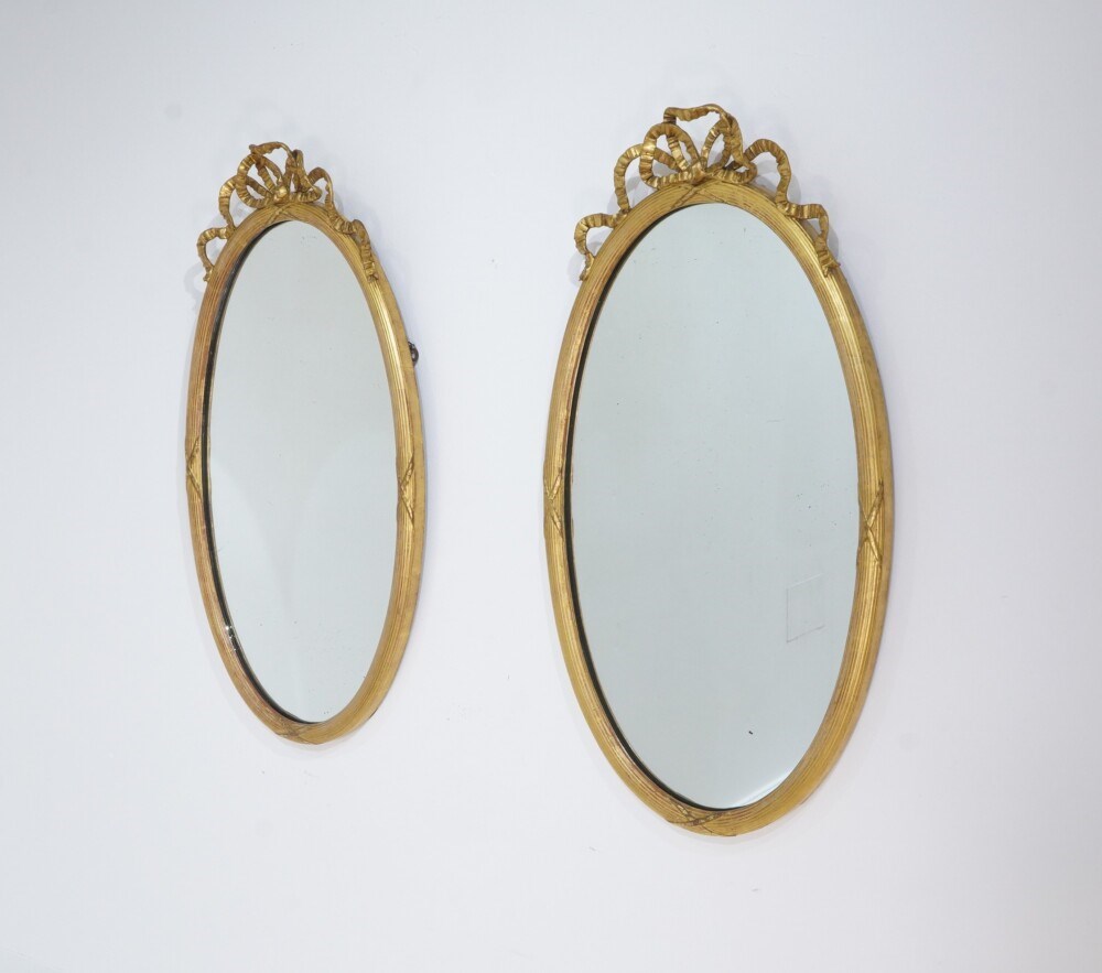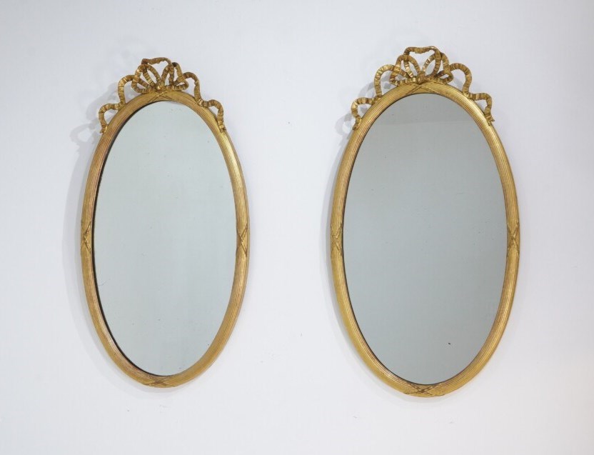 A stylish pair of English oval wall mirrors. The elegant frames to these pretty mirrors have a neat reeded design with evenly spaced cross detail . The tops are surmounted with ribbon tied gilded bows.