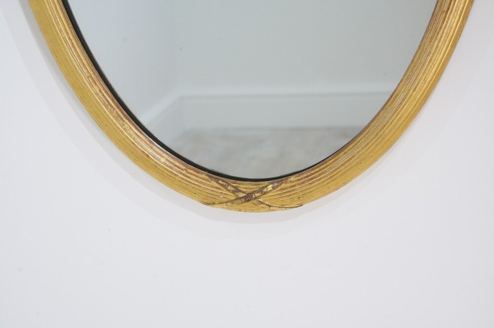 Superb condition. Original gilded surface. The original mirror plates do have some minor faint blemishes only enhancing their history and charm. English oval wall mirrors circa 1900.
