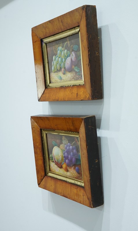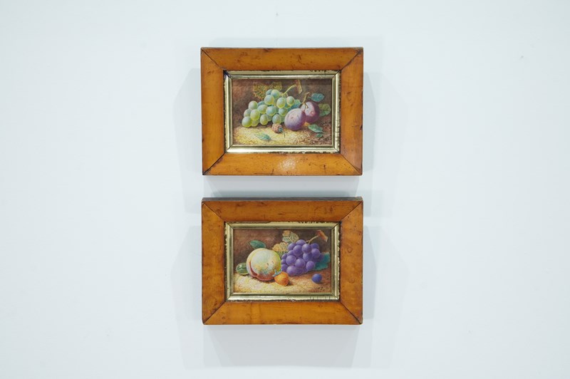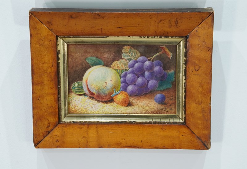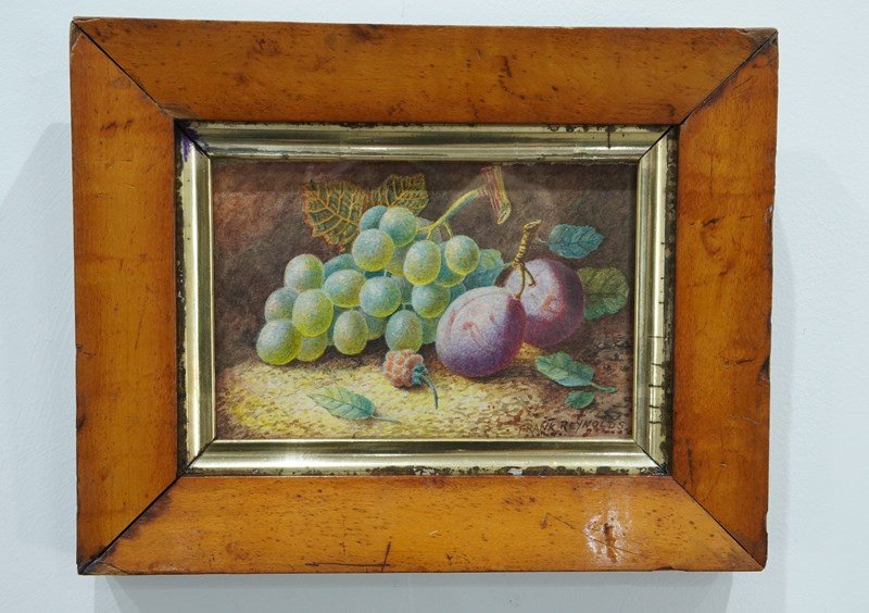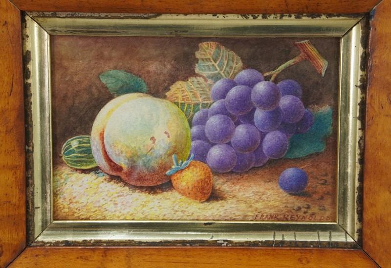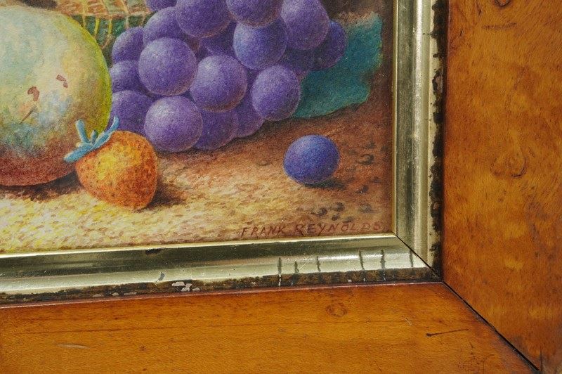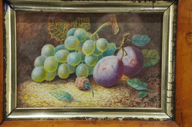 A divine little pair of English still life watercolours. Beautifully hand painted in the late 19th /early 20th century depicting various fruits in soft muted colours. Set within associated antique bird’s eye maple frames. The artists name Frank Reynolds can be seen in the bottom right hand corner of each watercolour.