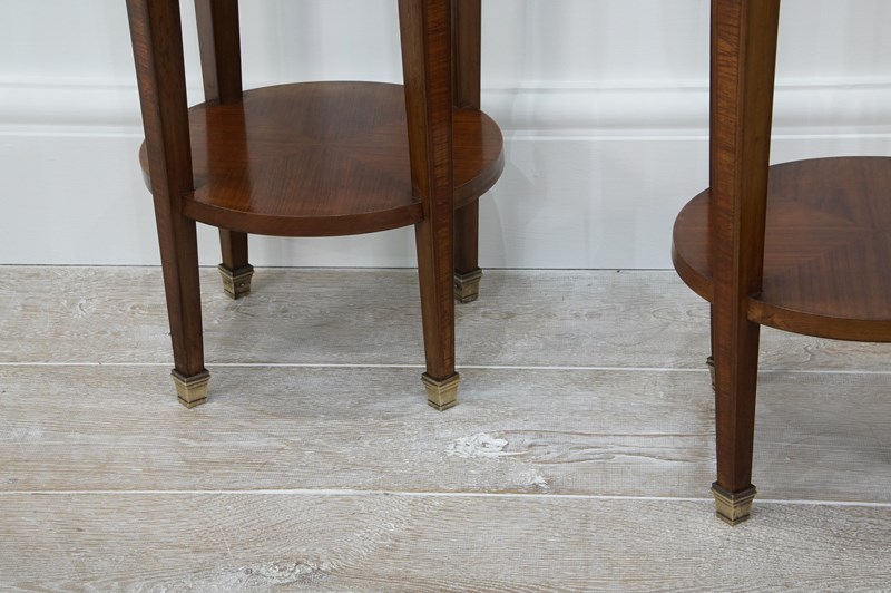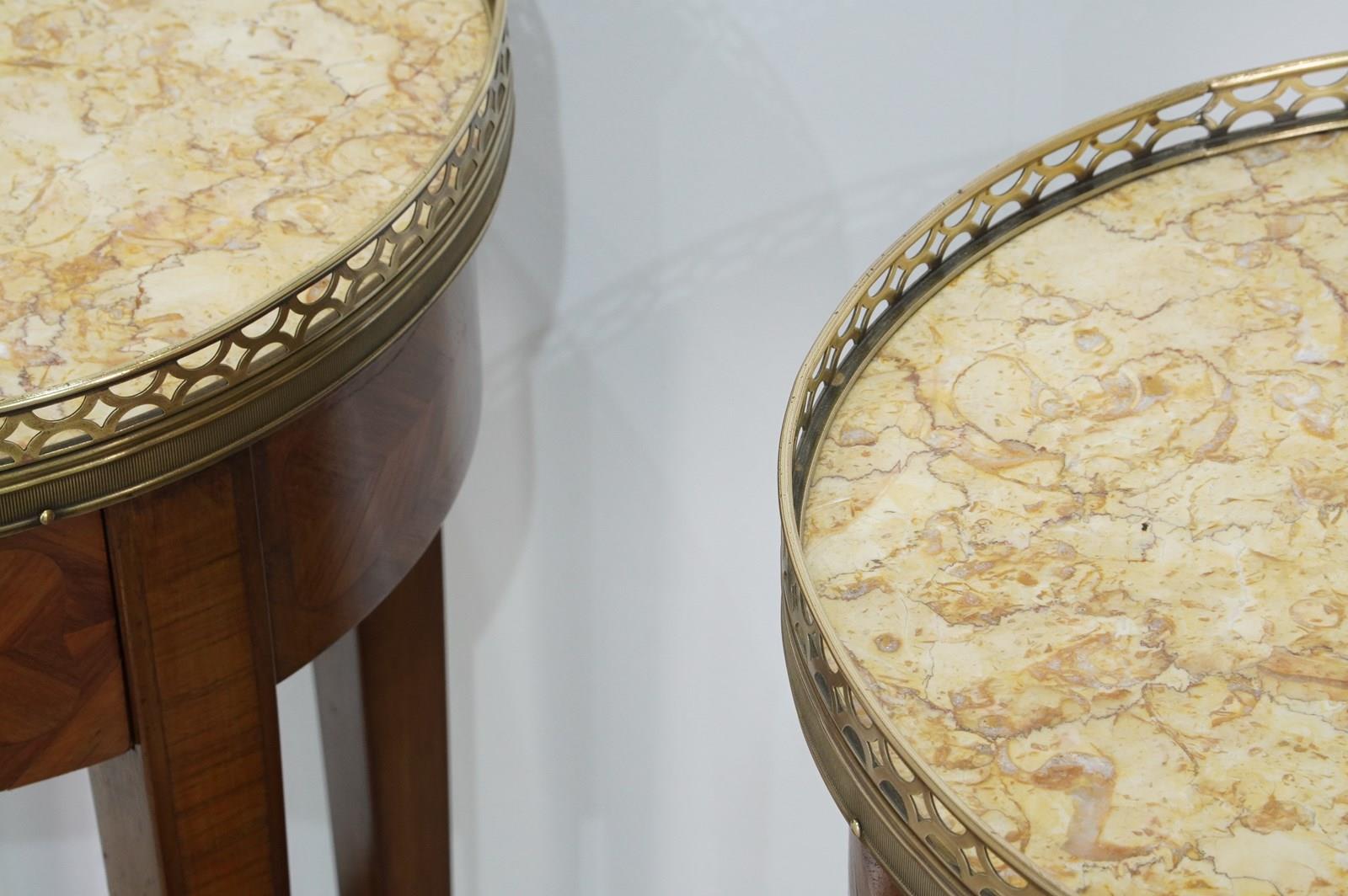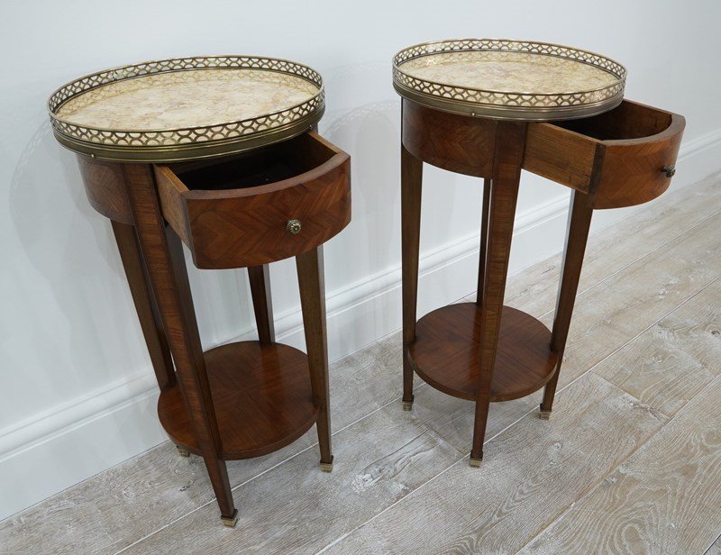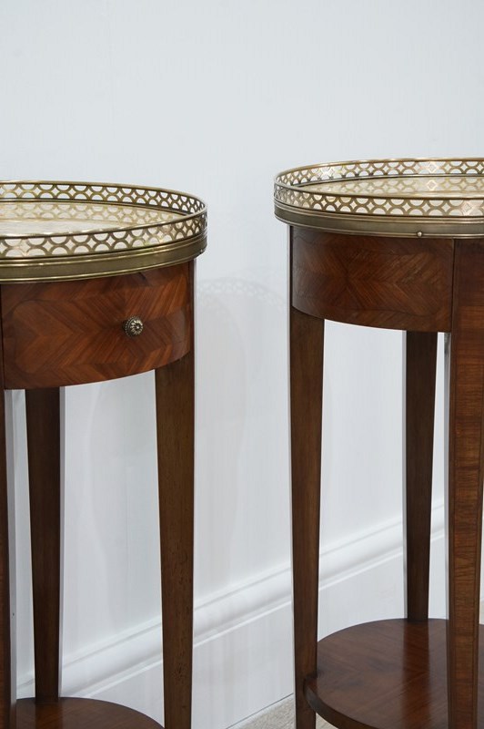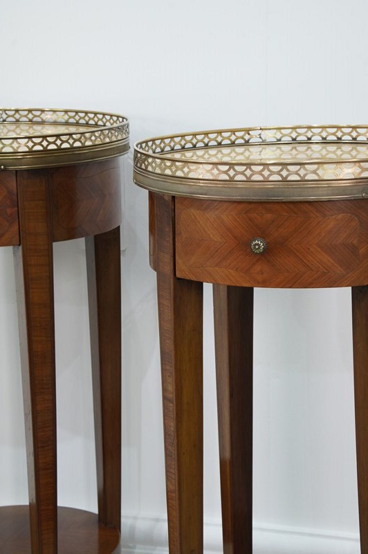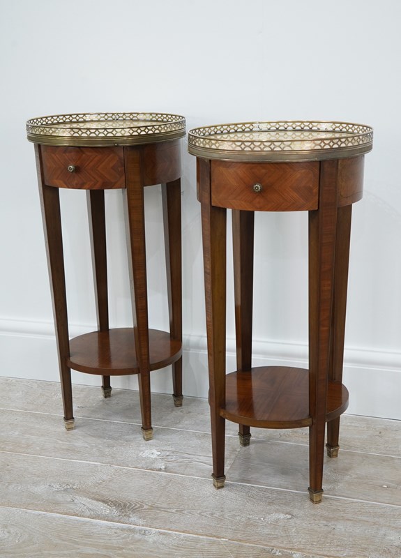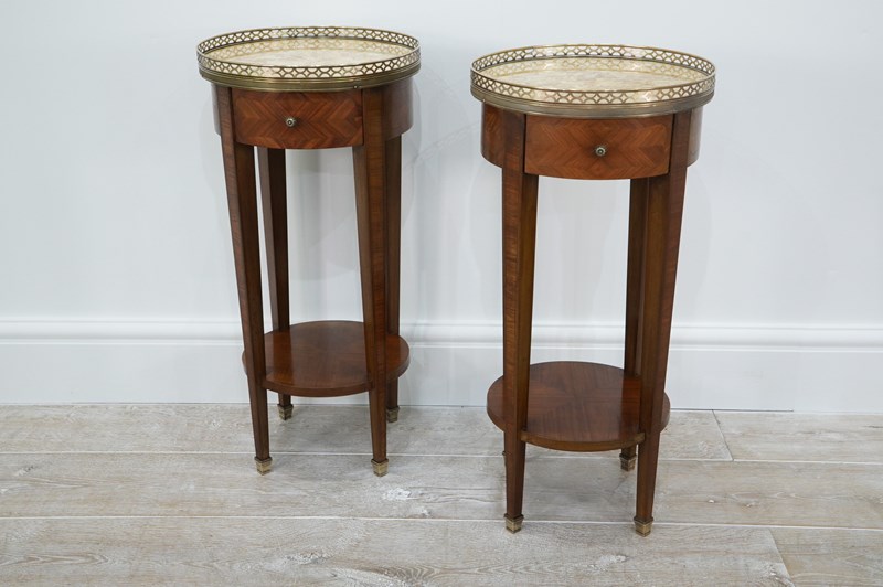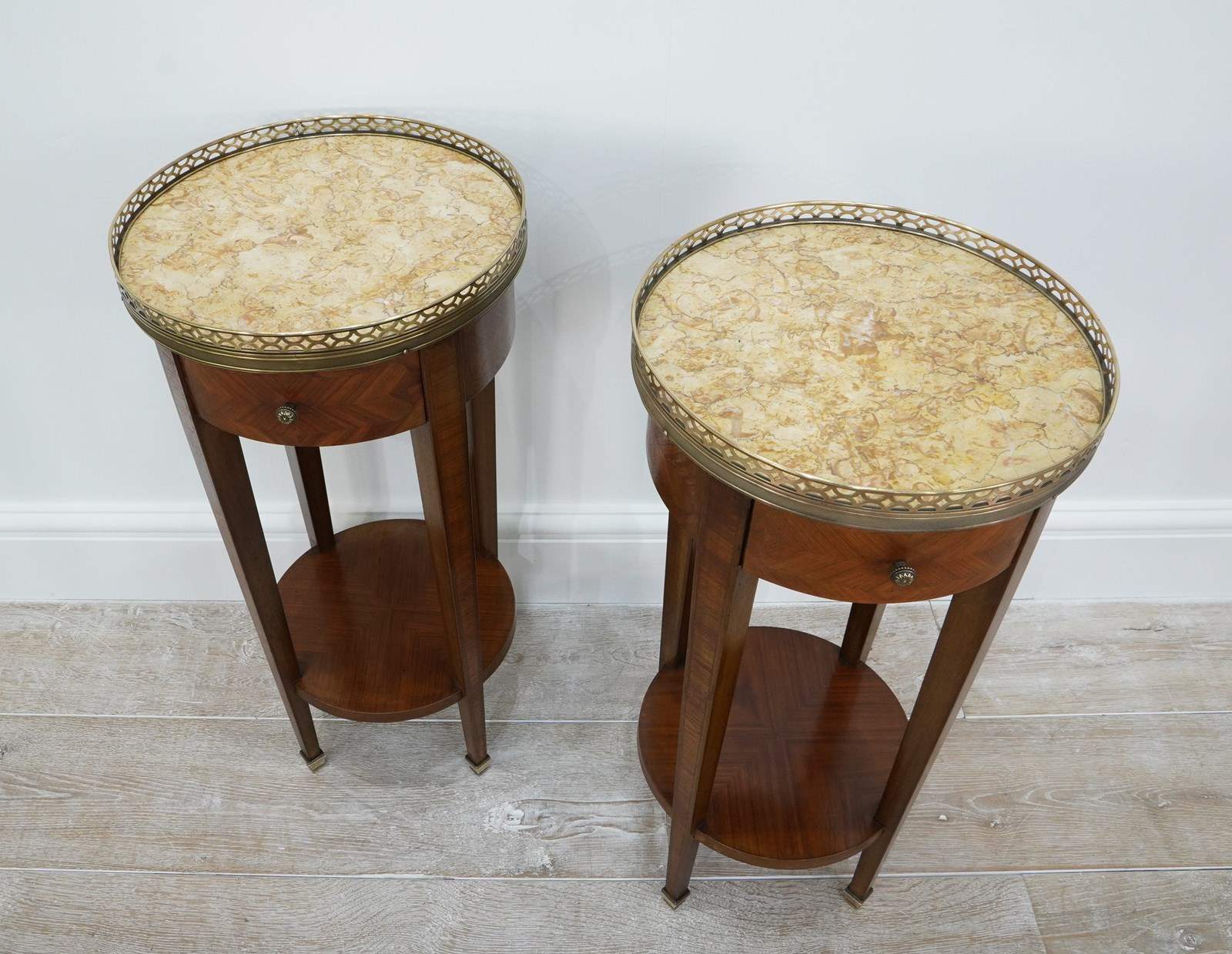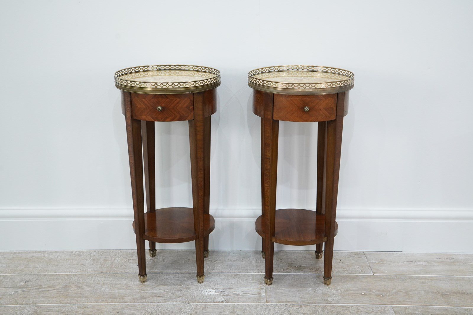A superb pair of late 19th early 20th century circular kingwood side tables / night stands. The circular marble tops feature different shades of pink and cream with random veining. They sit within a patinated pierced work gallery. The deep apron below has a single drawer housed within. Standing on four elegant tapering legs with patinated brass caps, united at the base by a raised circular shelf. These pretty bedside nightstands boast a neat chevron design within the Kingwood veneers. Lovely honey colour with deep patina. France circa 1900.