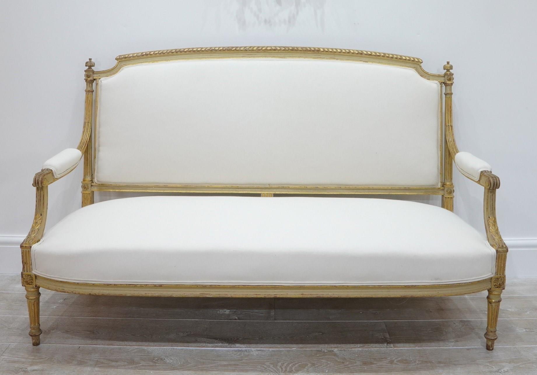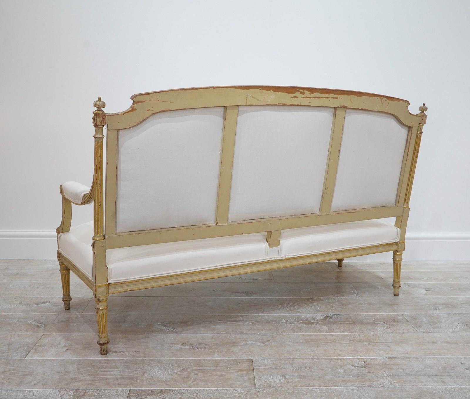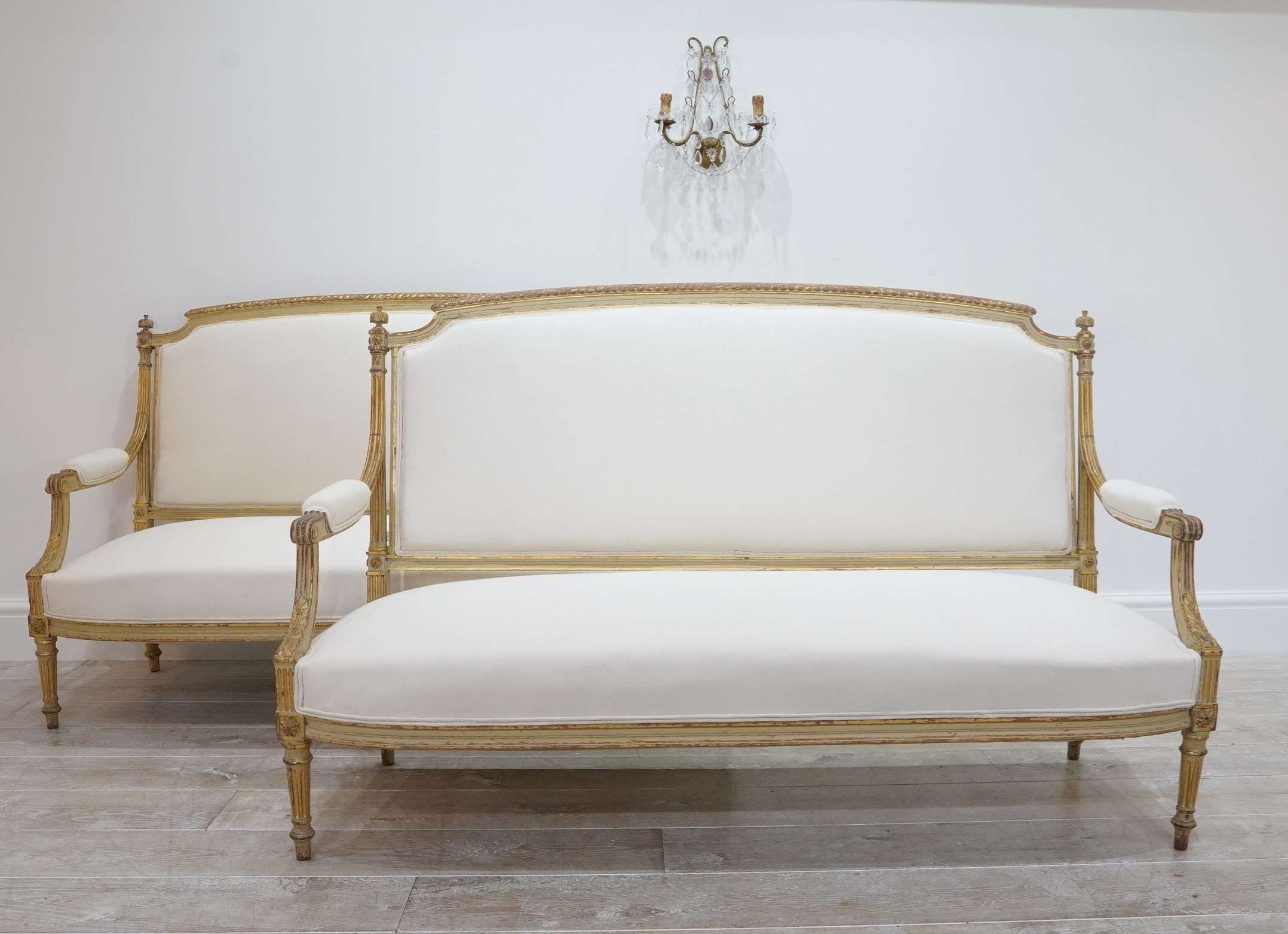 A decorative pair of 19th century French sofas in original paint. The show wood frames to these beautiful sofas still boast the original painted surface together with some small areas highlighted in fine gold leaf.