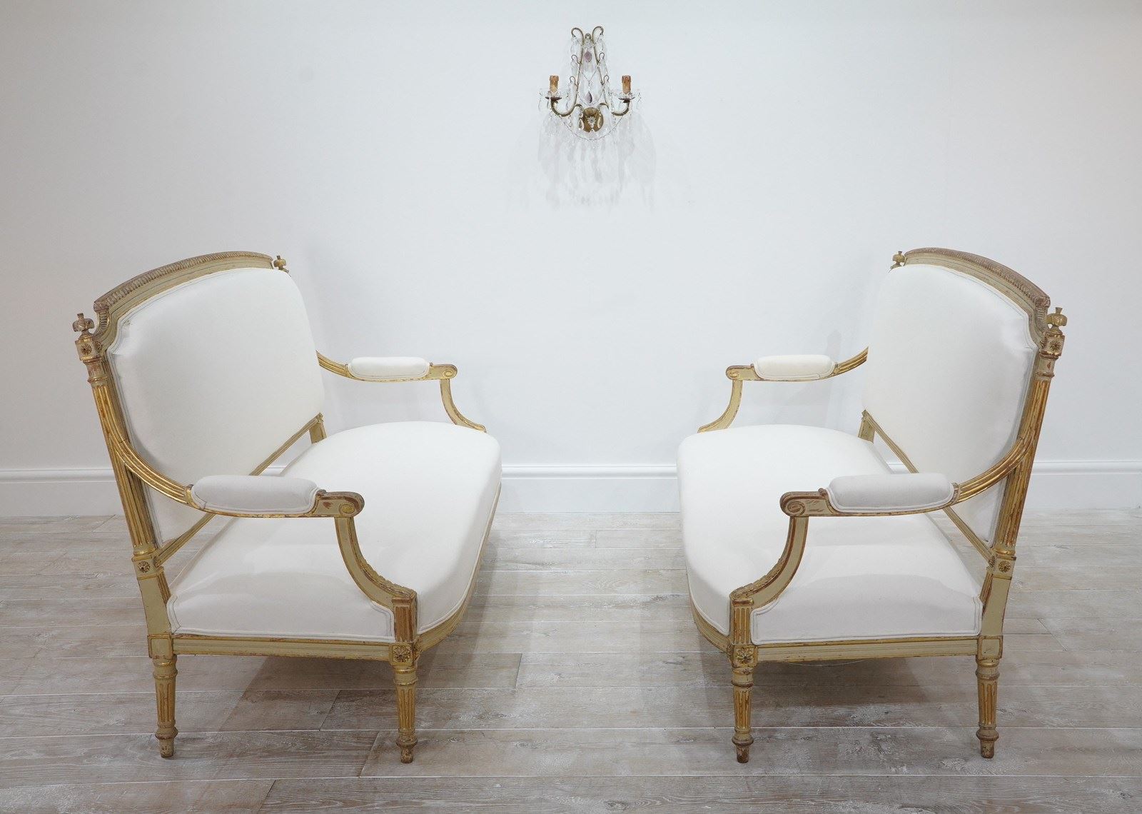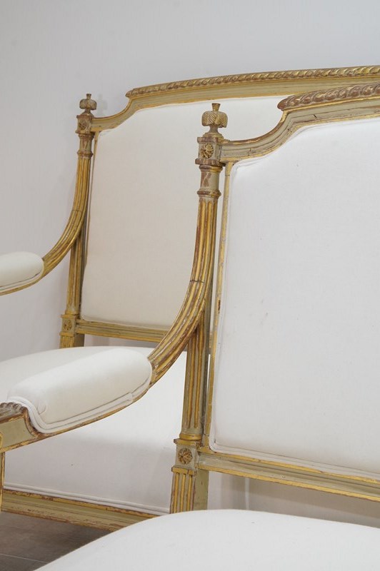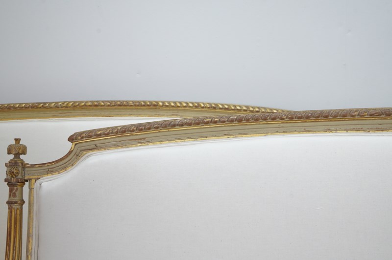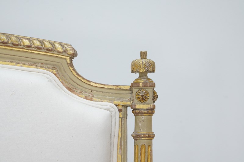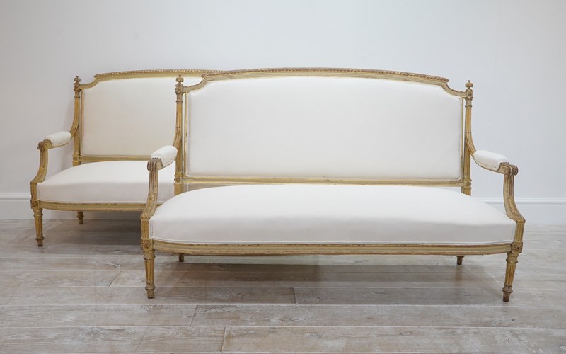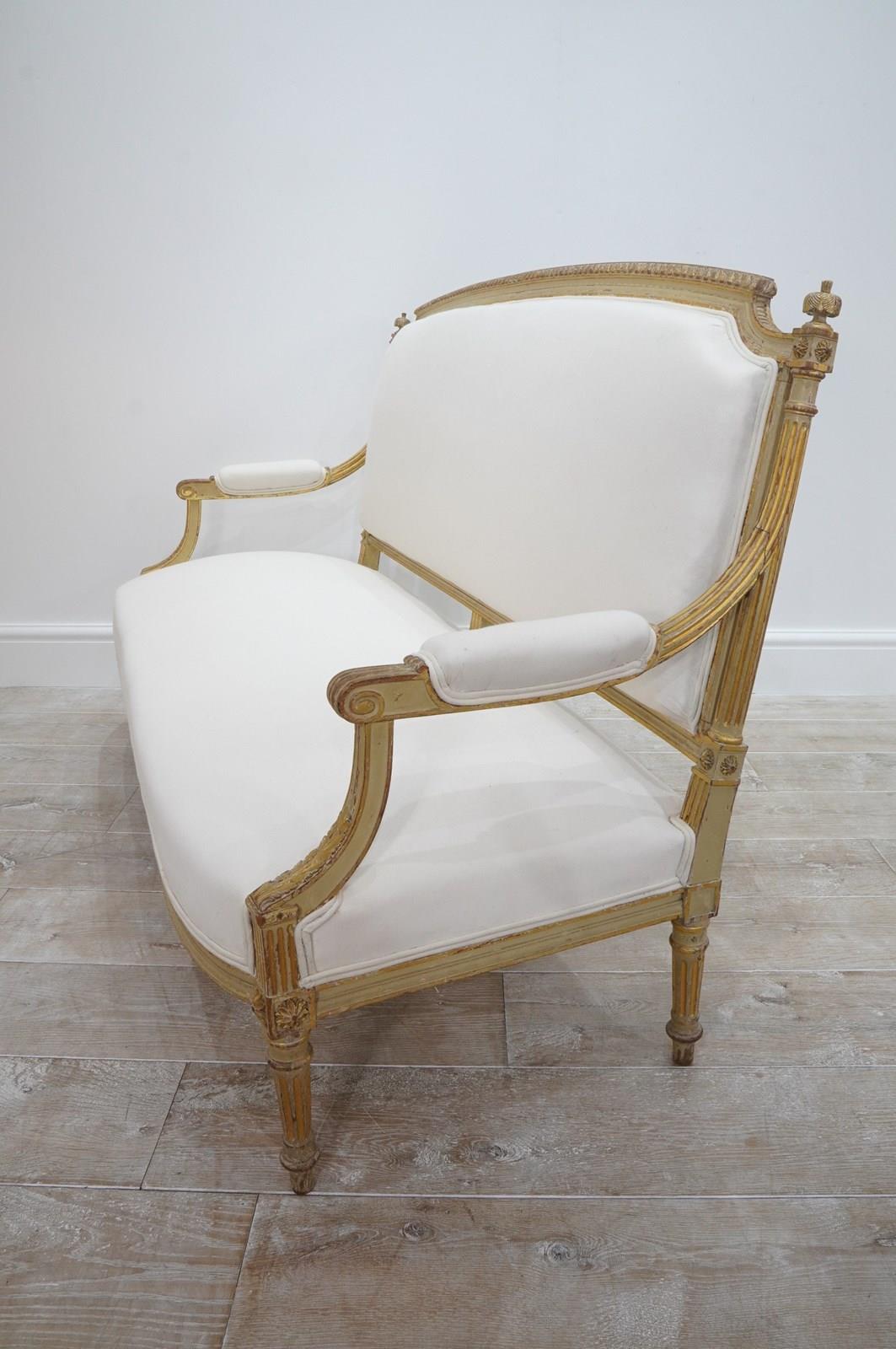 A decorative pair of 19th century French sofas in original paint. The show wood frames to these beautiful sofas still boast the original painted surface together with some small areas highlighted in fine gold leaf.