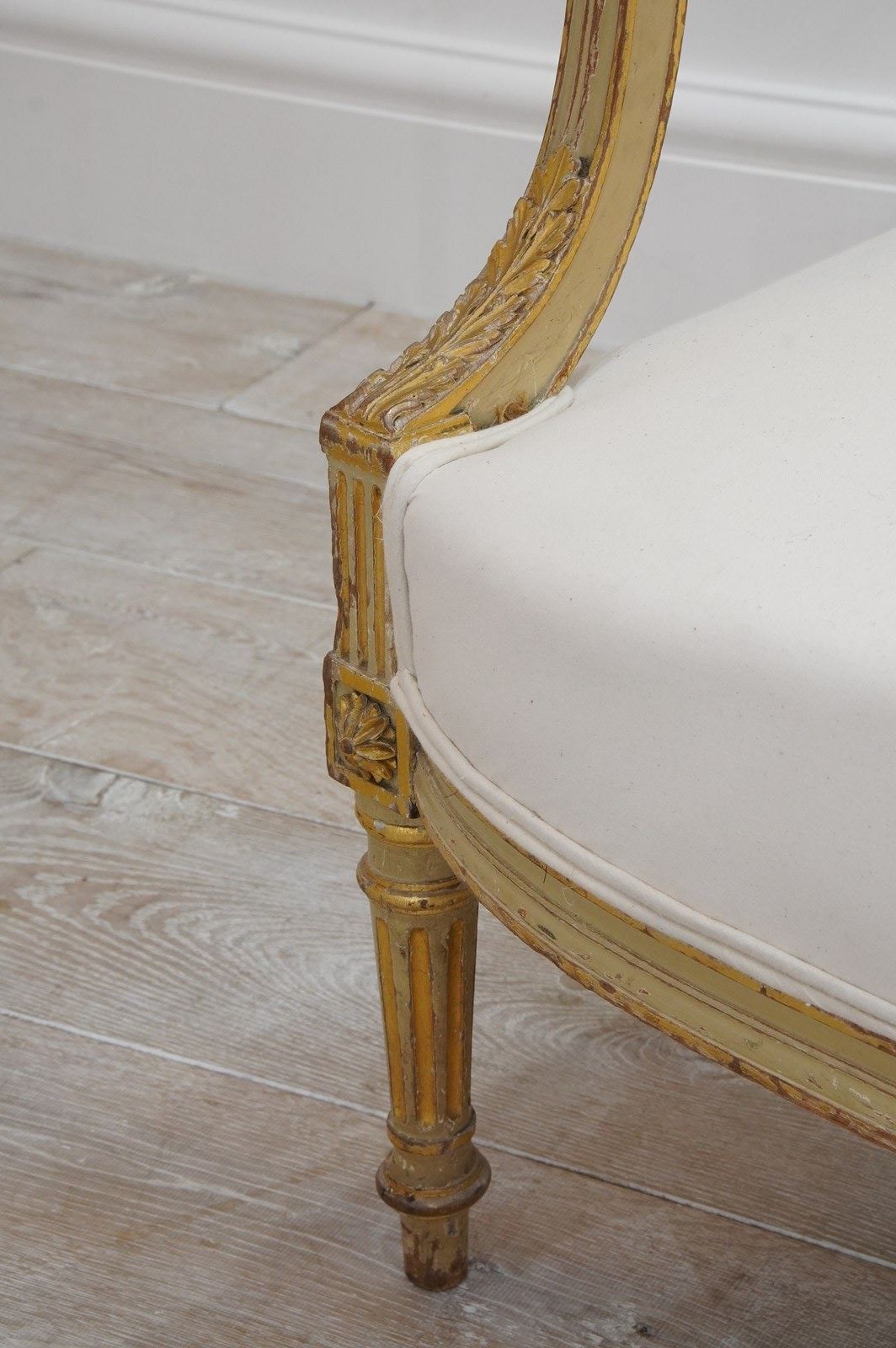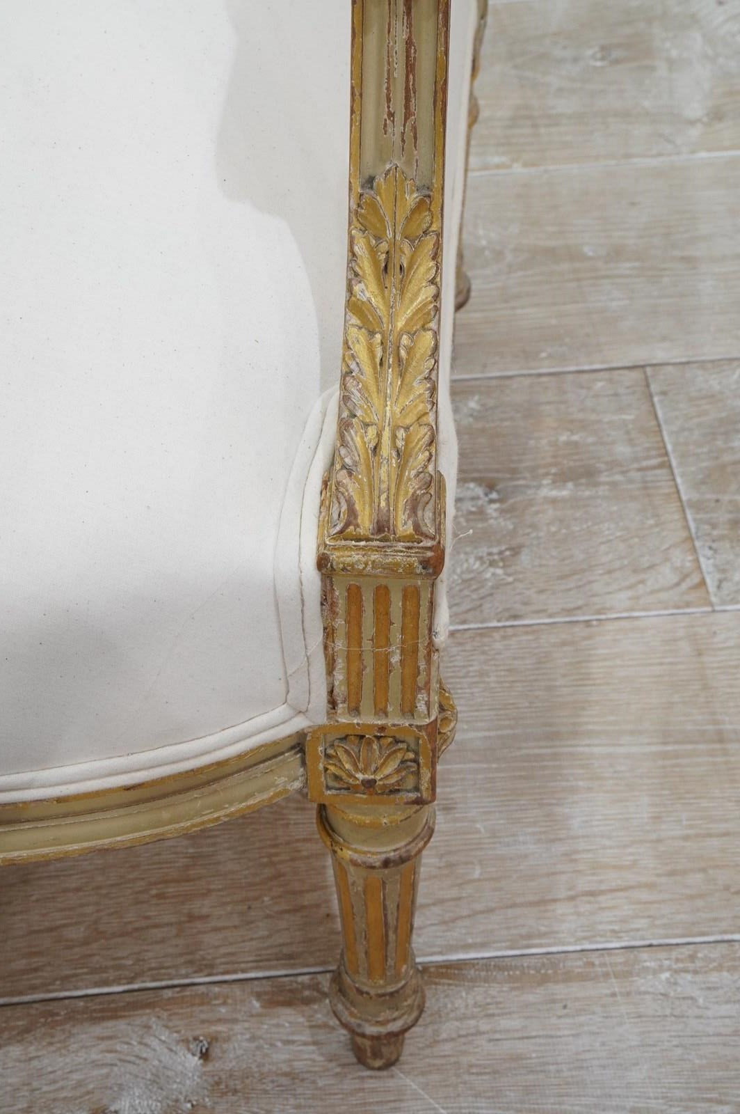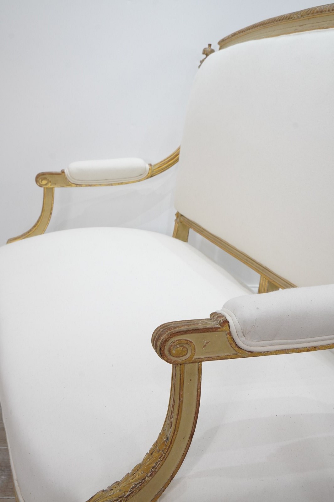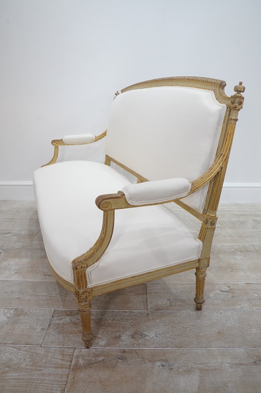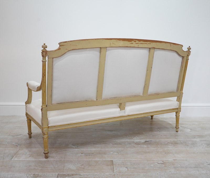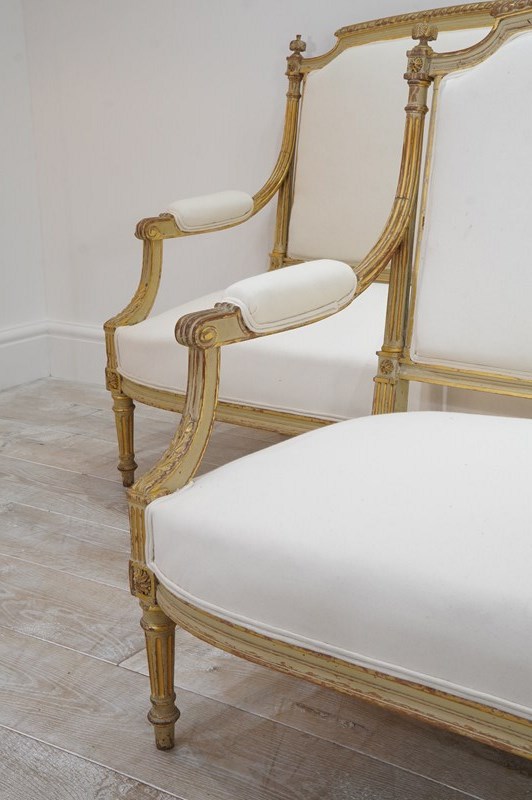The frames are sound and sturdy with no loose joints. The paint has naturally rubbed and faded a little in places only adding to their immense charm. The backs and seats have recently been upholstered up to calico leaving the final covering to one’s own choice. Pair of French sofas circa 1880.