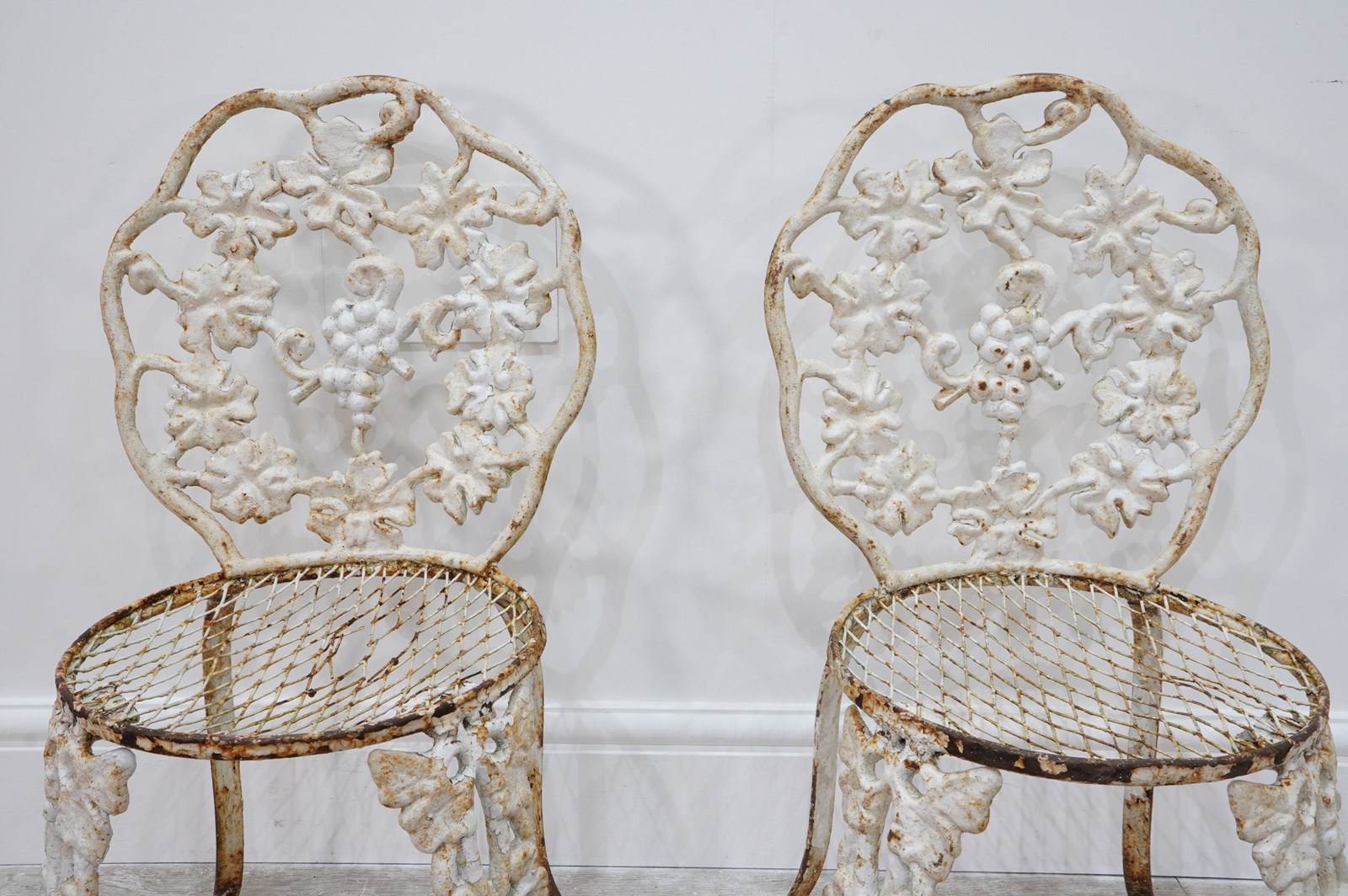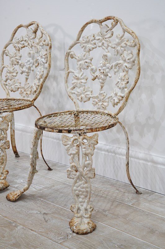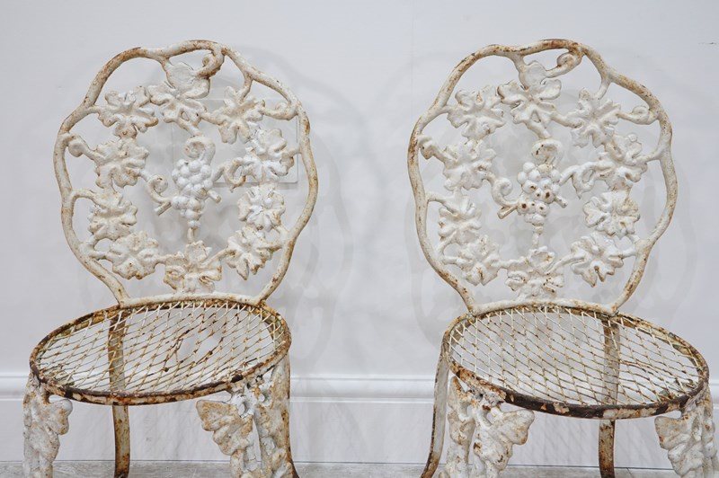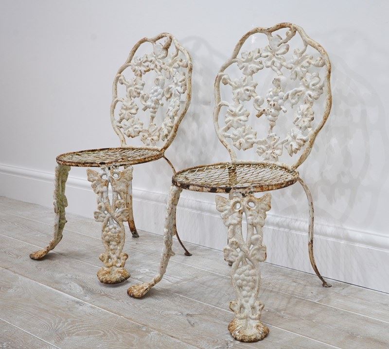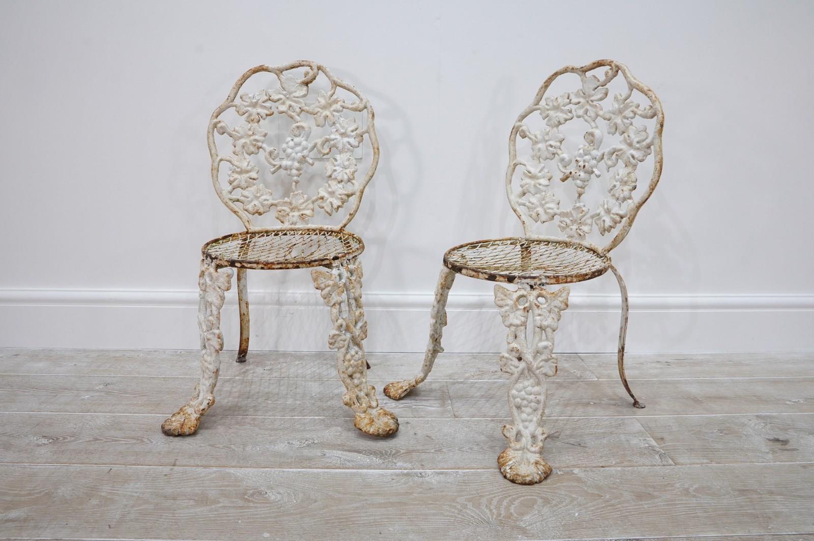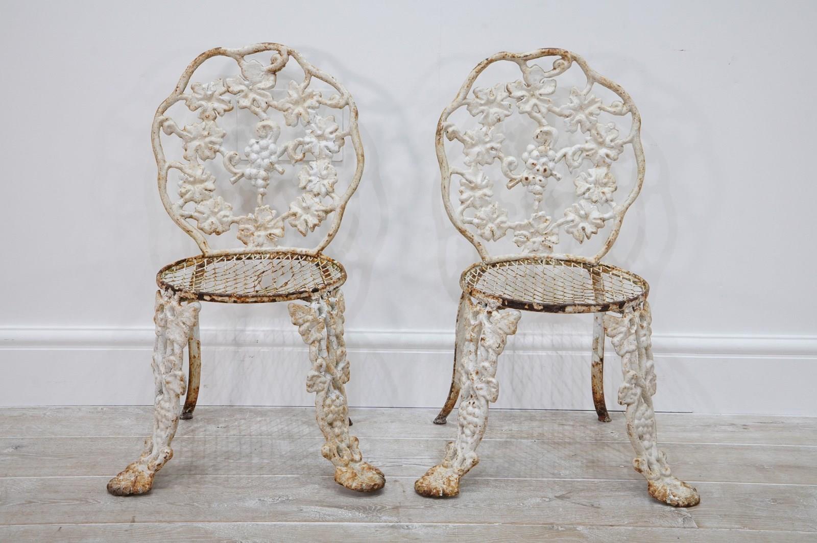 A weathered pair of 19th century garden / terrace chairs. There is a small break to the seat of one of the two chairs which will definitely benefit from the introduction of a small squab cushion, nevertheless they are pretty enough to stand alone as decorative feature chairs on the terrace or garden. The cast iron backs and front legs replicate bunches of grapes on vine with leaves entwining.