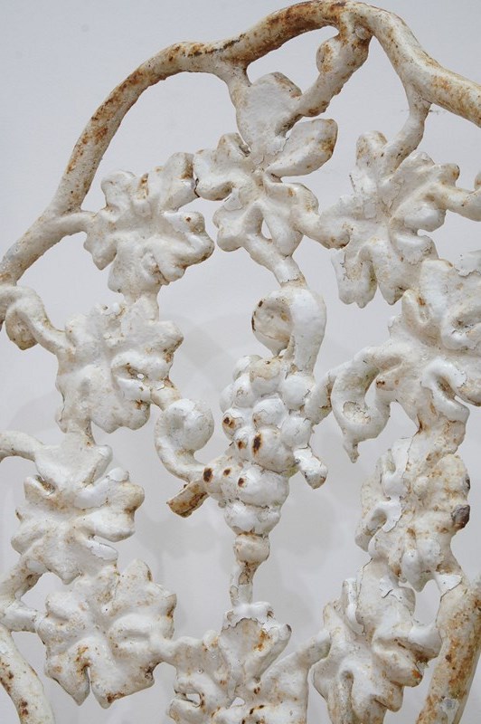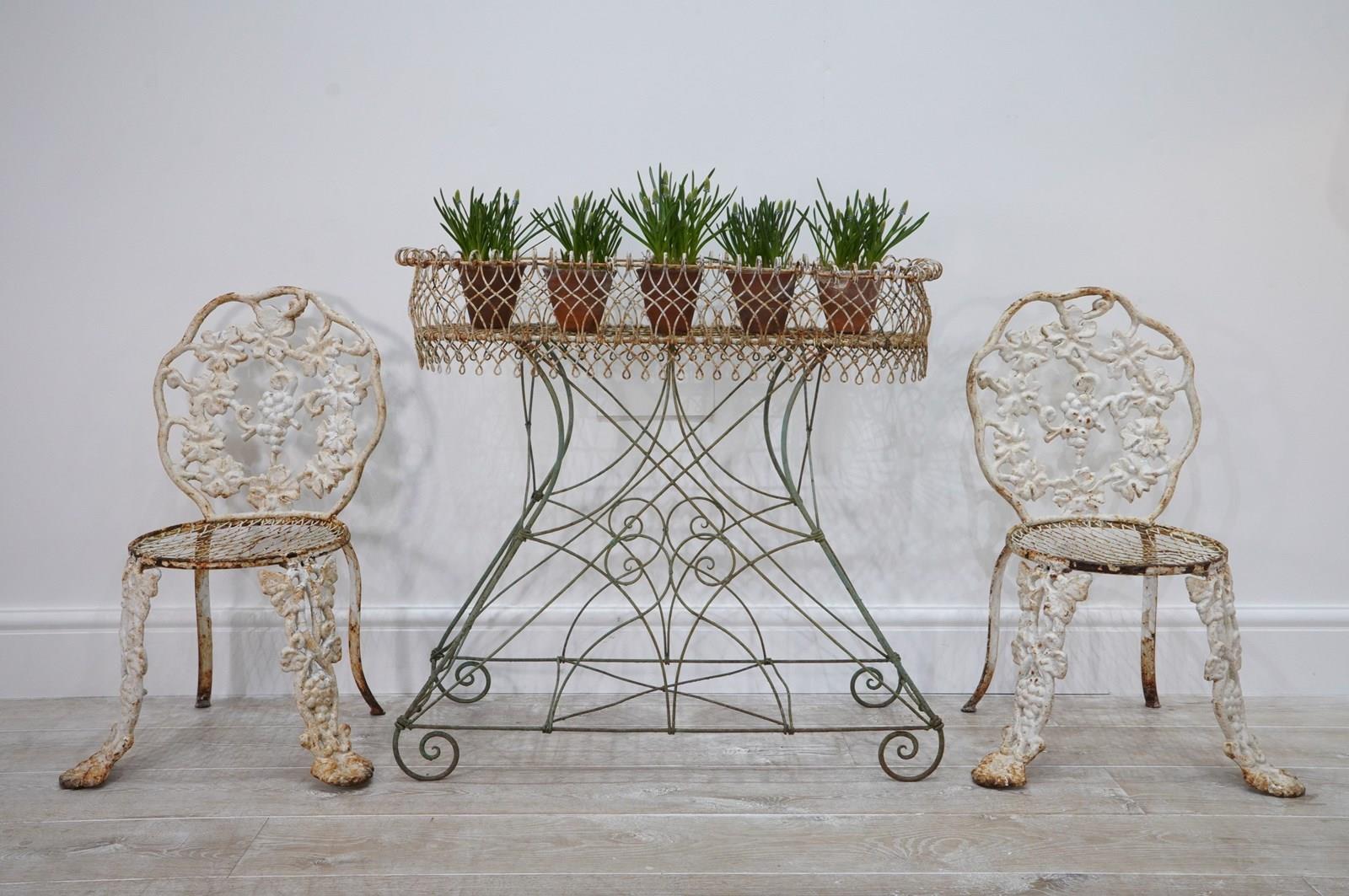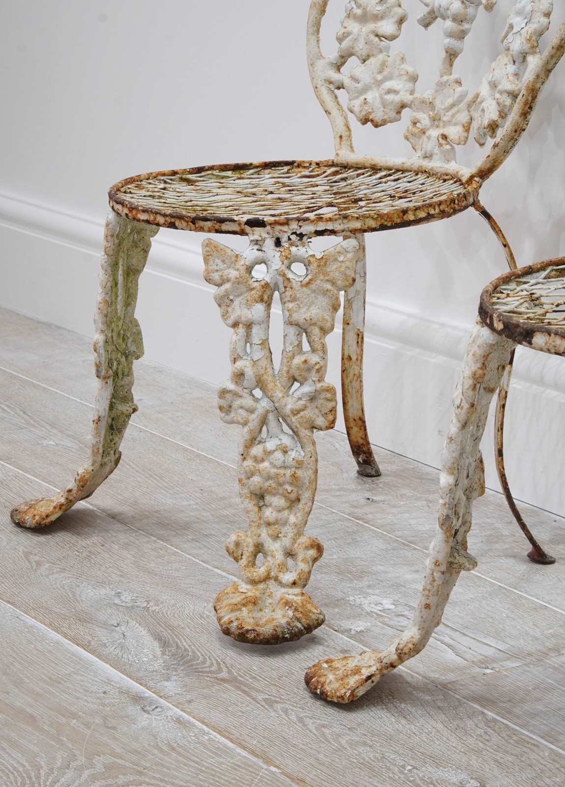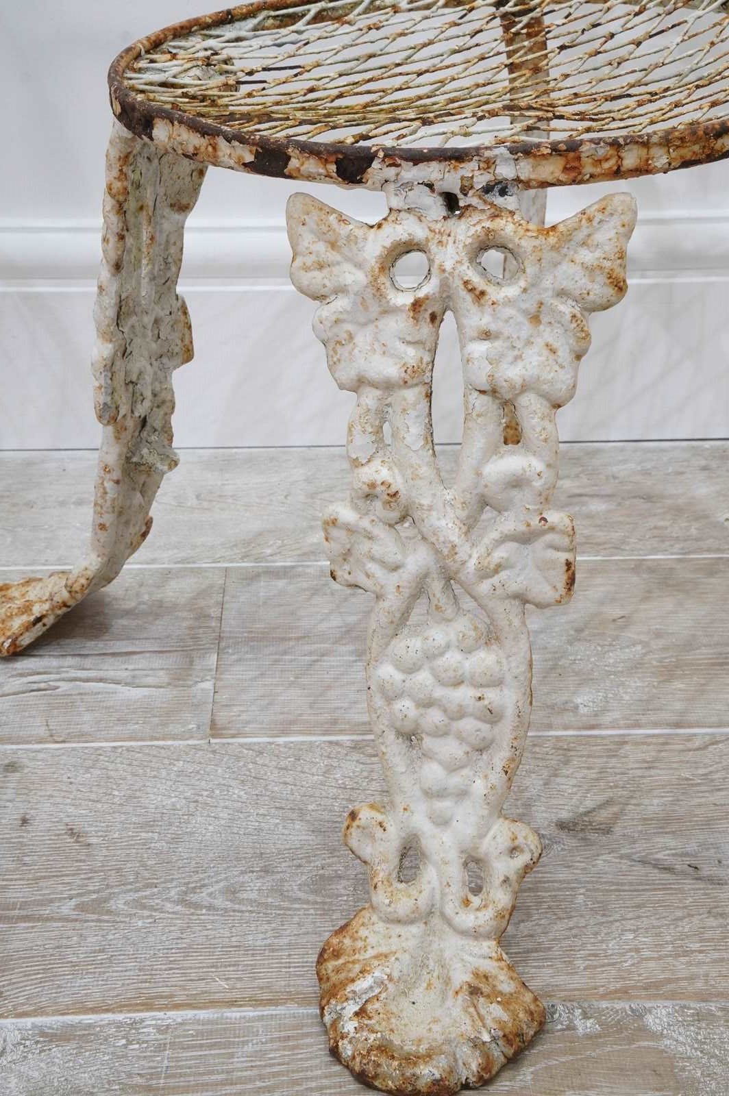 A weathered pair of 19th century garden / terrace chairs. There is a small break to the seat of one of the two chairs which will definitely benefit from the introduction of a small squab cushion, nevertheless they are pretty enough to stand alone as decorative feature chairs on the terrace or garden. The cast iron backs and front legs replicate bunches of grapes on vine with leaves entwining.