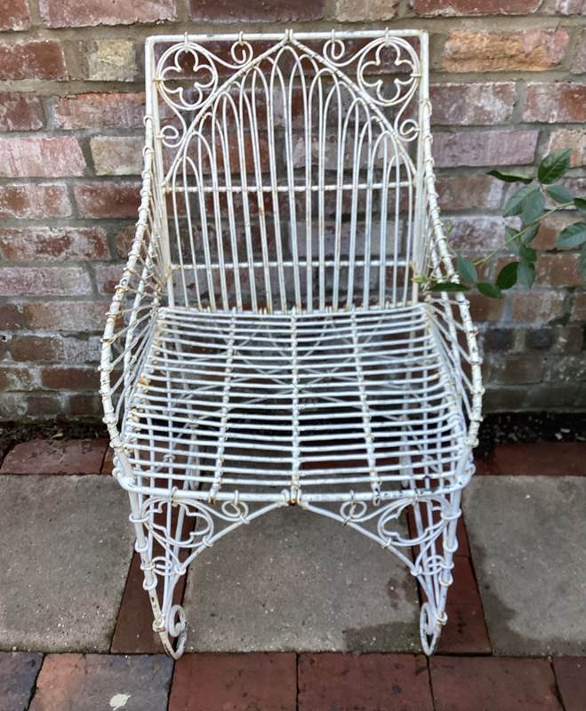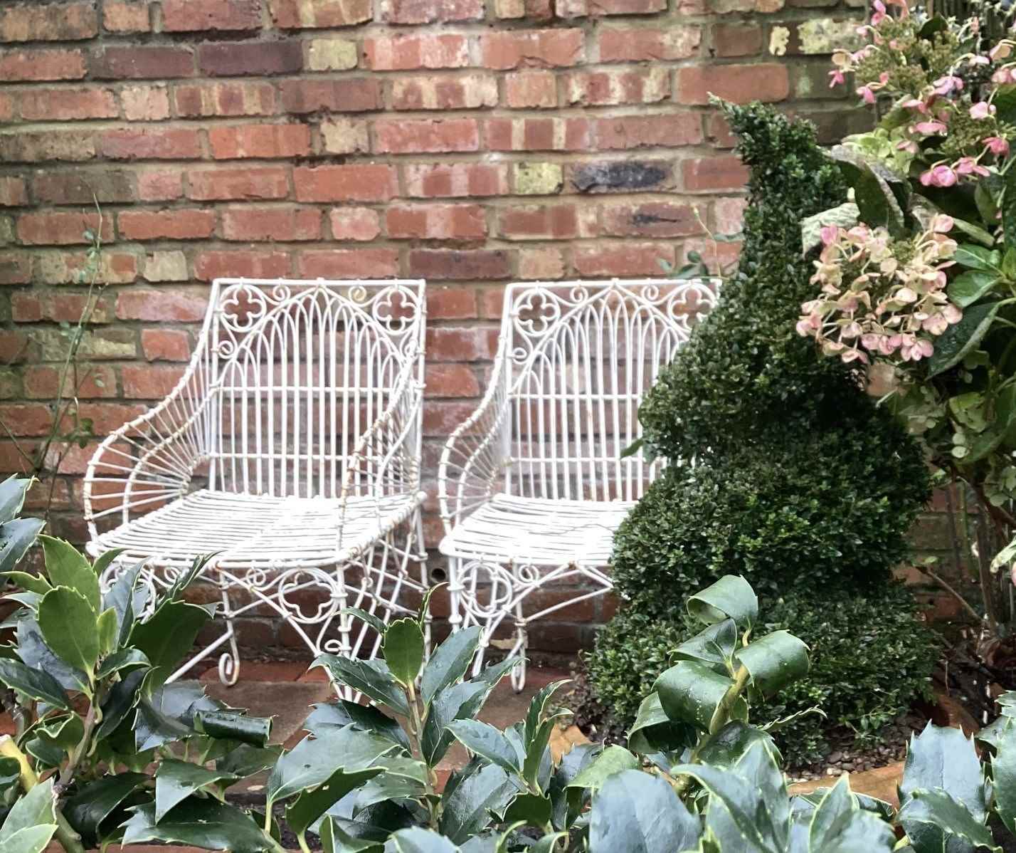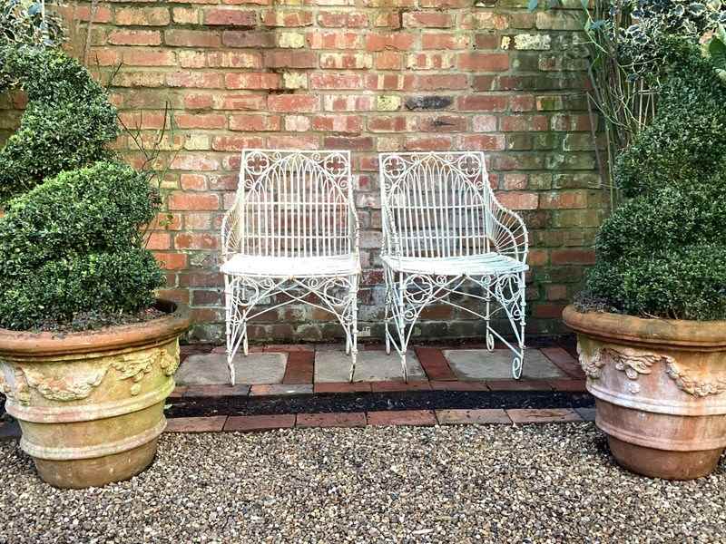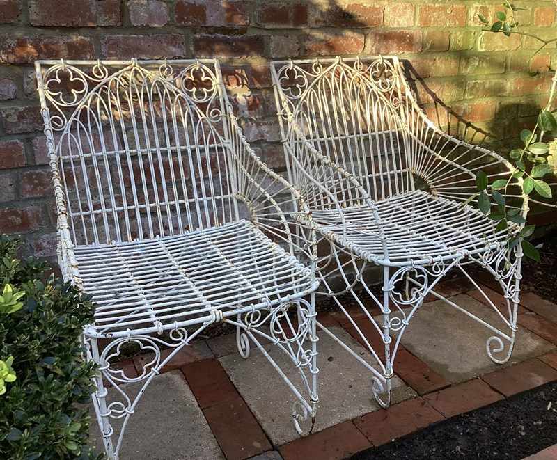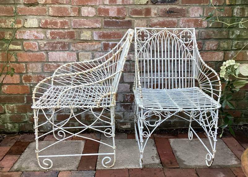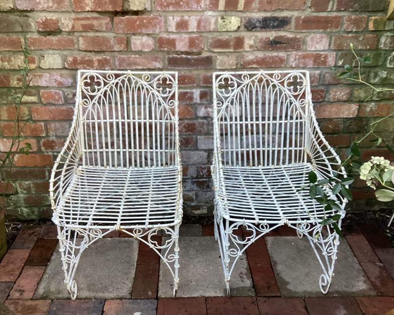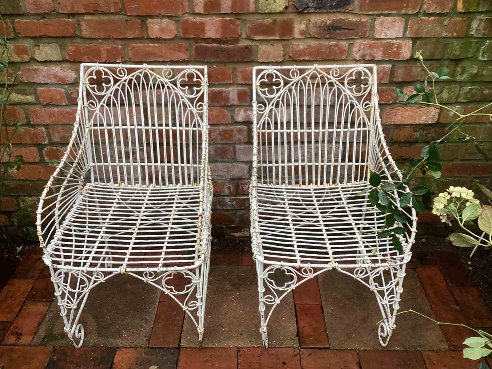 A good pair of mid century heavy gauge wirework chairs. The slanted backs have a central Gothic arch within an intricate wirework frame, the same arched design being repeated between the two front wirework legs. The wide seats are comfortable but could benefit from a thin upholstered squab cushions. The construction together with the condition of these pretty chairs is superb with no damage or weaknesses. A decorative pair of garden chairs that could work perfectly well inside or out