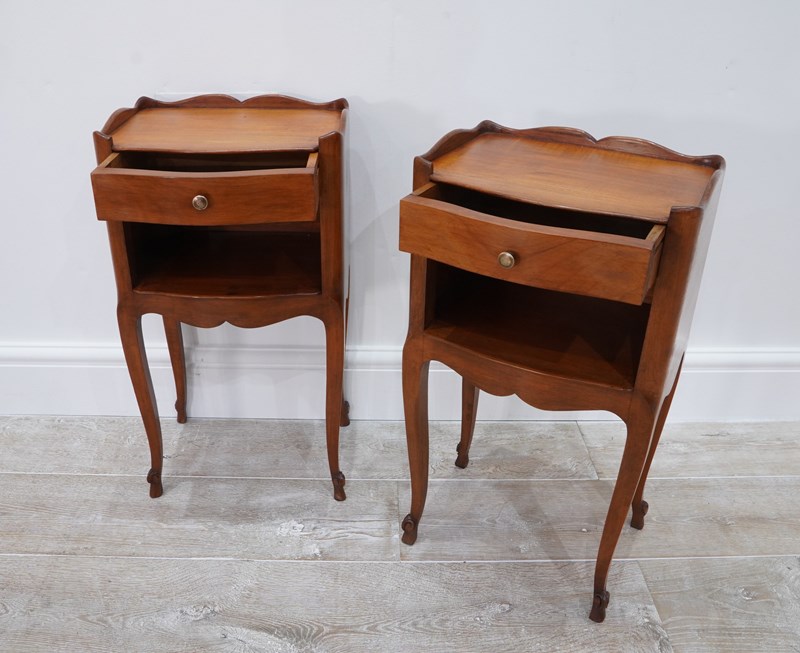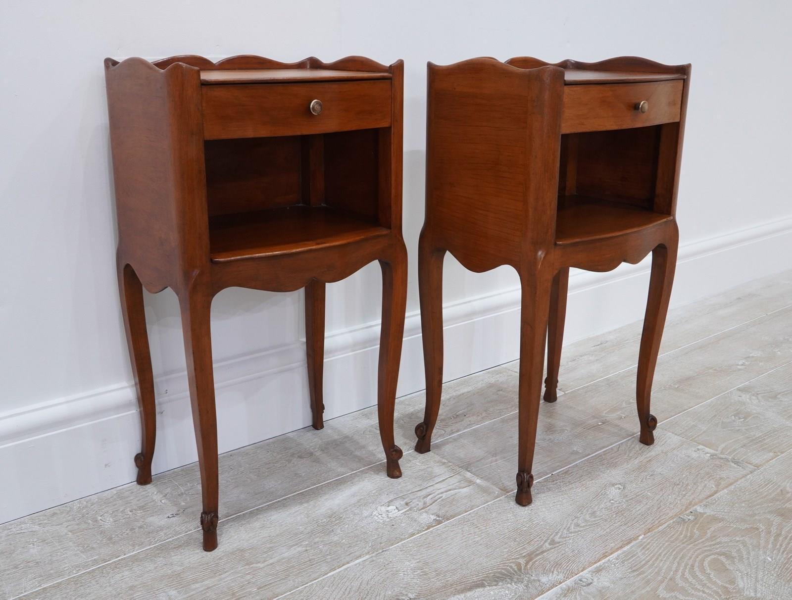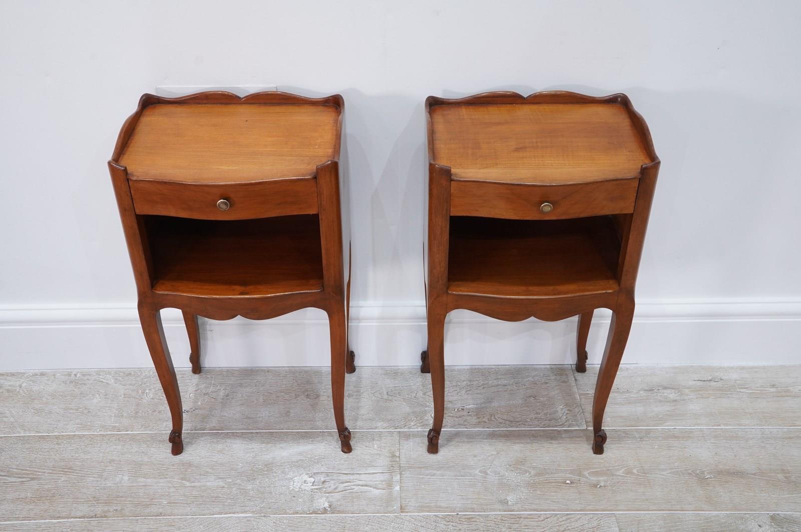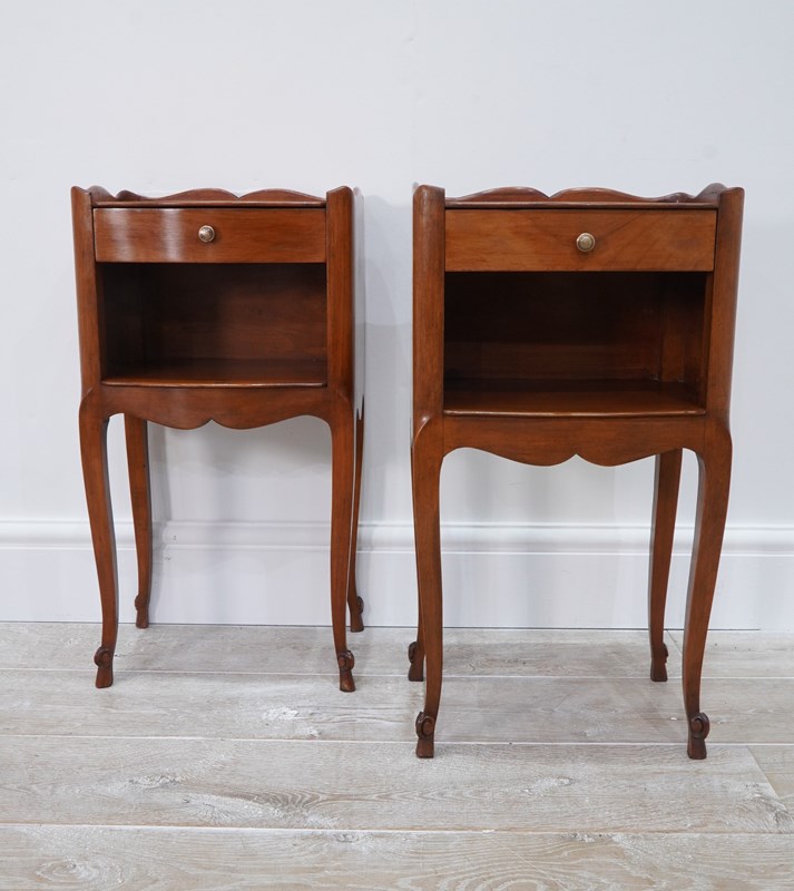 A neat pair of mid century cherrywood bedsides. These pretty bedsides have a spacious flat top with single drawer below, beneath the drawer is a good storage space, perfect for books etc. Raised on shapely cabriole legs with decorative snail detail to the foot. Polished French cherry bedside units circa 1950.