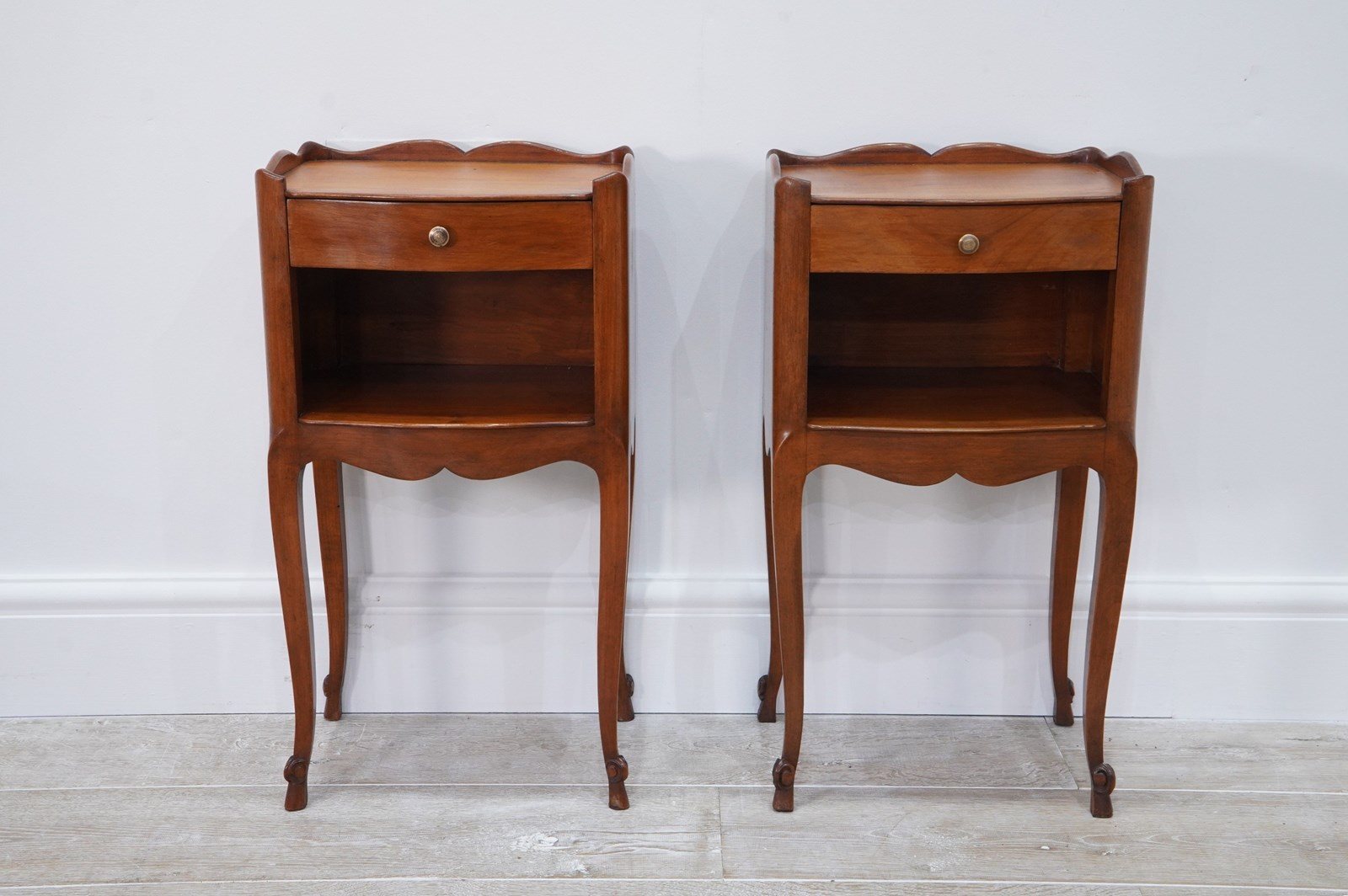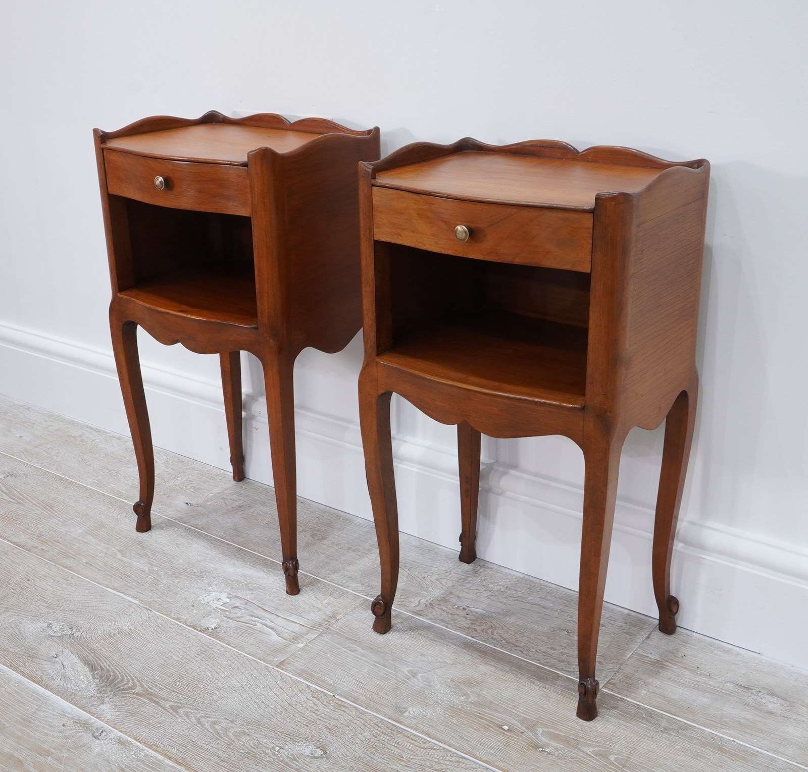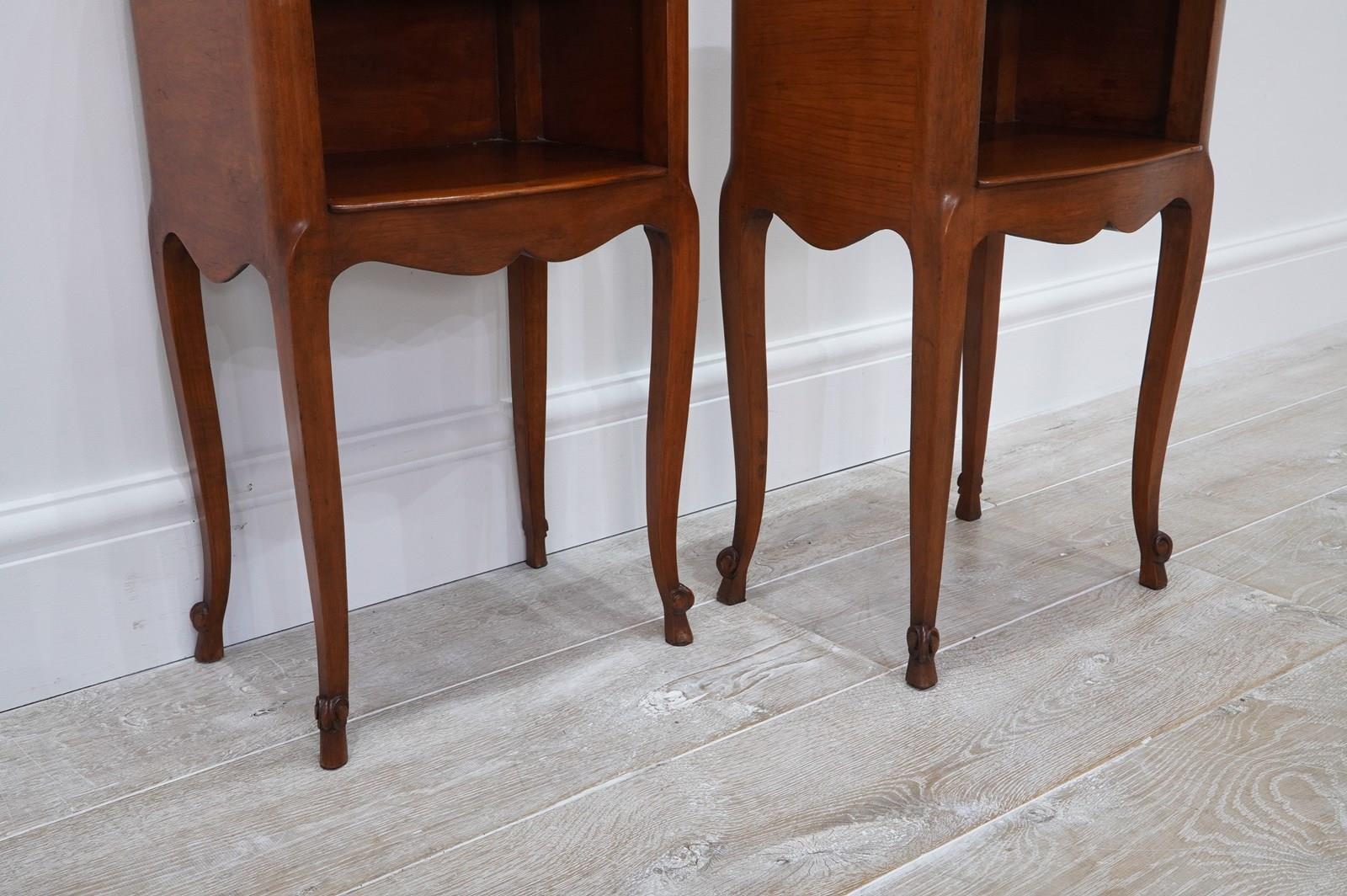 A neat pair of mid century cherrywood bedsides. These pretty bedsides have a spacious flat top with single drawer below, beneath the drawer is a good storage space, perfect for books etc. Raised on shapely cabriole legs with decorative snail detail to the foot. Polished French cherry bedside units circa 1950.