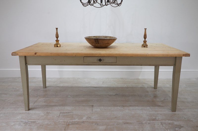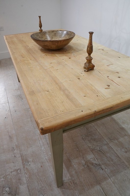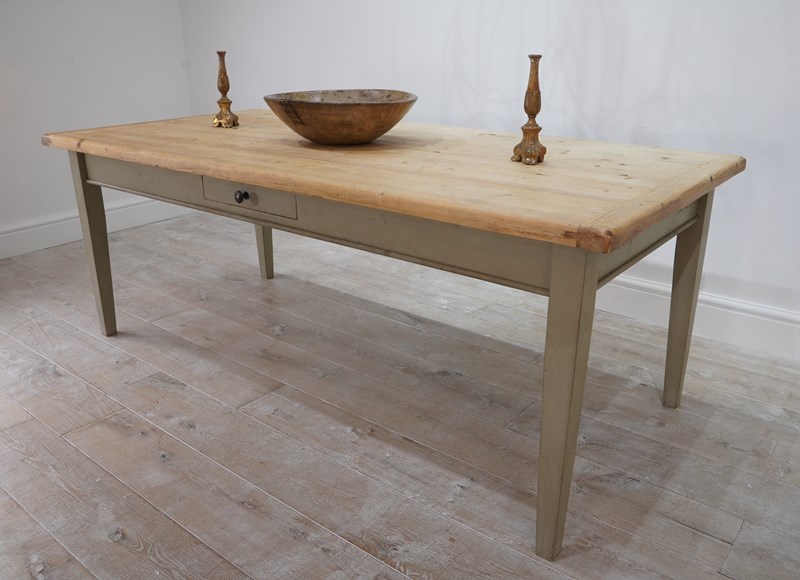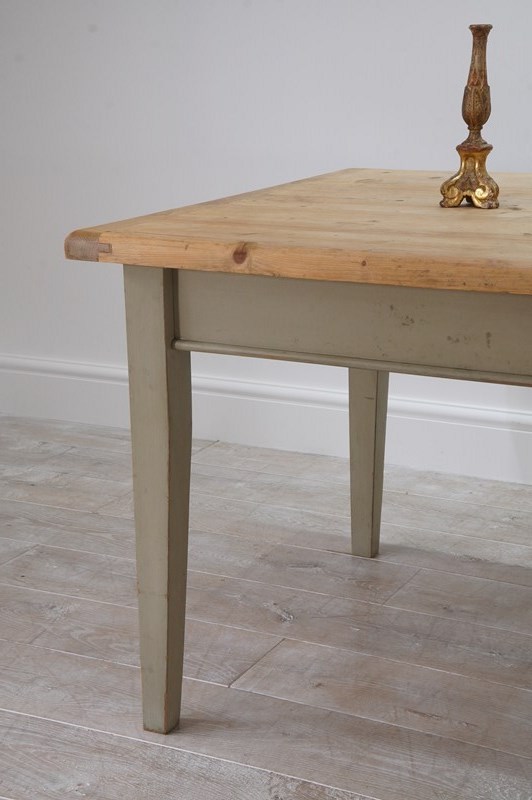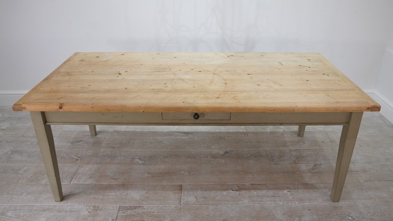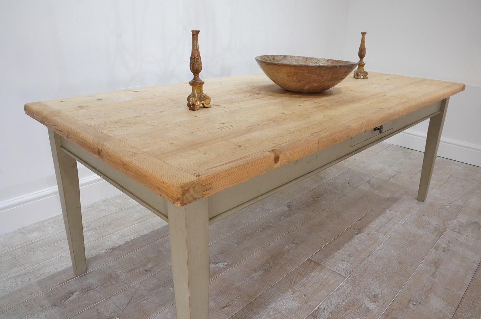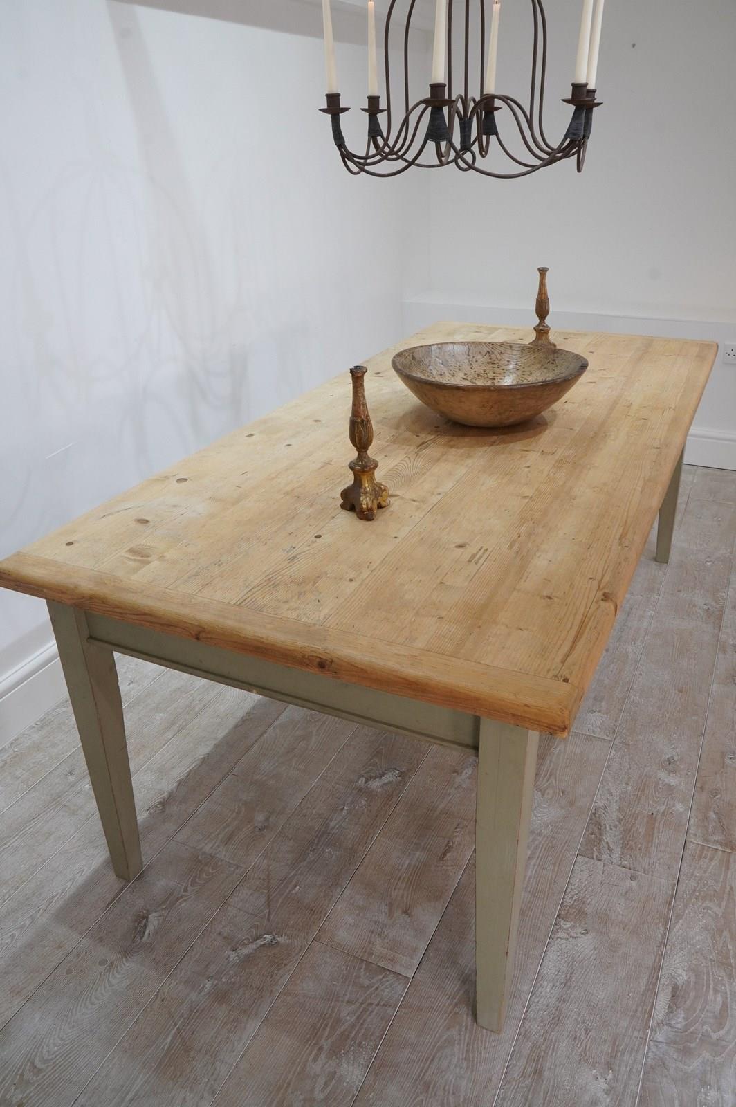 A large scale mid century pine kitchen / dining table with original painted base. The top to this impressive wide table is naturally pale and has been sealed for easy care and use. The table apron below has one small drawer with patinated brass handle. It stands on four square tapering legs with the original pale moss green painted surface, a pleasing contrast to the pine. English pine table.