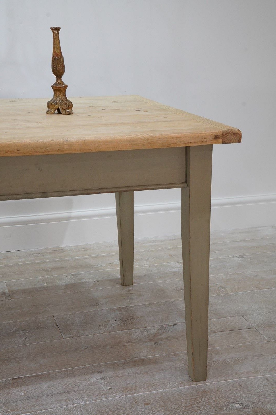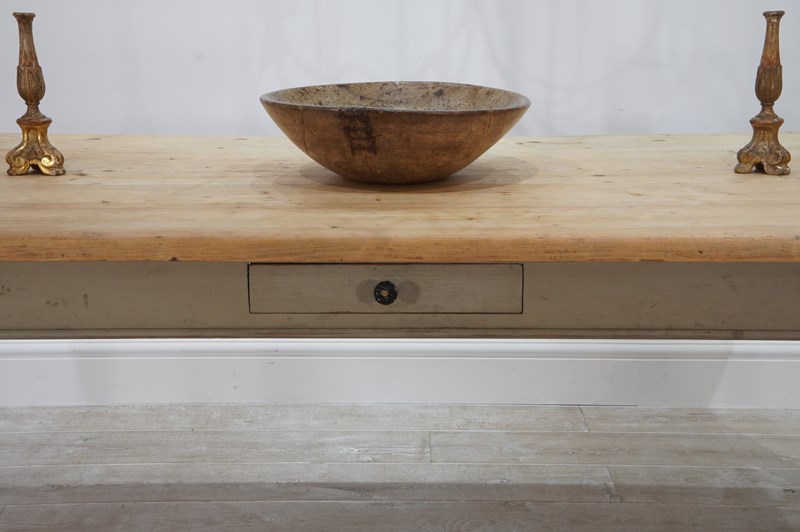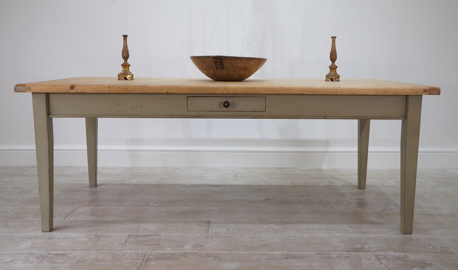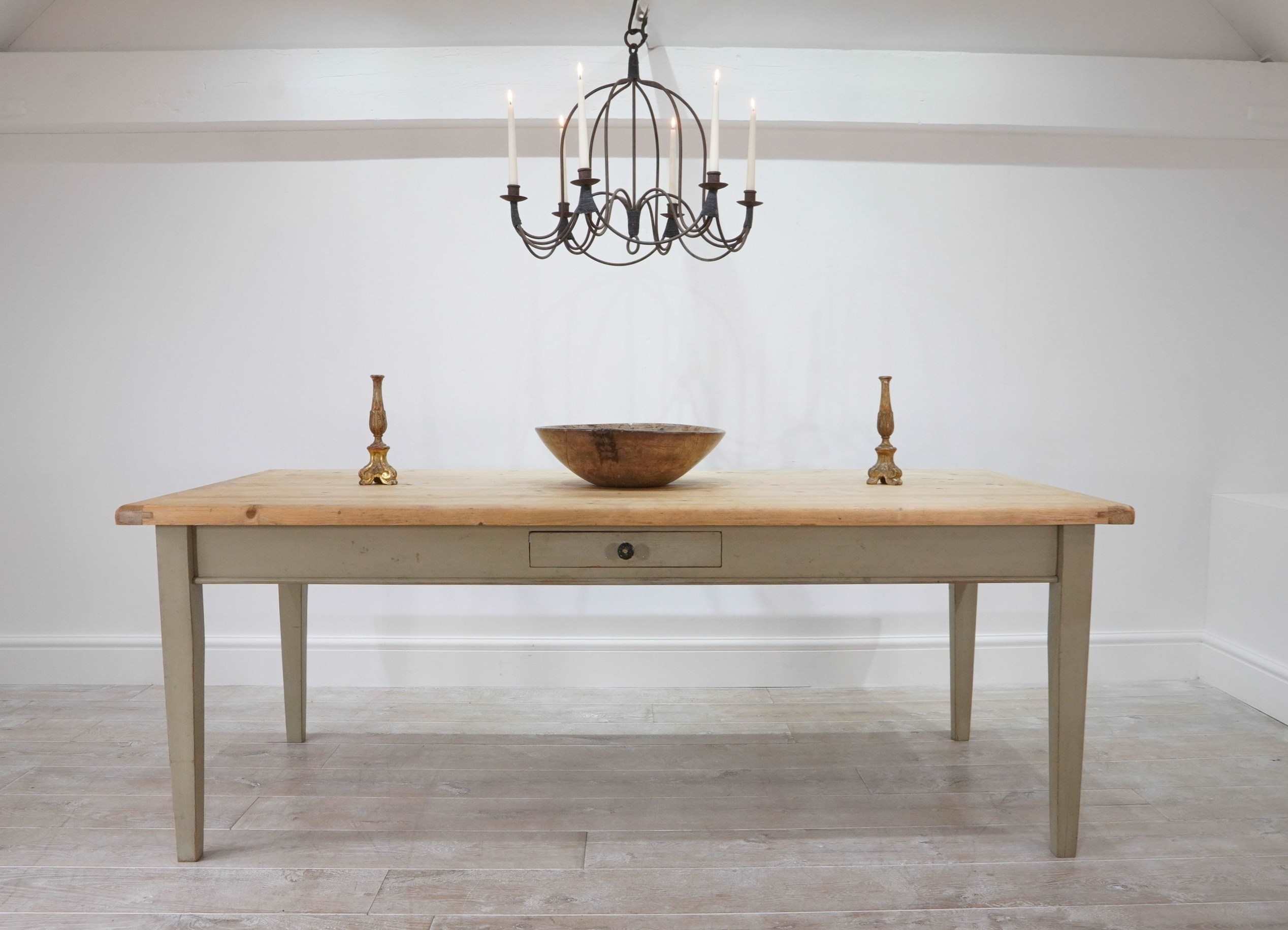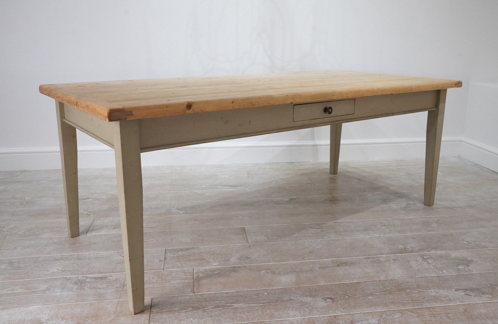 A large scale mid century pine kitchen / dining table with original painted base. The top to this impressive wide table is naturally pale and has been sealed for easy care and use. The table apron below has one small drawer with patinated brass handle. It stands on four square tapering legs with the original pale moss green painted surface, a pleasing contrast to the pine. English pine table.