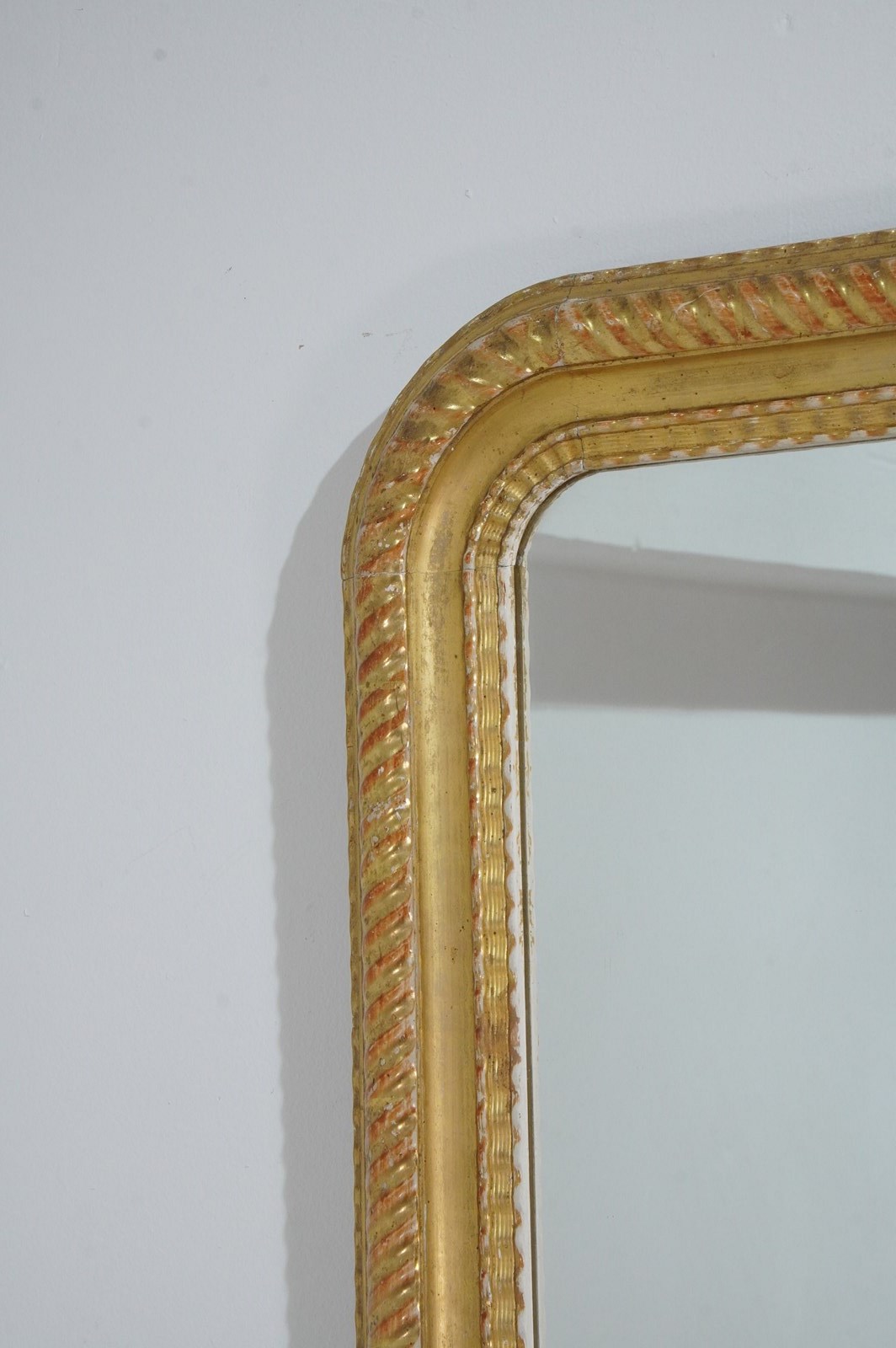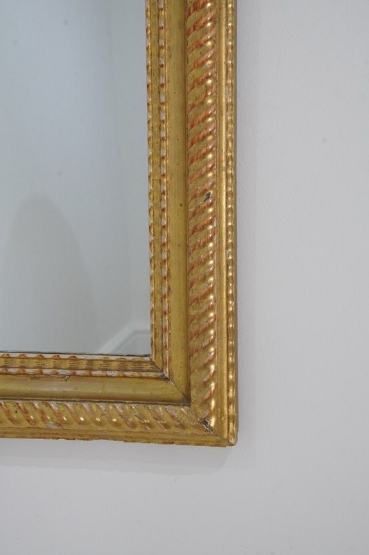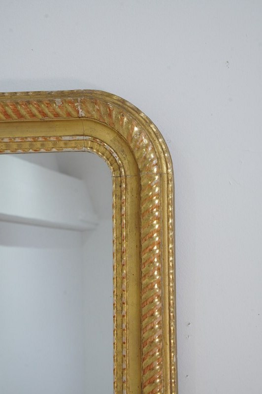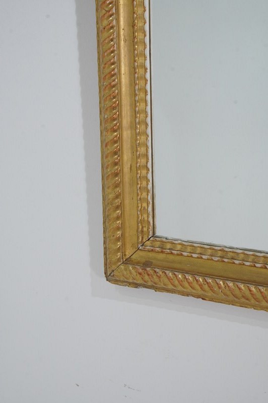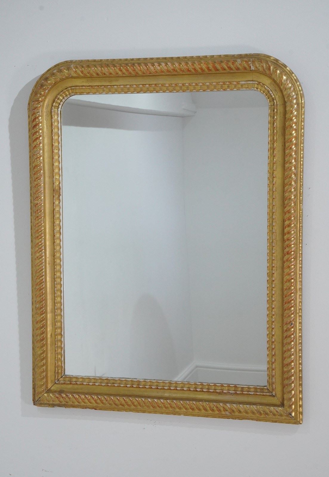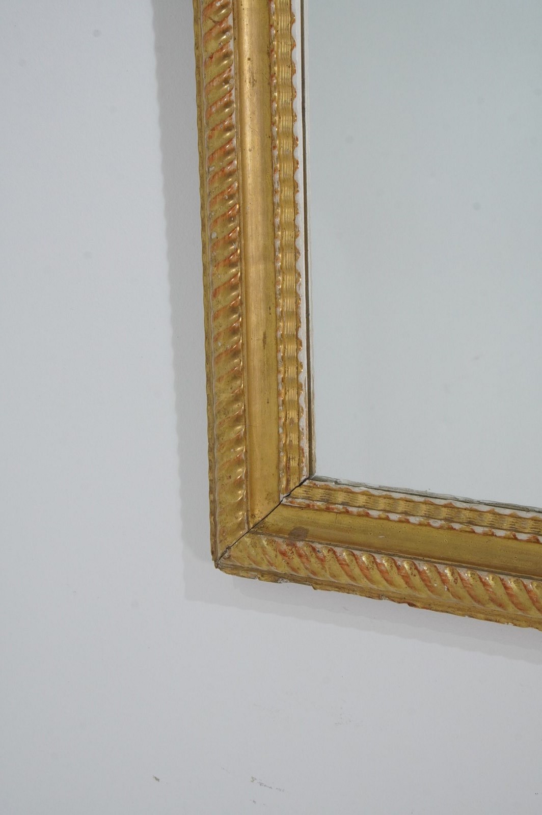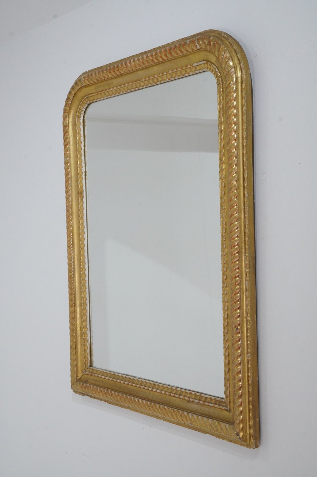 A 19th century French wall mirror with decorative raised ripple edge moulding. Lovely warm gilded surface with just a little base colour shining through. Original mercury glass mirror plate and back boards.