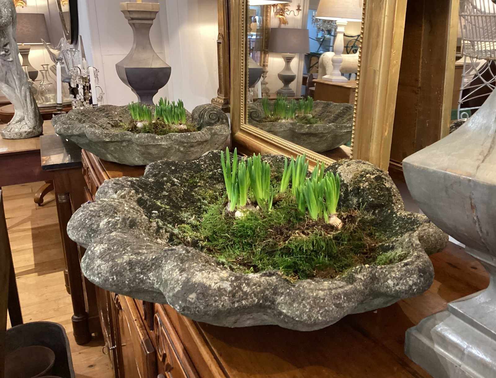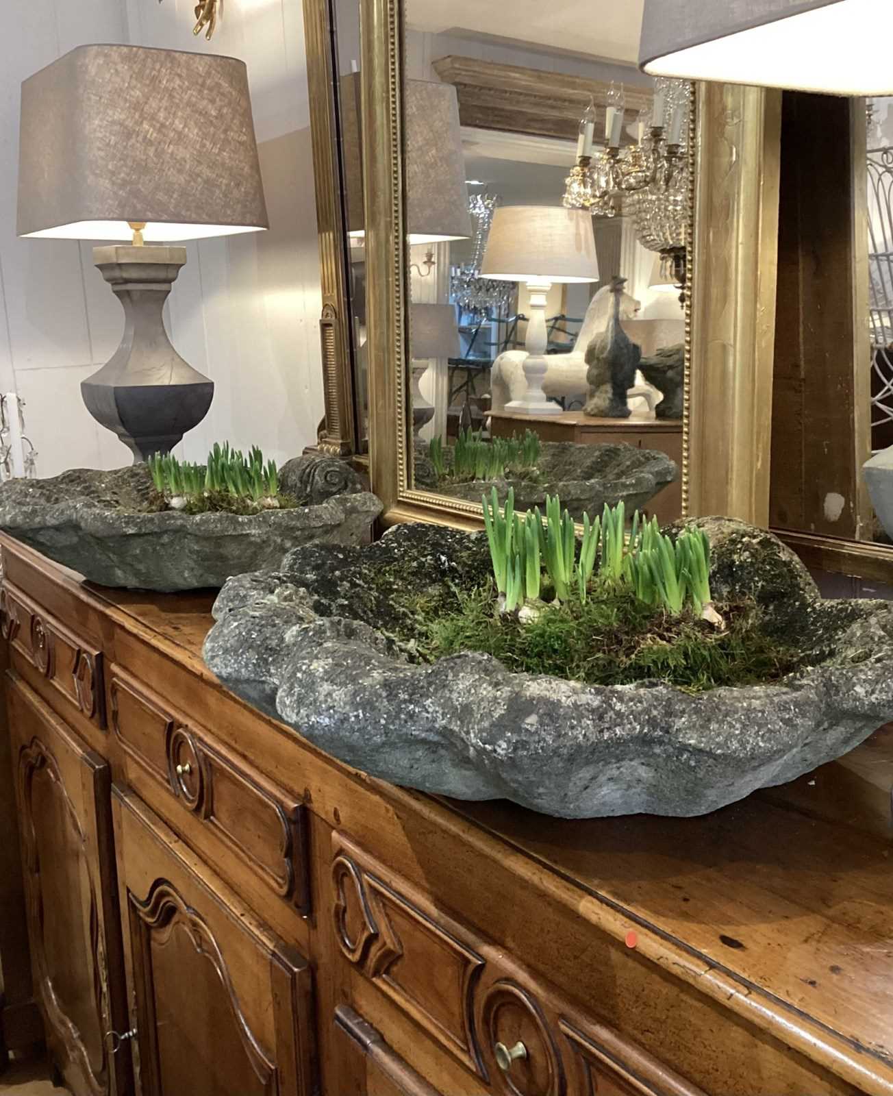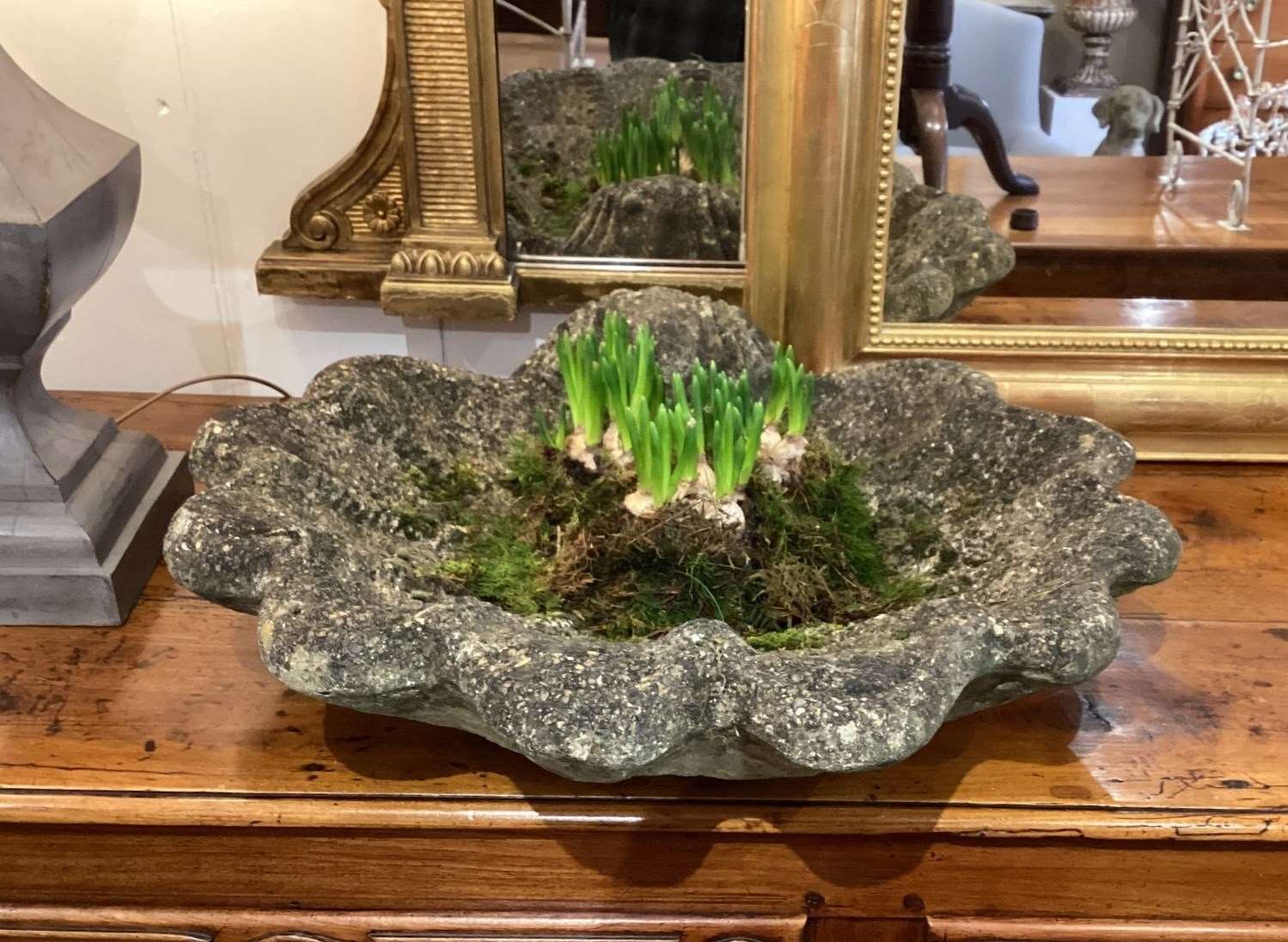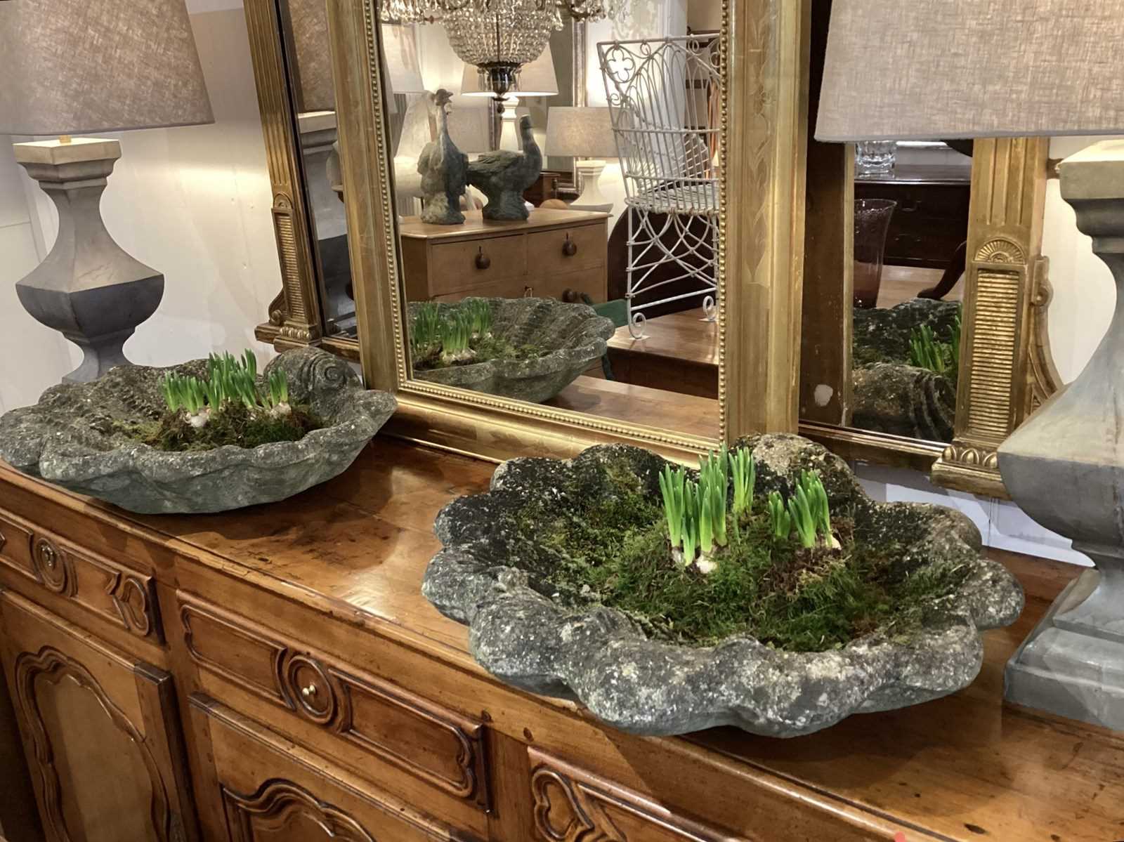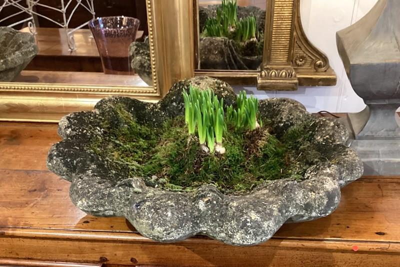 These decorative planters are presented in the form of shallow clam shells. Nicely weathered with heaps of moss having been exposed to the elements for at least half a century or more. Perfect for small bulbs and succulent plants, each shell with a drainage hole to the centre. Clam shell planters. England circa 1960.