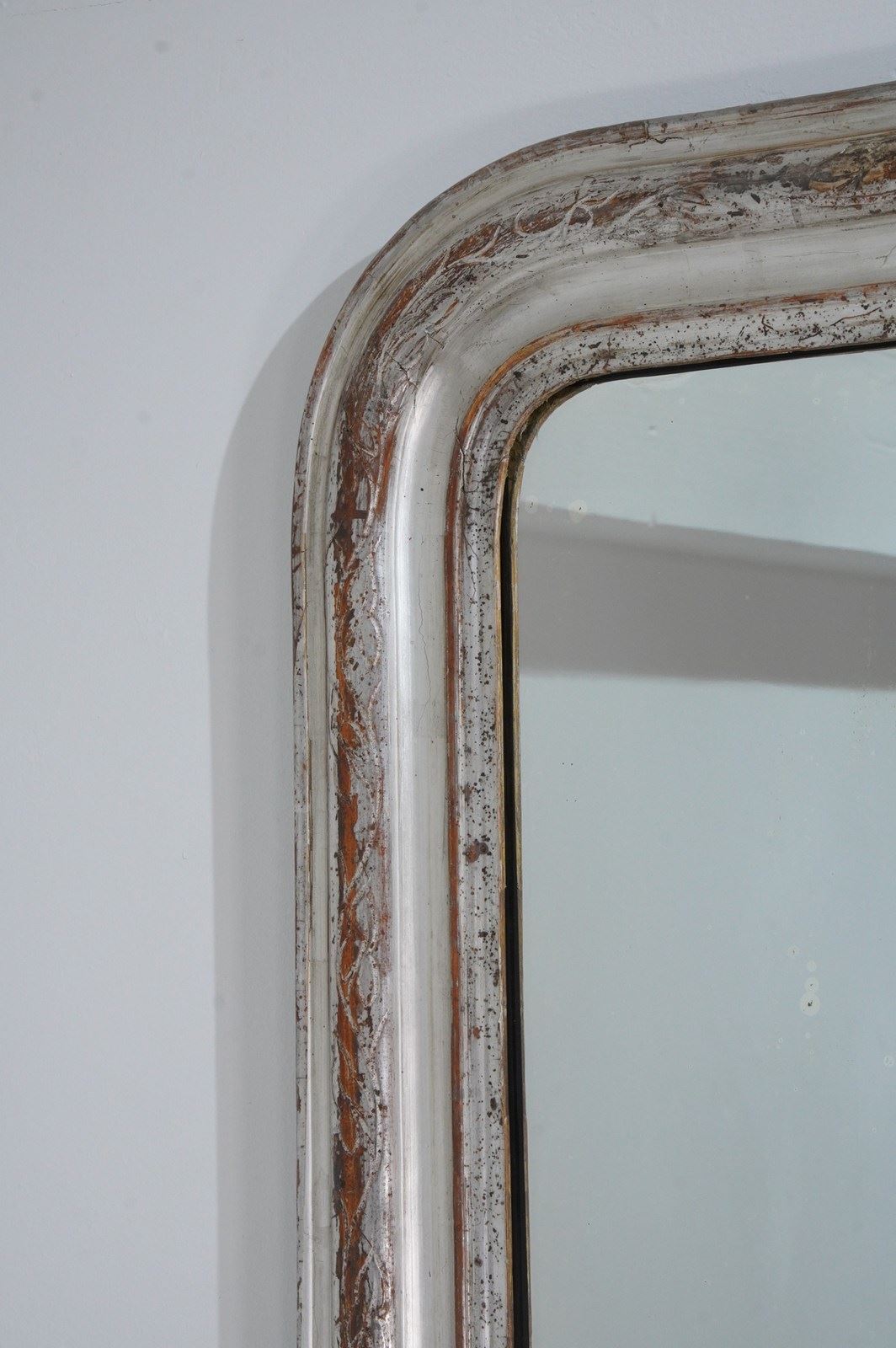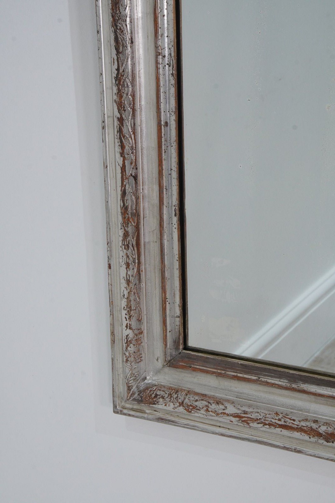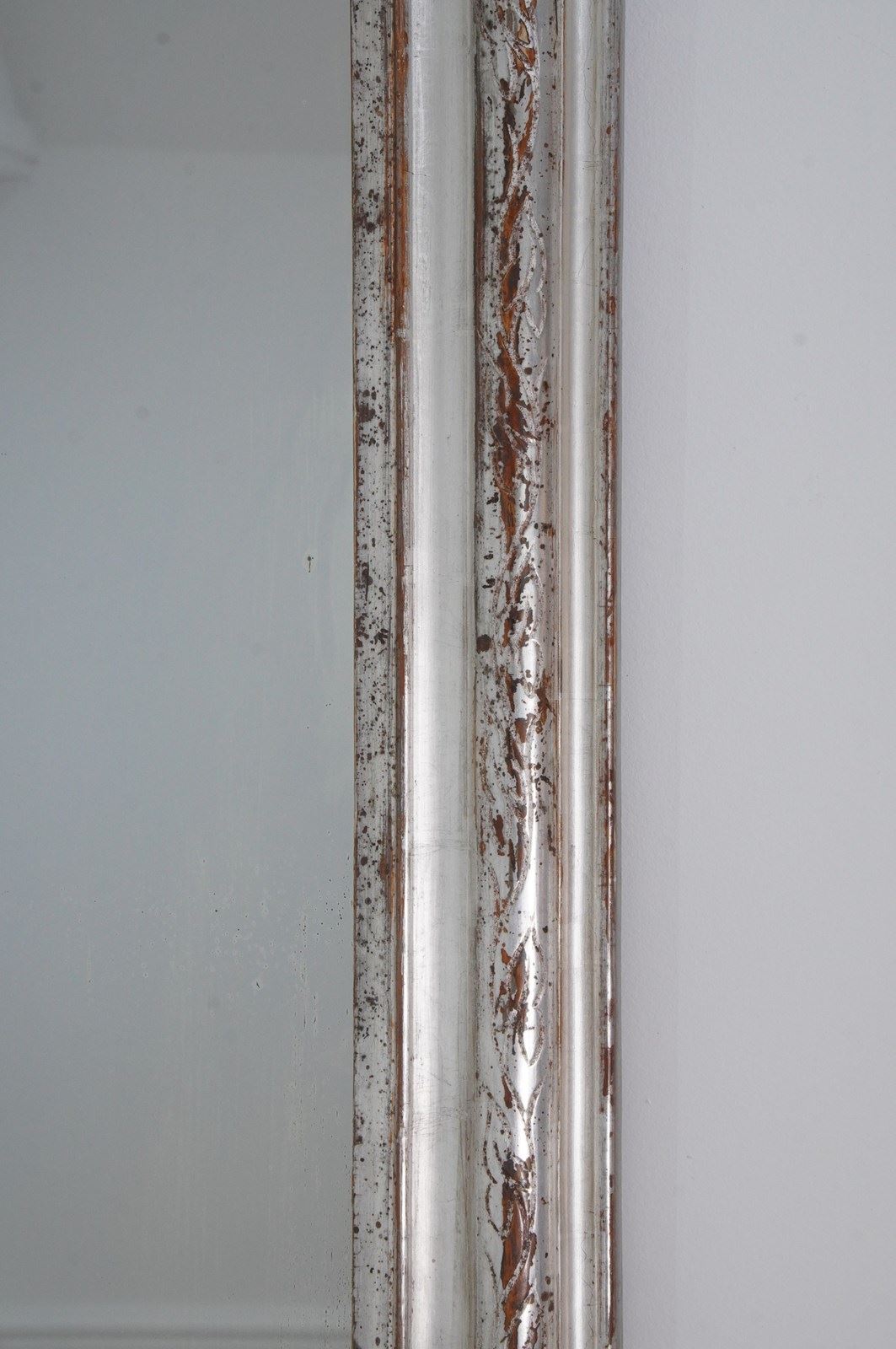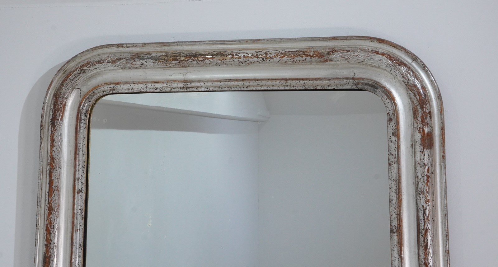 A 19th century silver leaf wall mirror. Although a little rubbed in places this pretty mirror holds plenty of deep silver lustre. The warm reddish base colour revealed is a pleasing contrast to the silver.