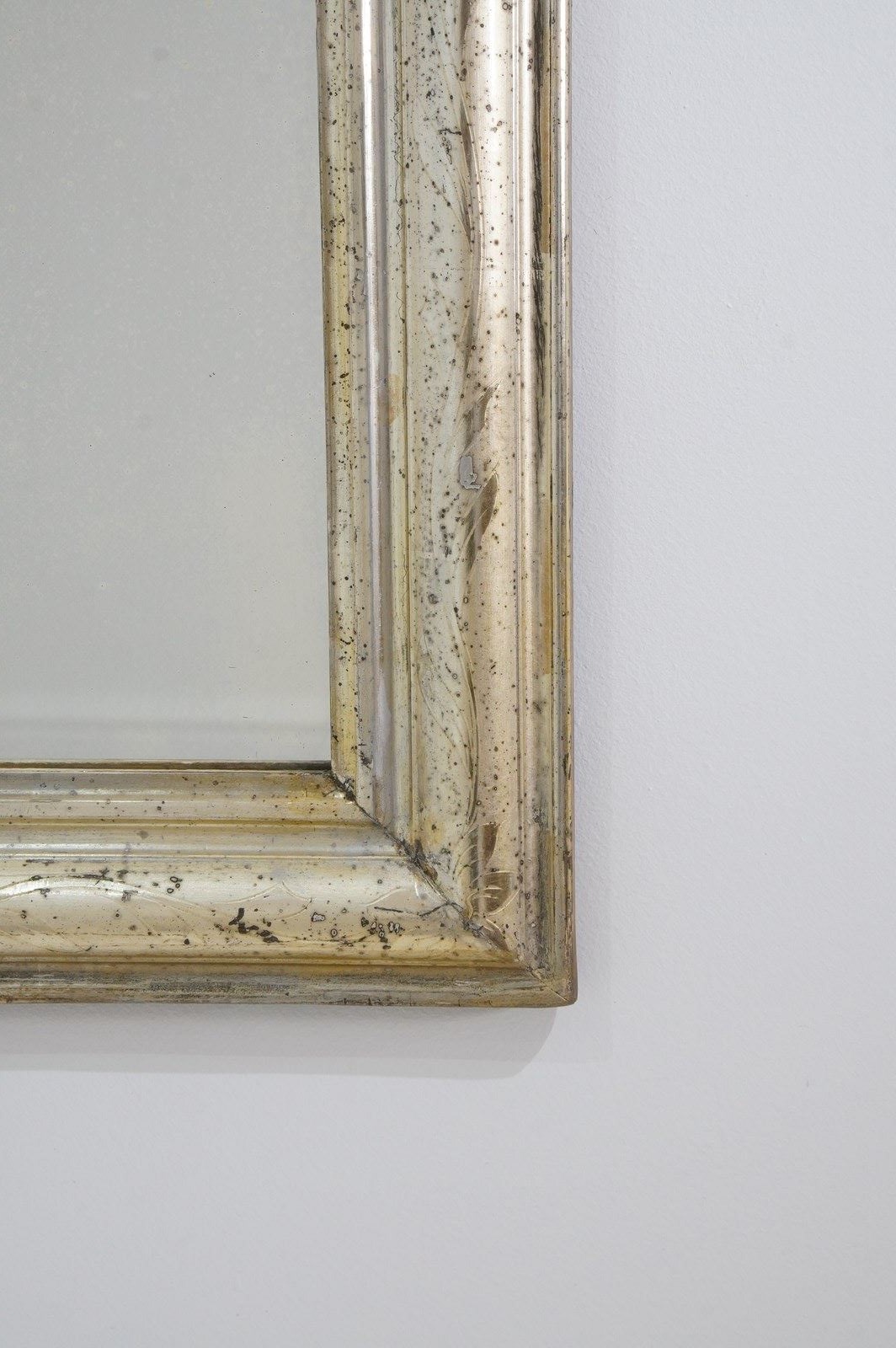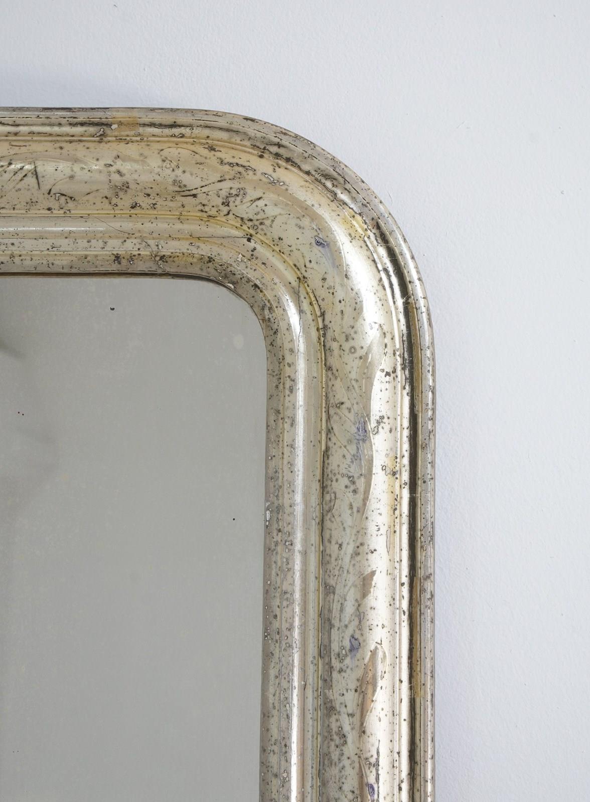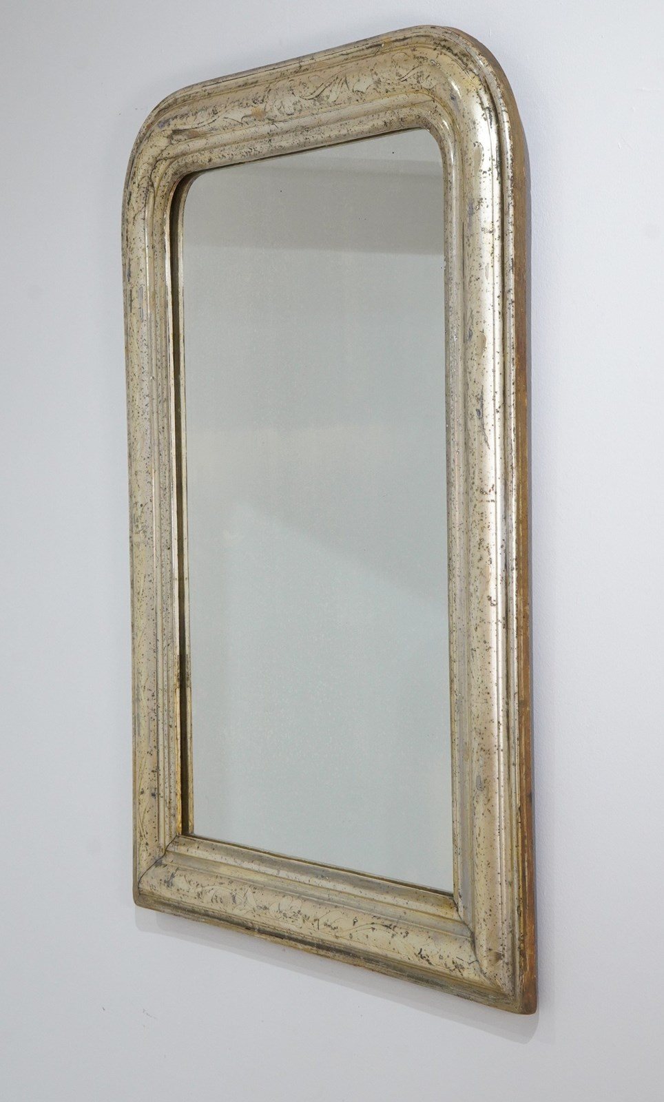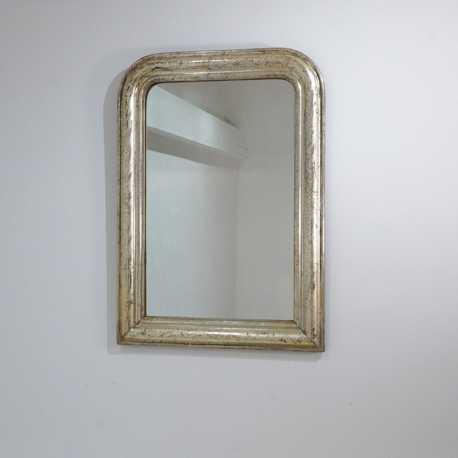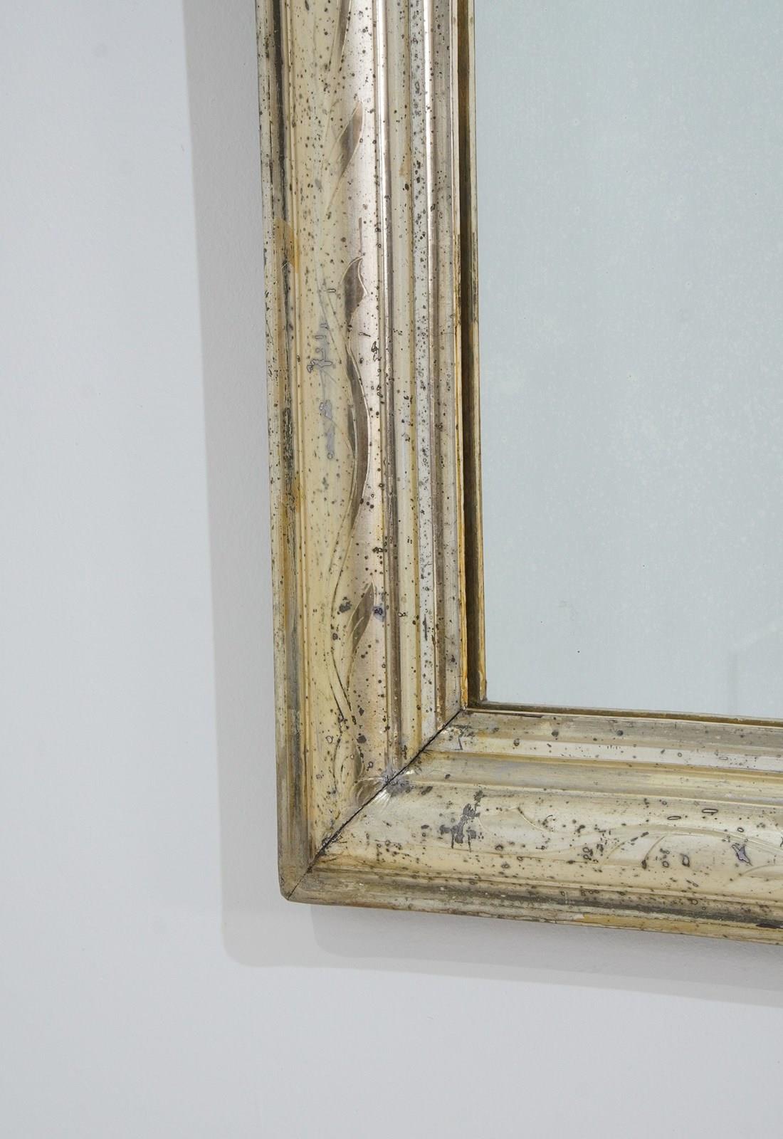 An early 19th century French silver leaf wall mirror. Over the past near two centuries the silver leaf has worn a little in places revealing specs of the dark charcoal grey base coat creating an atmospheric combination of silver and grey, a neat pattern of entwining leaves etched finely into the surface add to the historical charm of this already unique little mirror. Small areas of tarnishing to the silver contrast with the bright lustre. Perfect original mirror plate with no blemishes. Original sound backboards. France circa 1840.