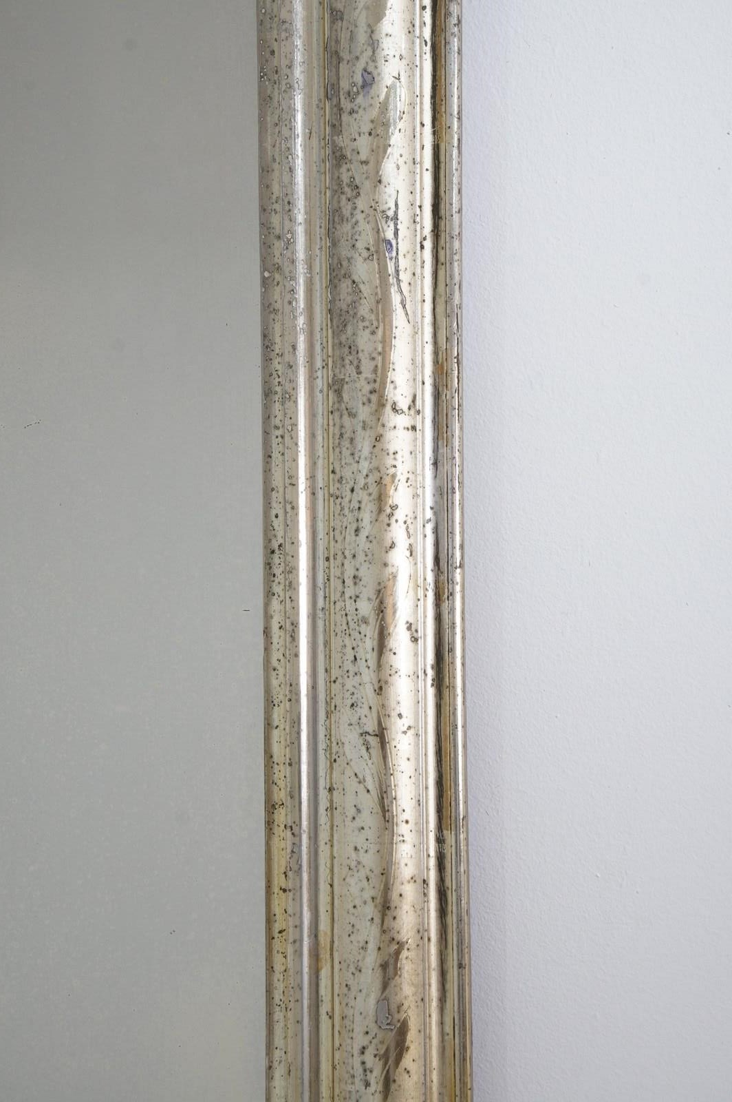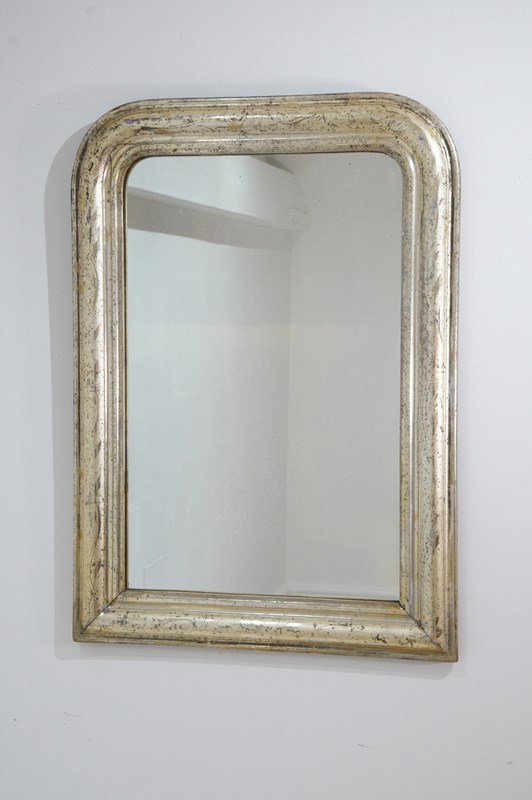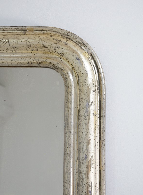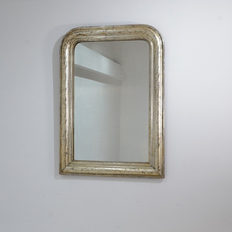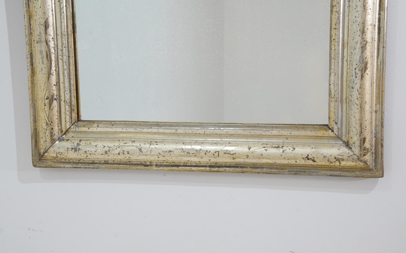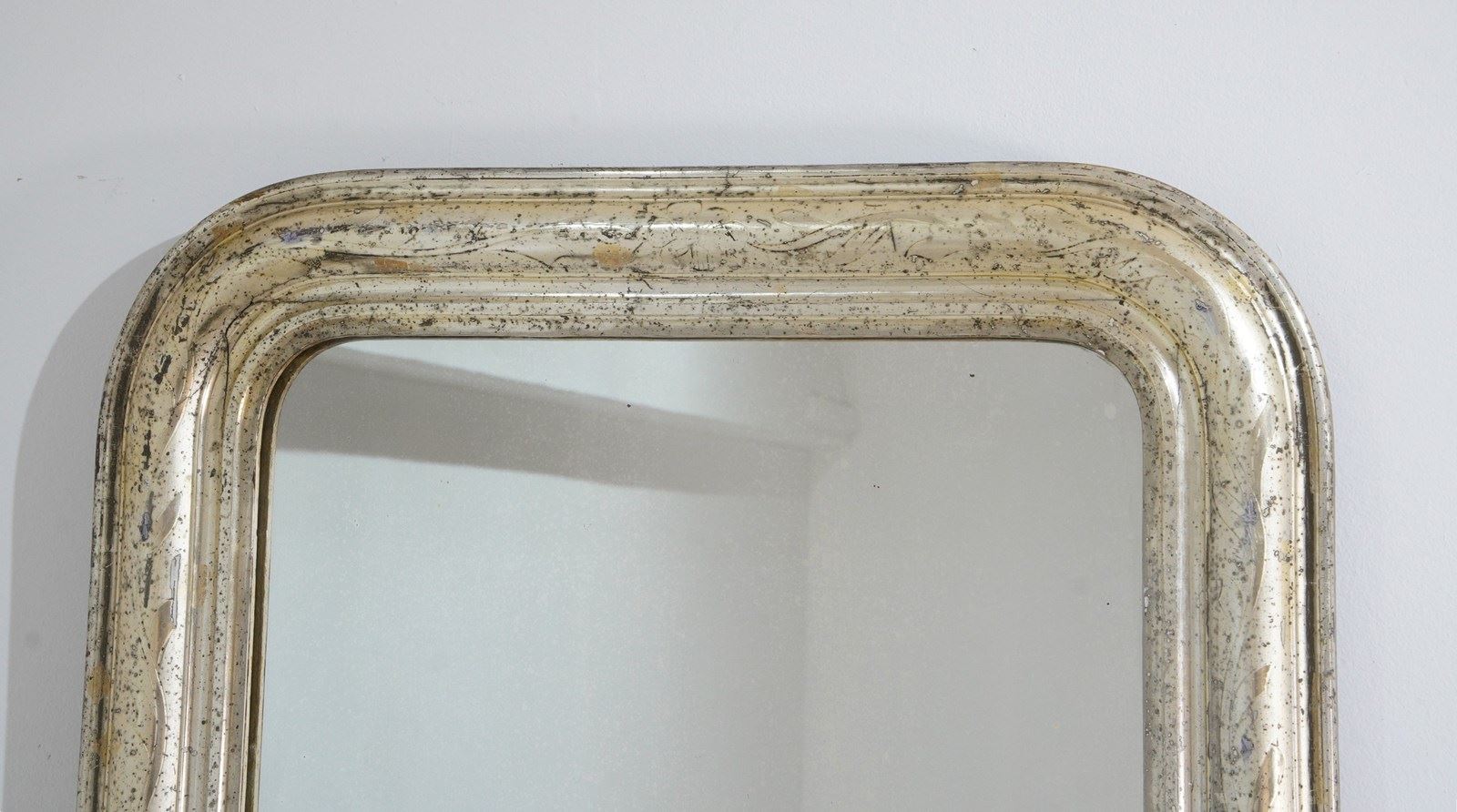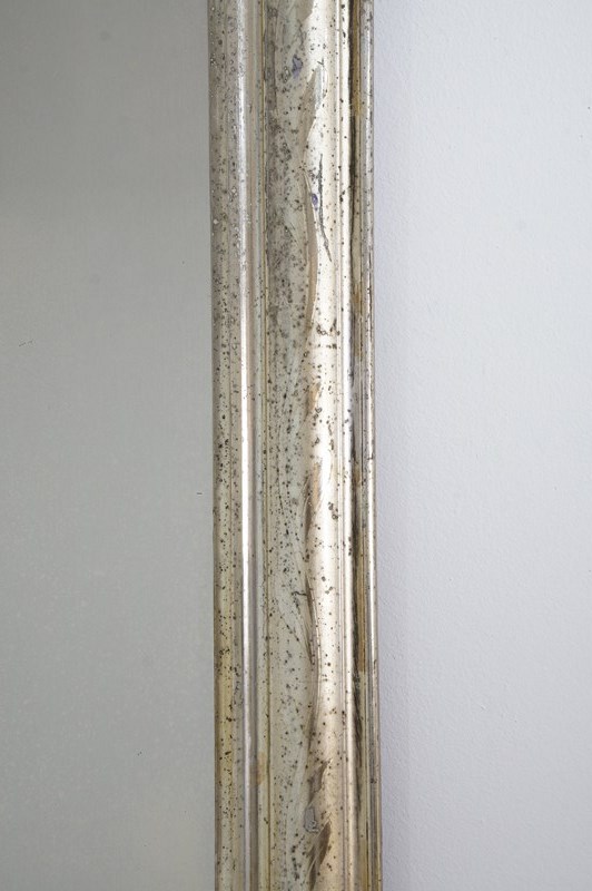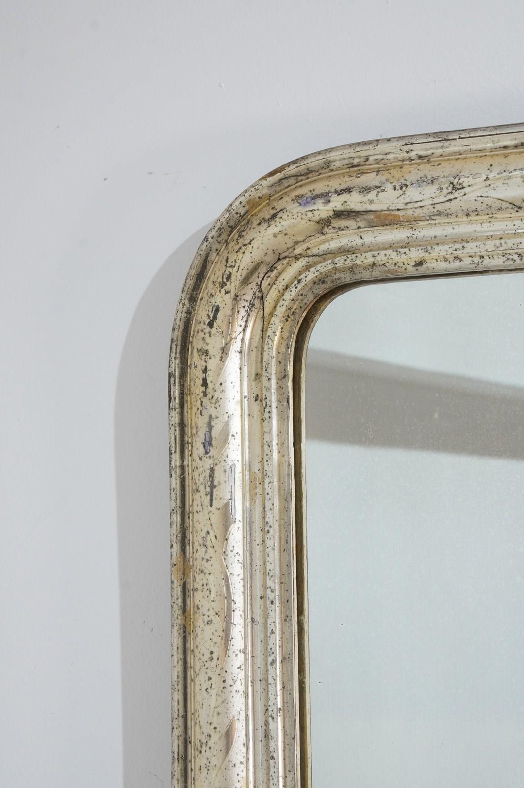 An early 19th century French silver leaf wall mirror. Over the past near two centuries the silver leaf has worn a little in places revealing specs of the dark charcoal grey base coat creating an atmospheric combination of silver and grey, a neat pattern of entwining leaves etched finely into the surface add to the historical charm of this already unique little mirror. Small areas of tarnishing to the silver contrast with the bright lustre. Perfect original mirror plate with no blemishes. Original sound backboards. France circa 1840.
