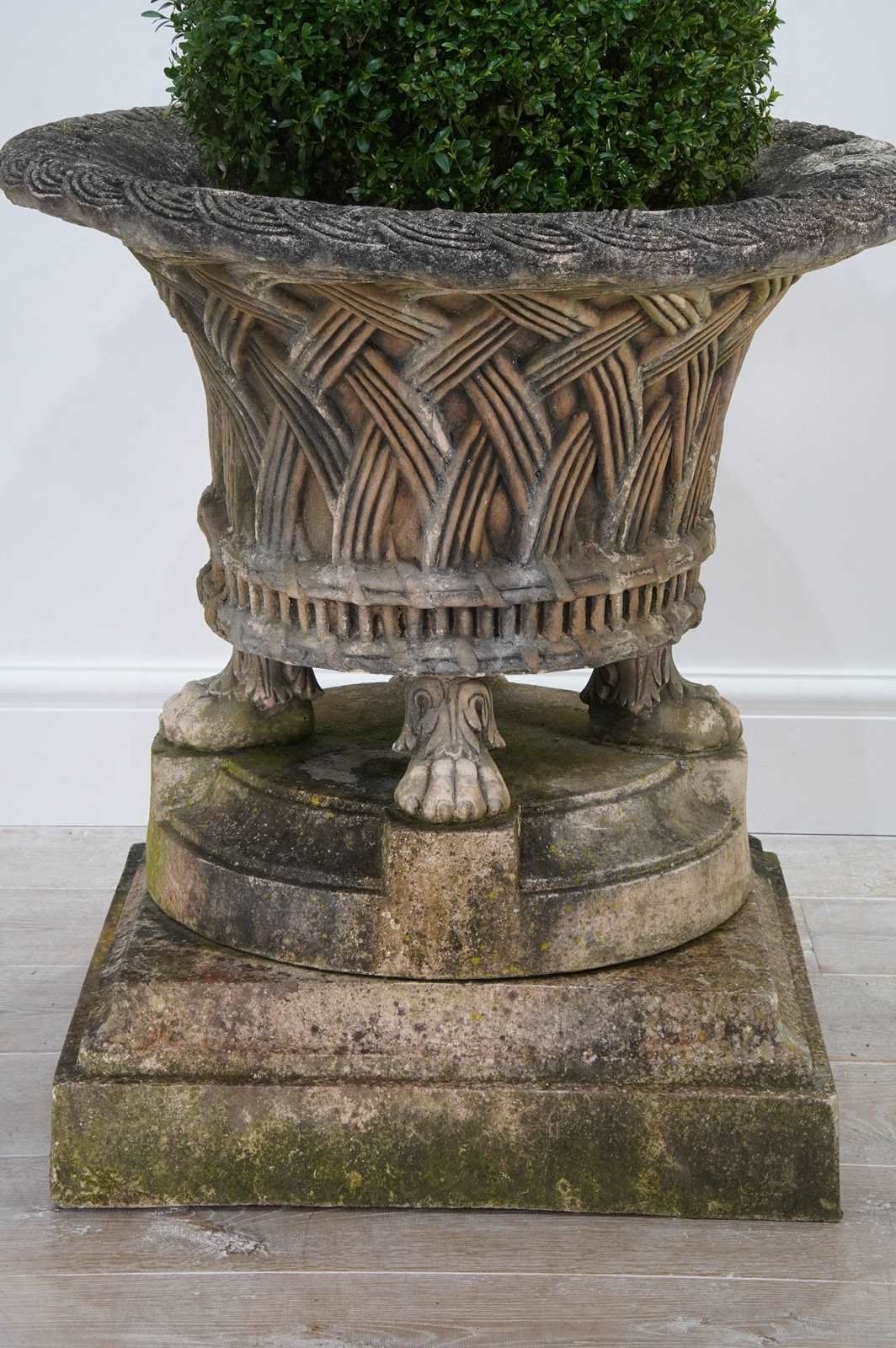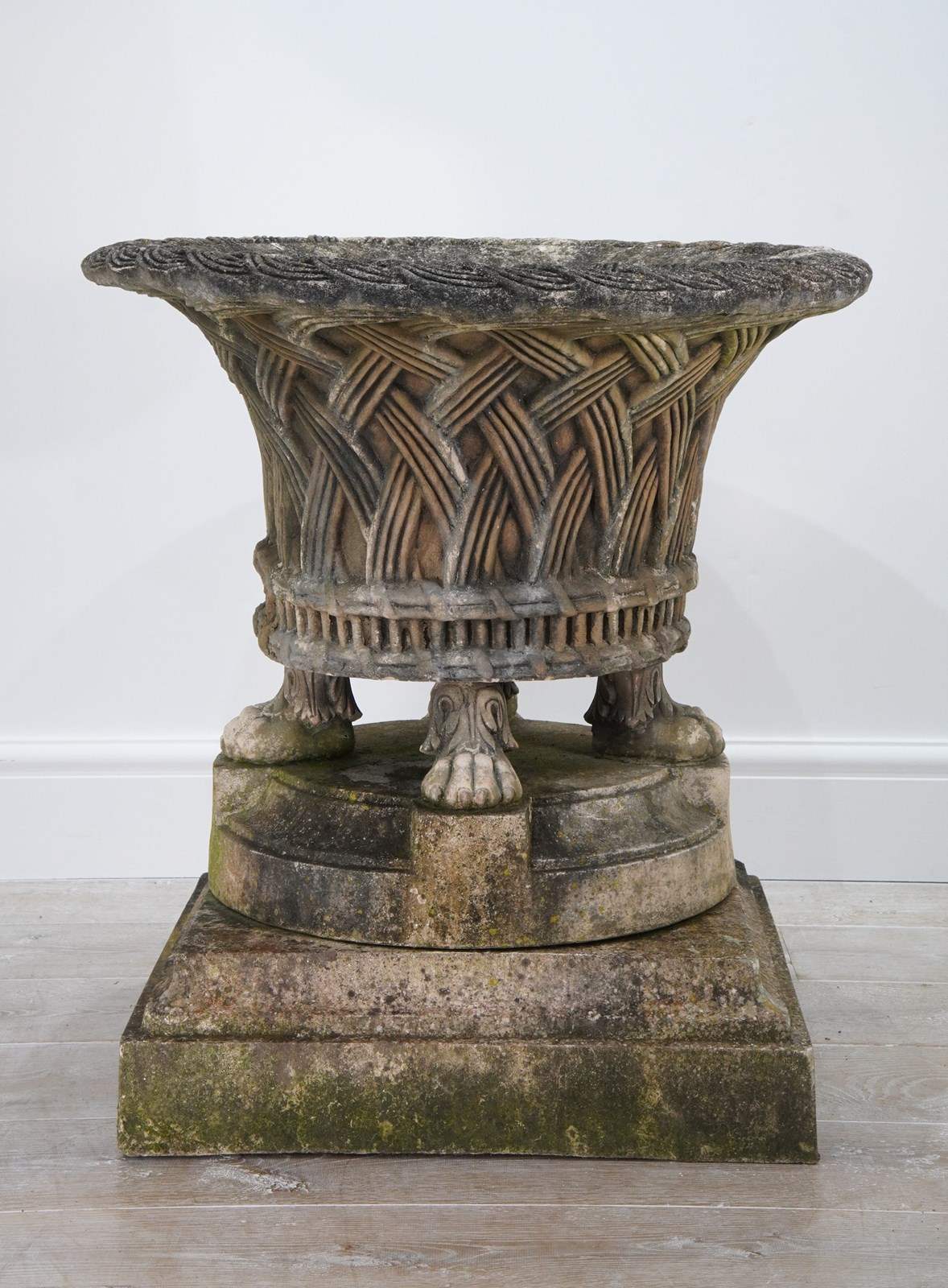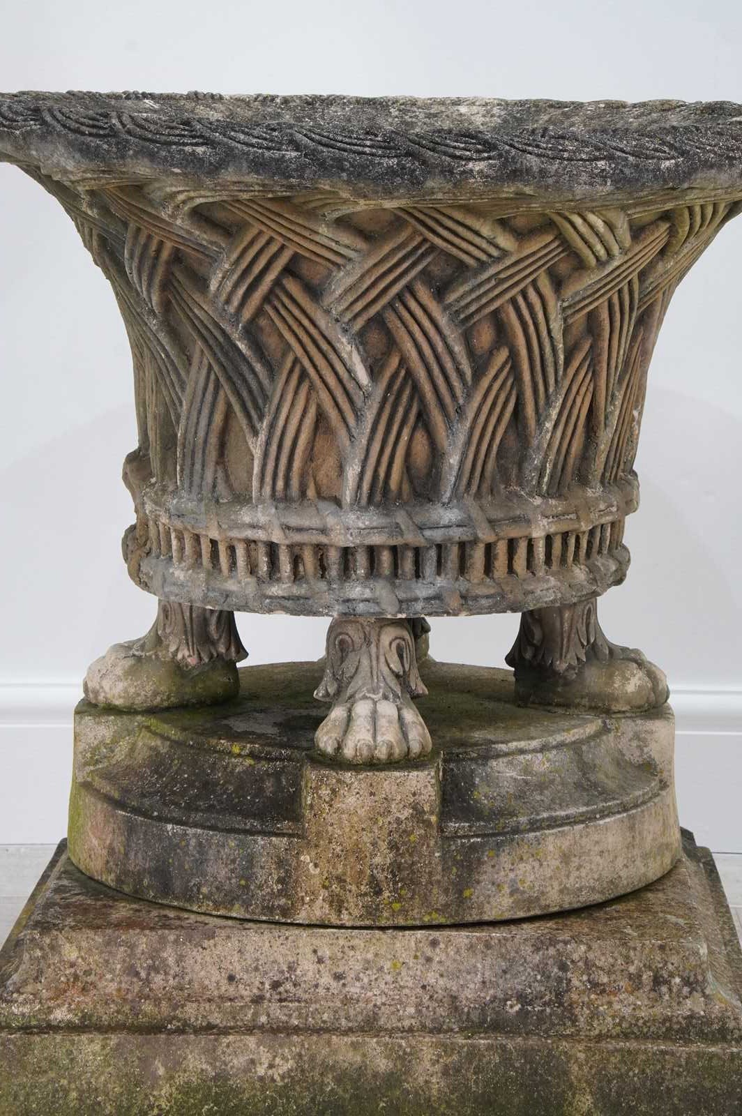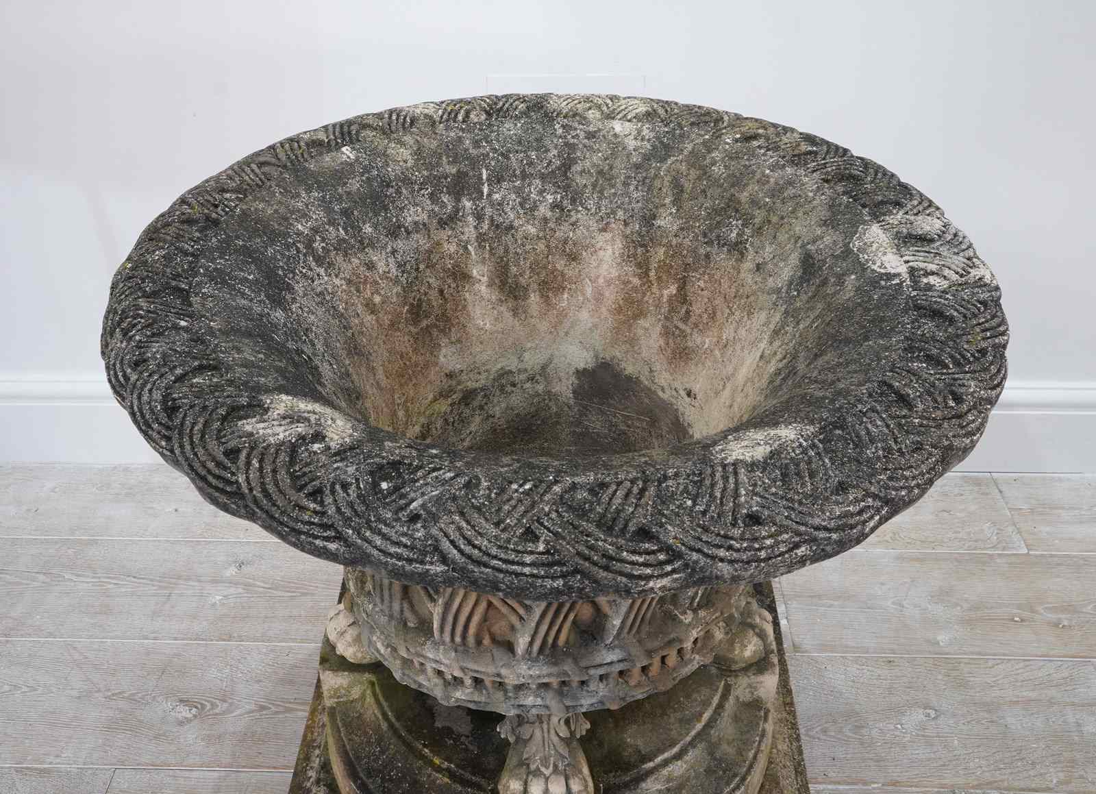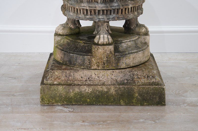 It stands securely on four Lion’s paw feet above a circular base and finally raised upon a separate square plinth. Nicely patinated with a fine covering of moss and lichen. Perfect for the terrace, formal town or country garden.