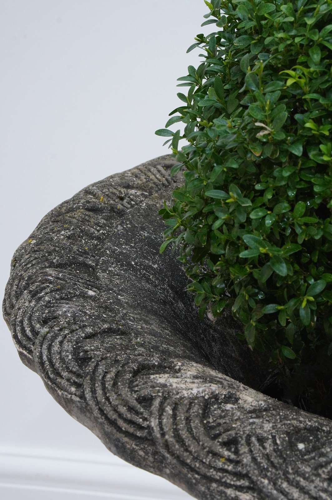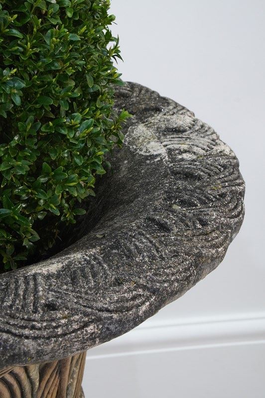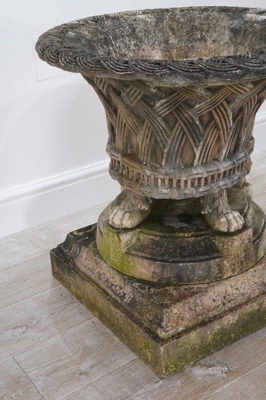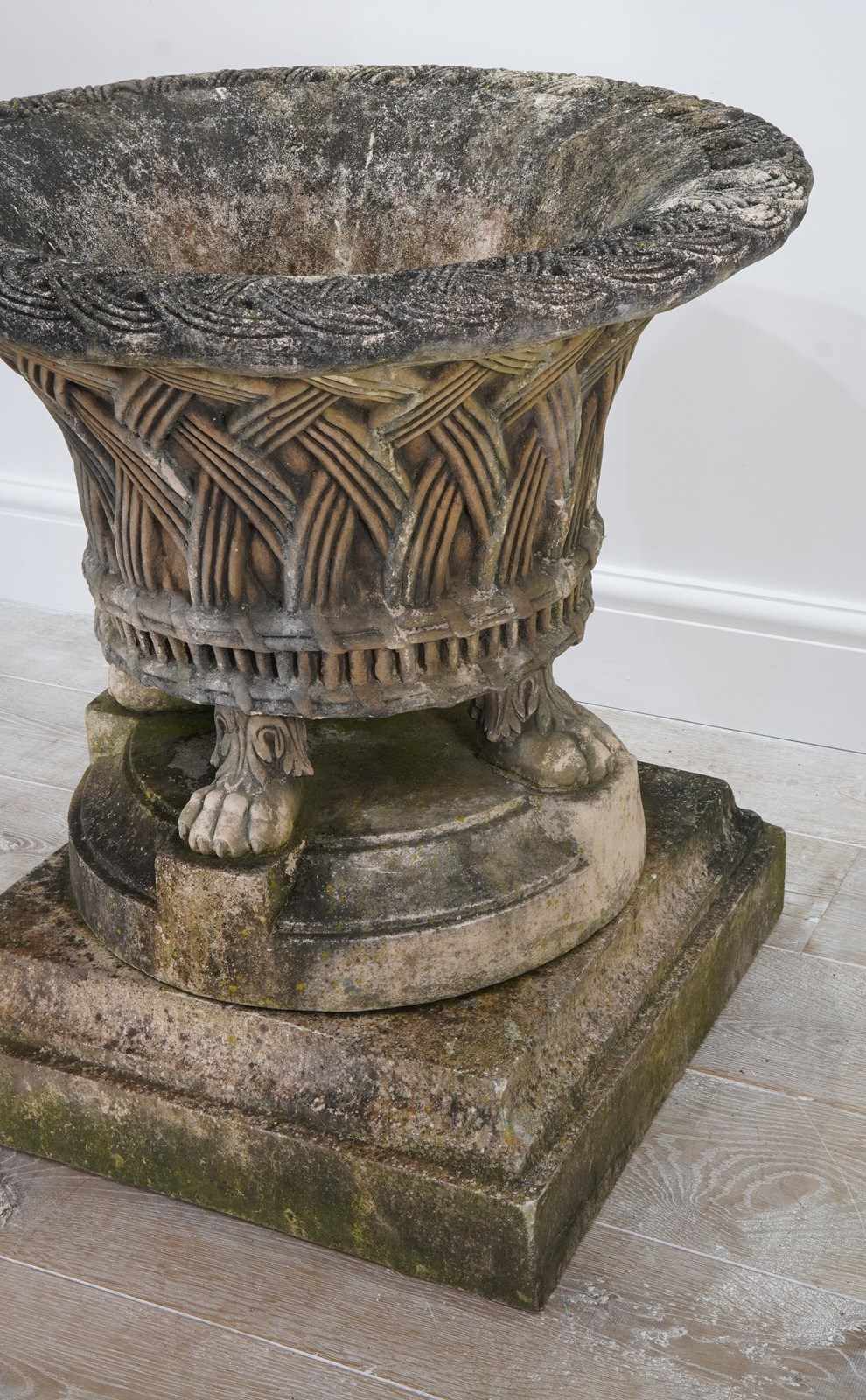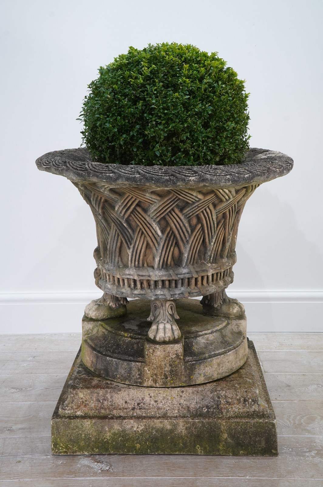 It stands securely on four Lion’s paw feet above a circular base and finally raised upon a separate square plinth. Nicely patinated with a fine covering of moss and lichen. Perfect for the terrace, formal town or country garden.