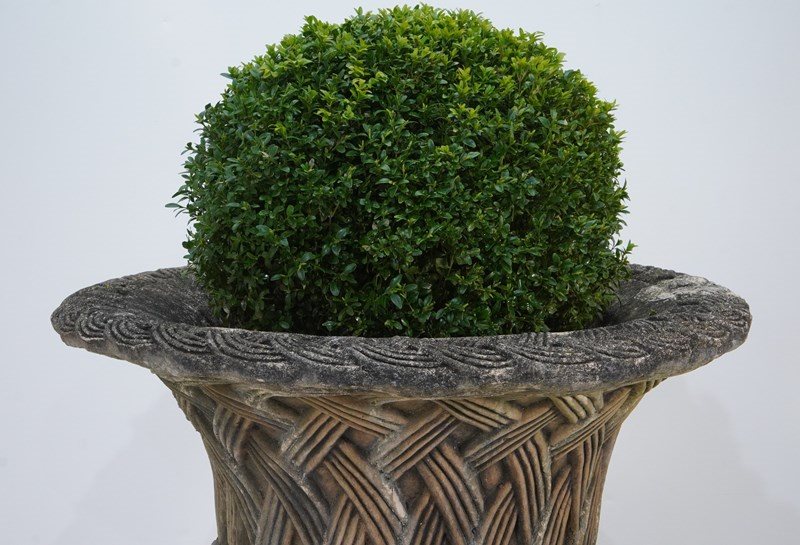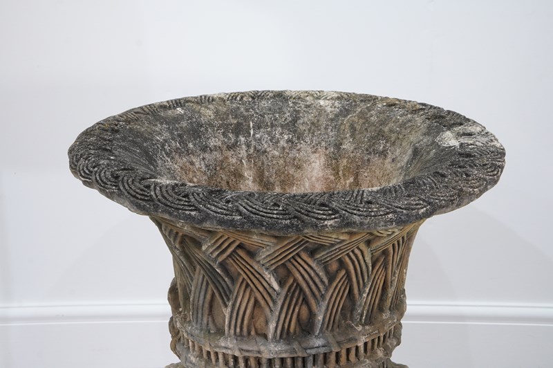A super large centre piece composite garden urn. This handsome urn is decorated with a raised latticework design to the outer surface, the same design repeated around the top rim but on a smaller scale.