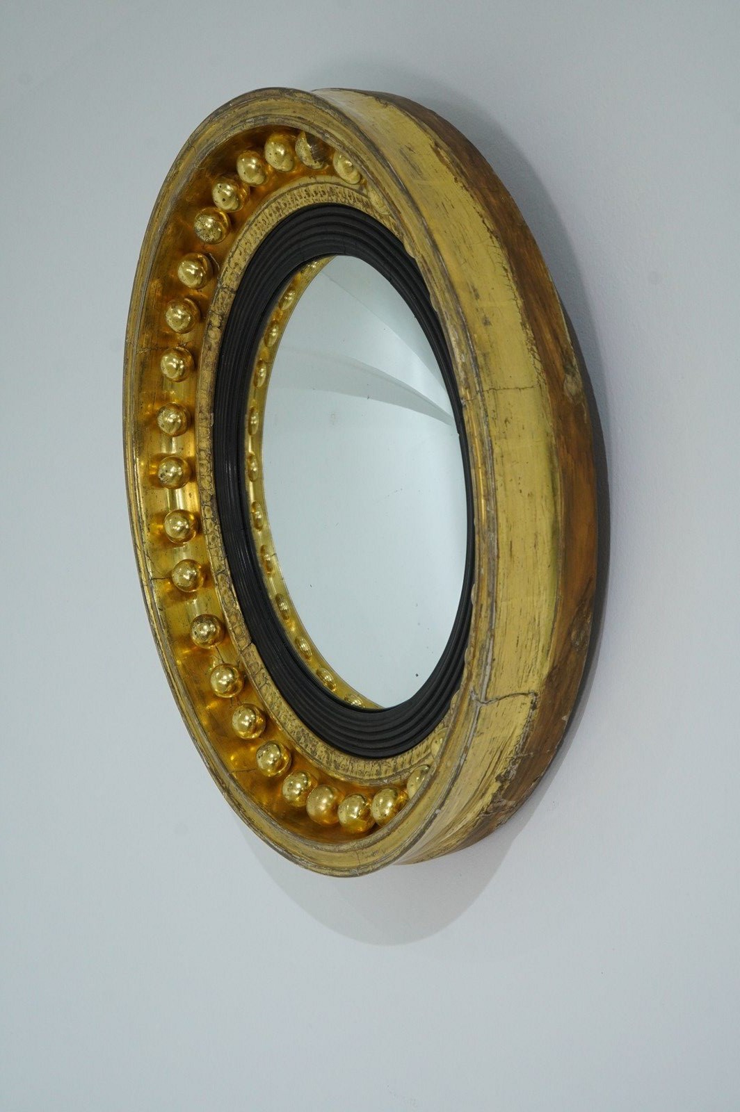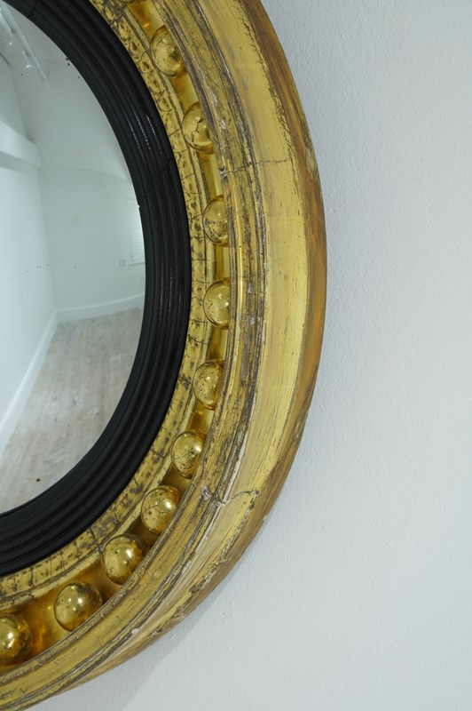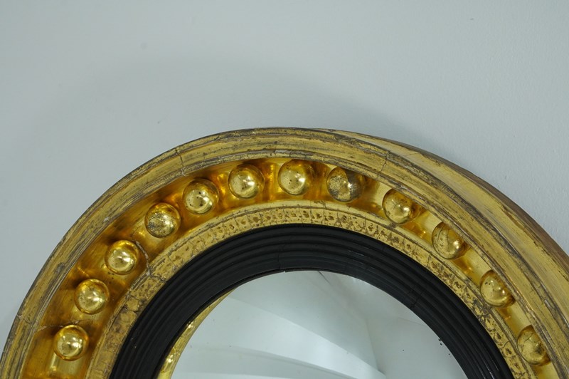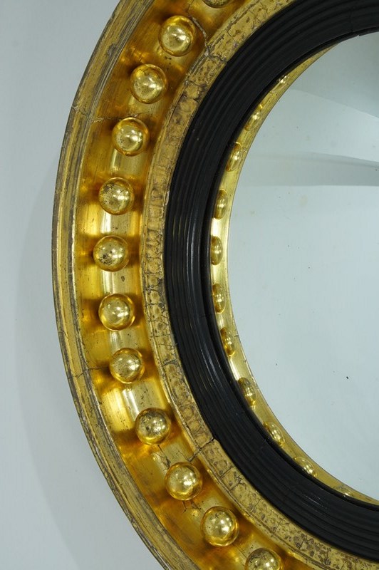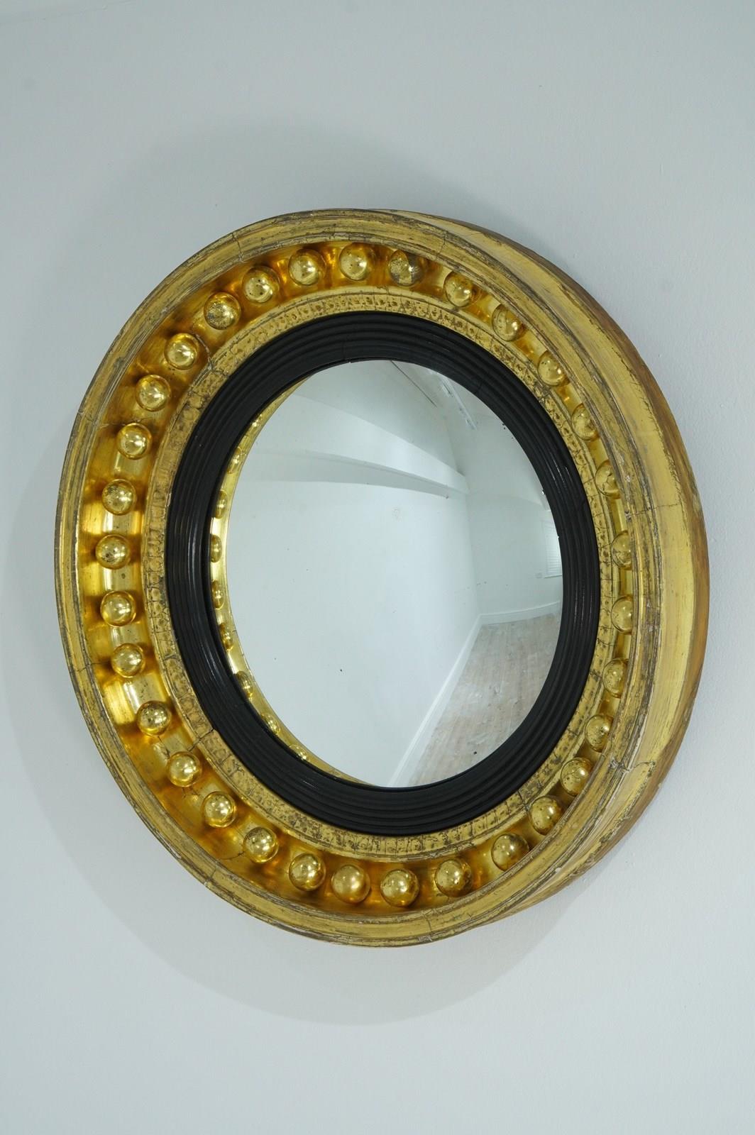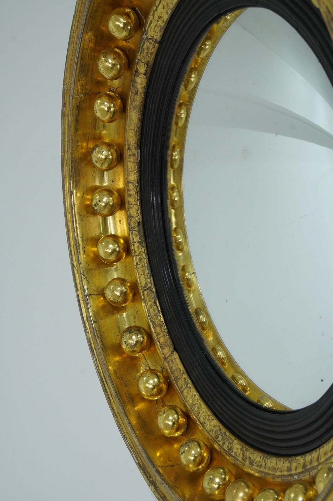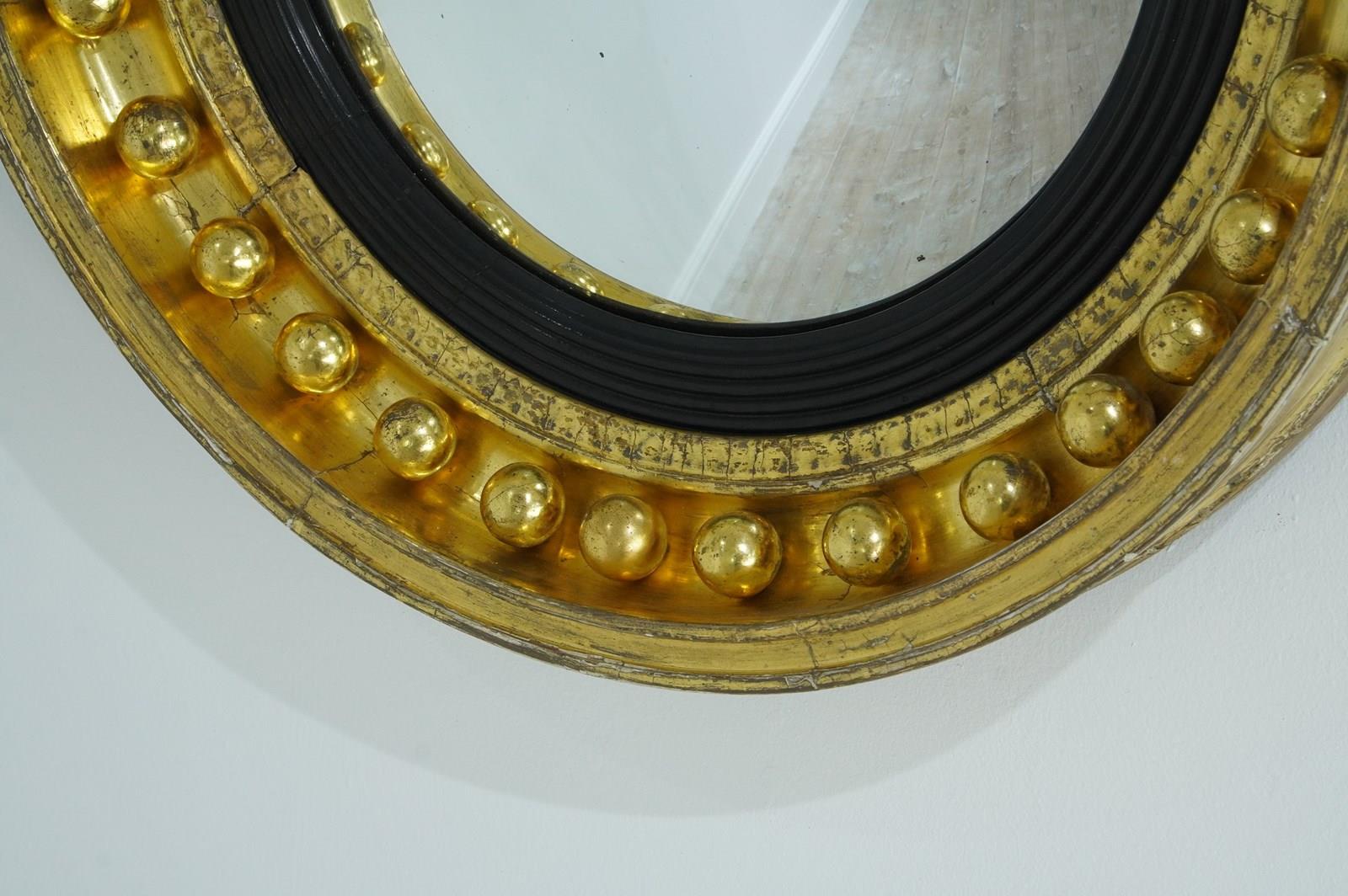 The wide circular frame to this iconic English Regency wall mirror is decorated with a staggering thirty two plump gilded spheres. The original gilding is particularly lush and bright with just a little surface wear. The mirror profile is deep with original bright gilding. An inner ebonised slip frames the original pristine convex mirror. Regency circular wall mirror circa 1820.