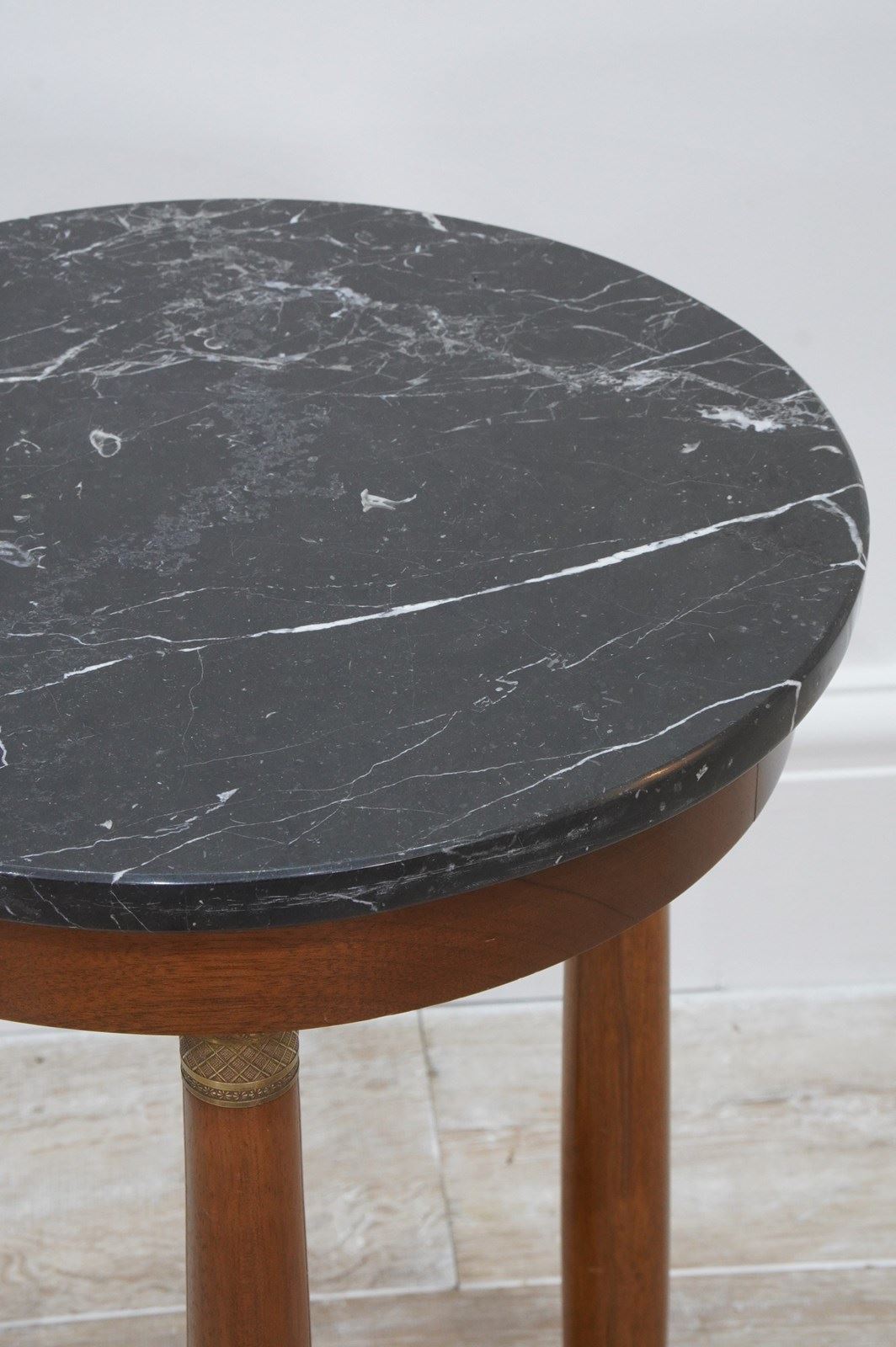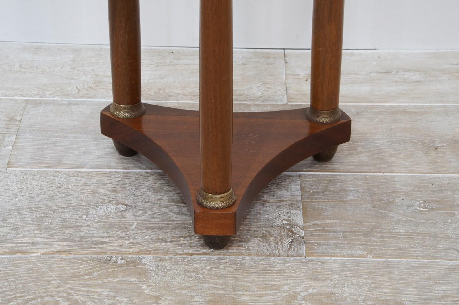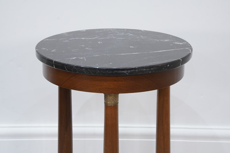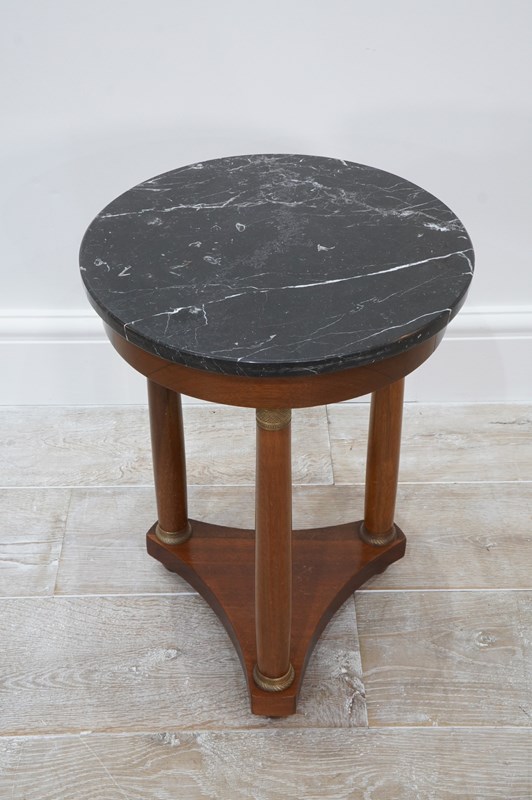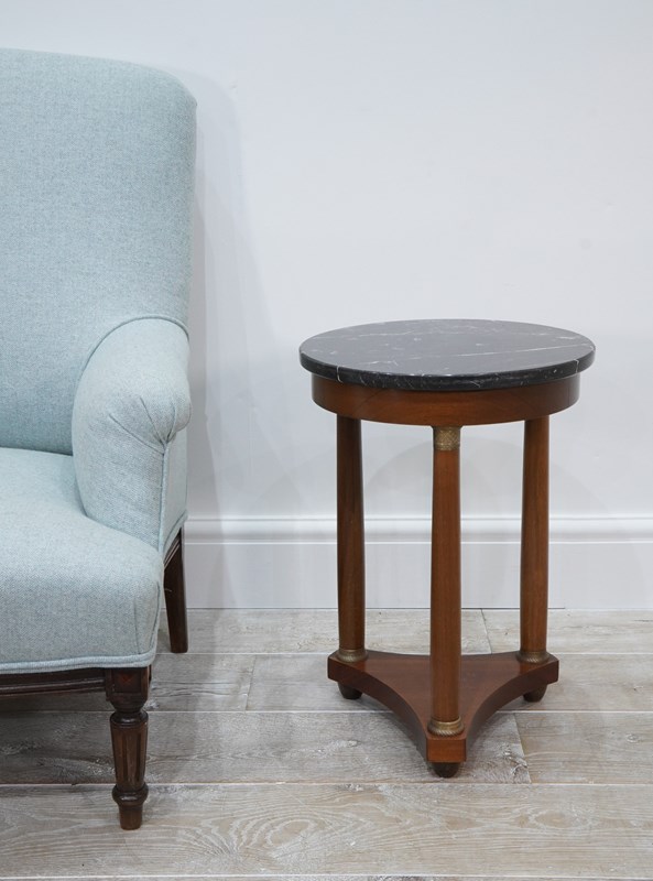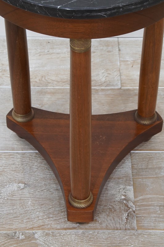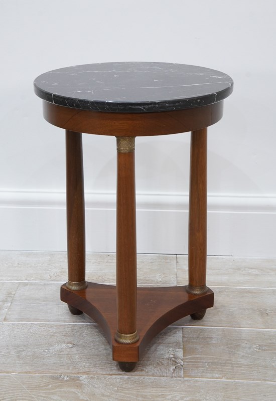 A small French marble topped Guéridon. The circular veined marble top sits neatly upon three polished mahogany legs each one embellished with patinated brass capitals. Perfect for use as a small wine / side table. France circa 1900.