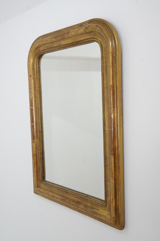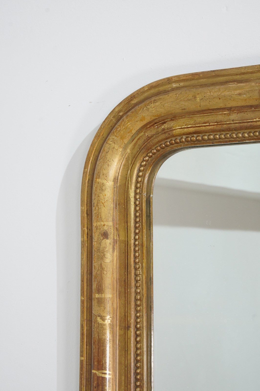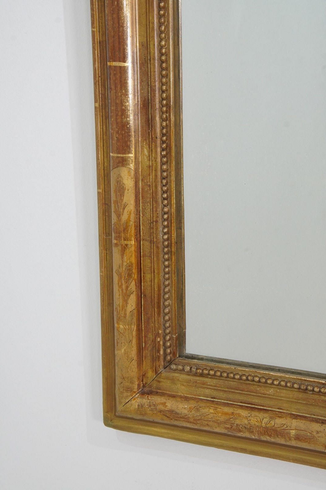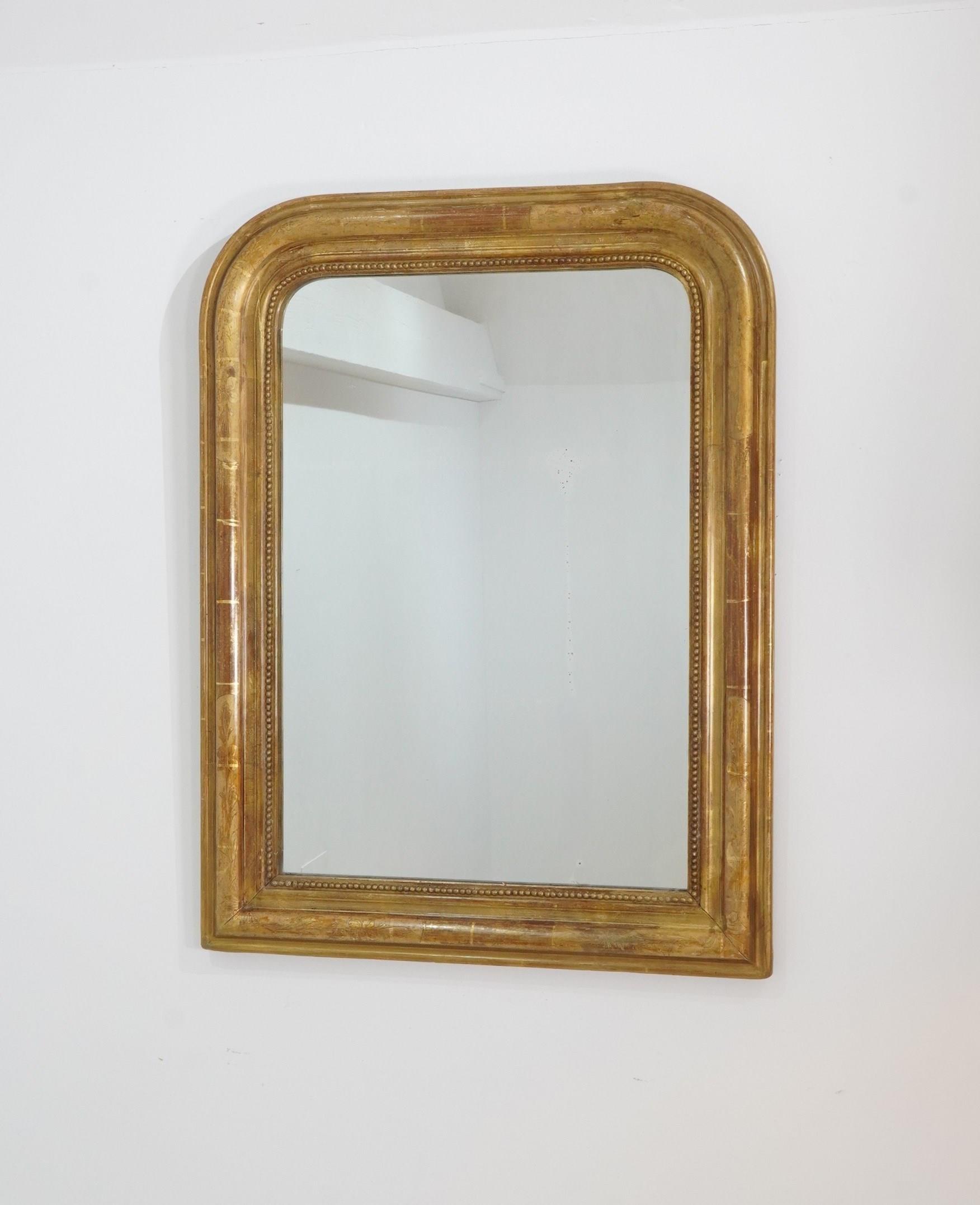 A 19th century French gilded wall mirror. The original gilding to this iconic little mirror has dulled somewhat over the past century and more creating a rich earthy surface. The frame is decorated with a neat etched design of flowers and leaves entwining within separate panels now faded with atmospheric charm. Original glass plate with minor foxing. Original backboards.