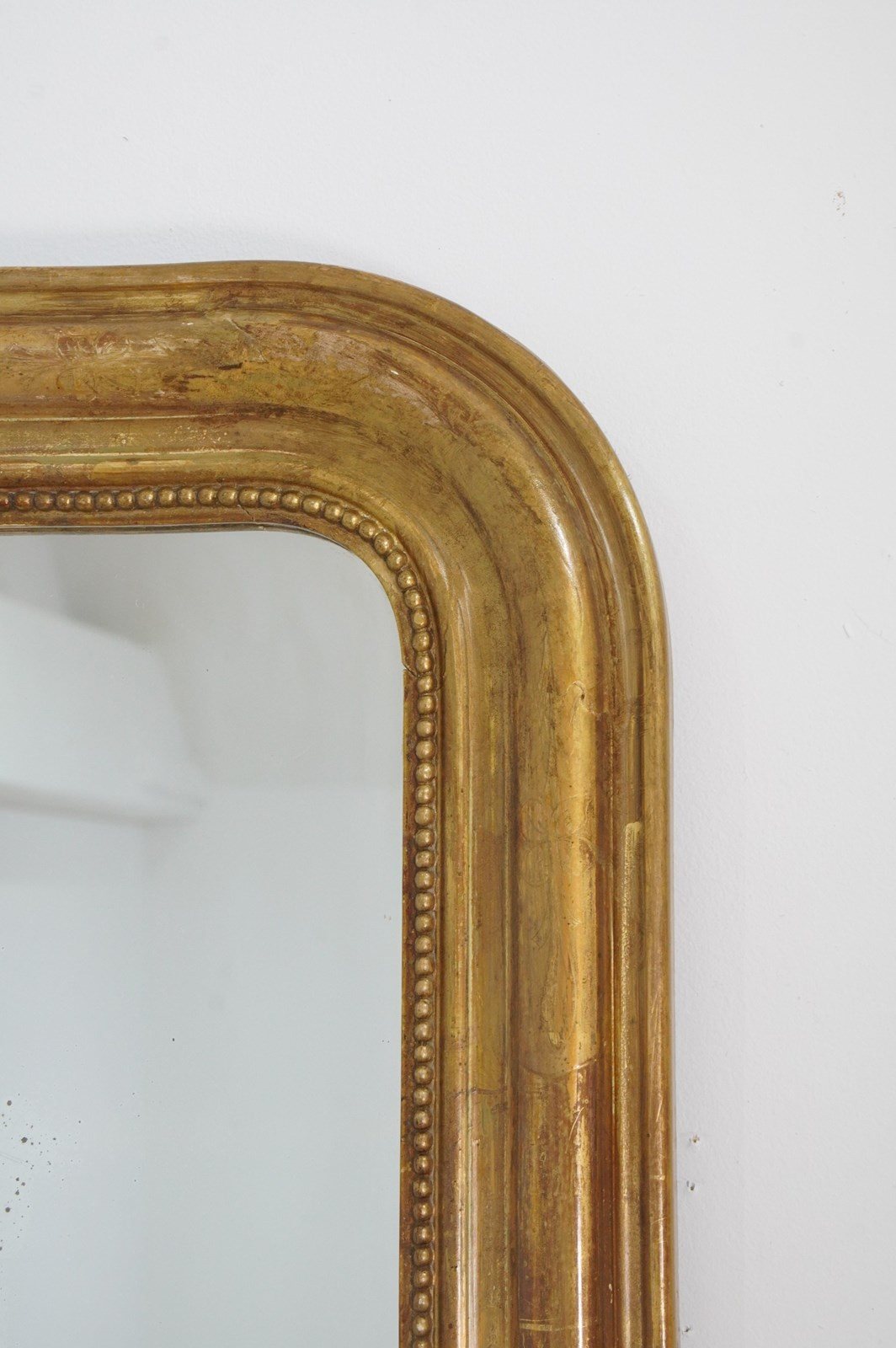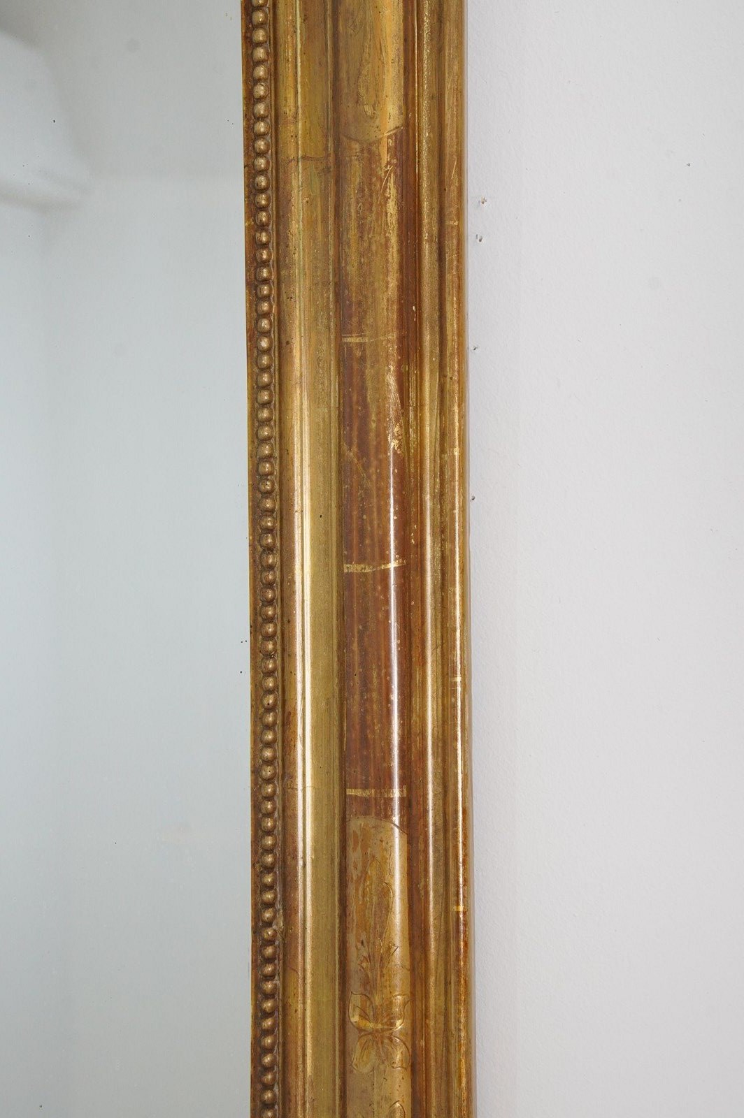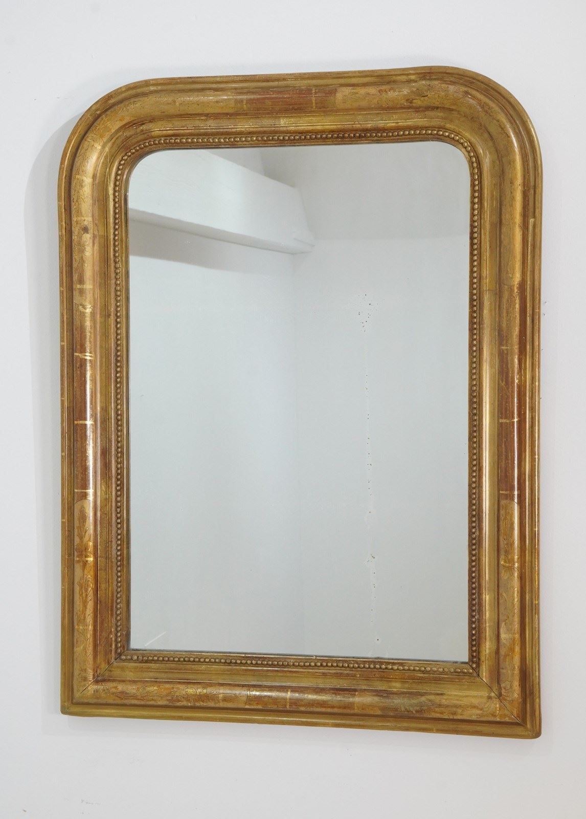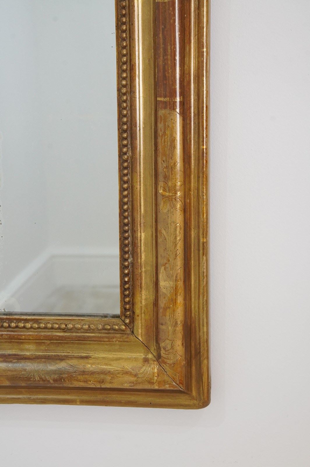 A 19th century French gilded wall mirror. The original gilding to this iconic little mirror has dulled somewhat over the past century and more creating a rich earthy surface. The frame is decorated with a neat etched design of flowers and leaves entwining within separate panels now faded with atmospheric charm. Original glass plate with minor foxing. Original backboards.