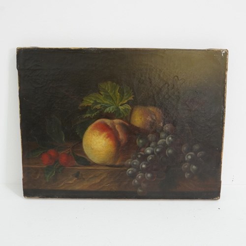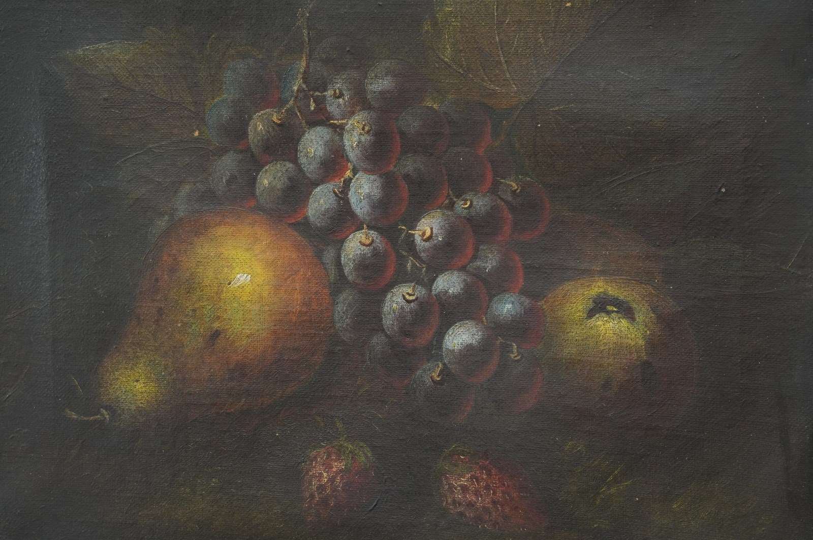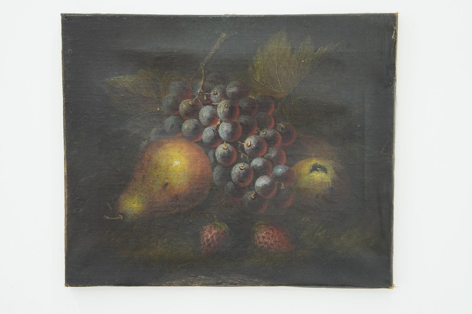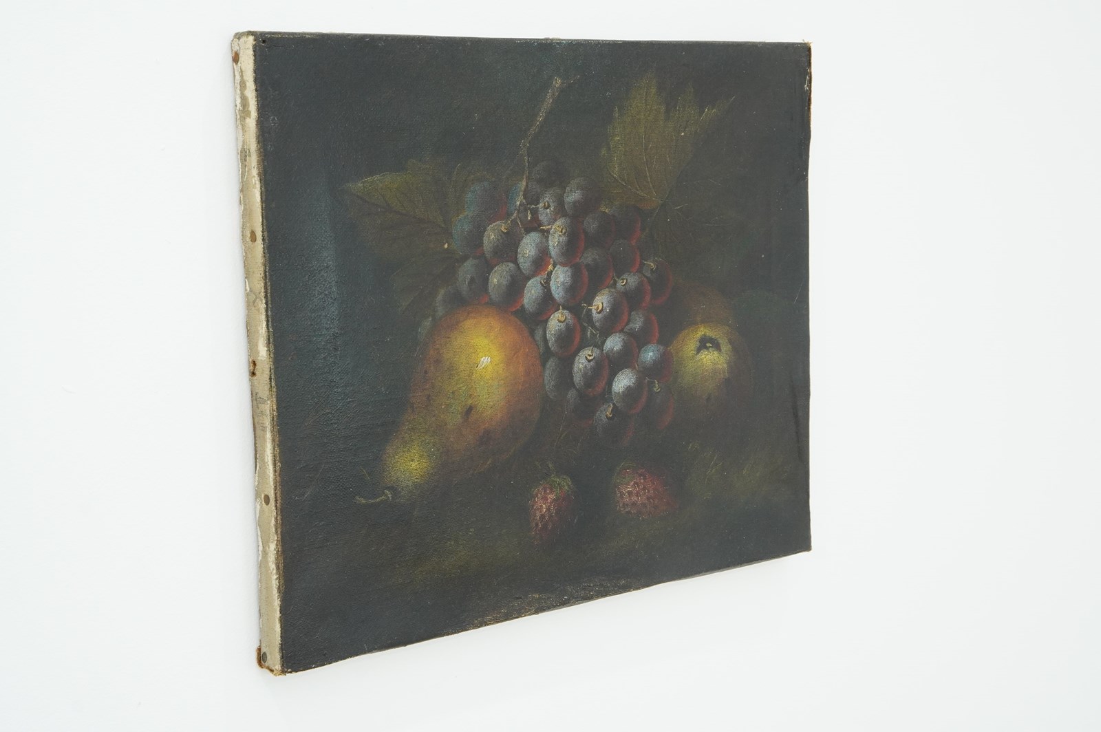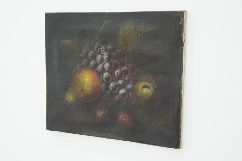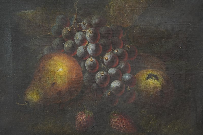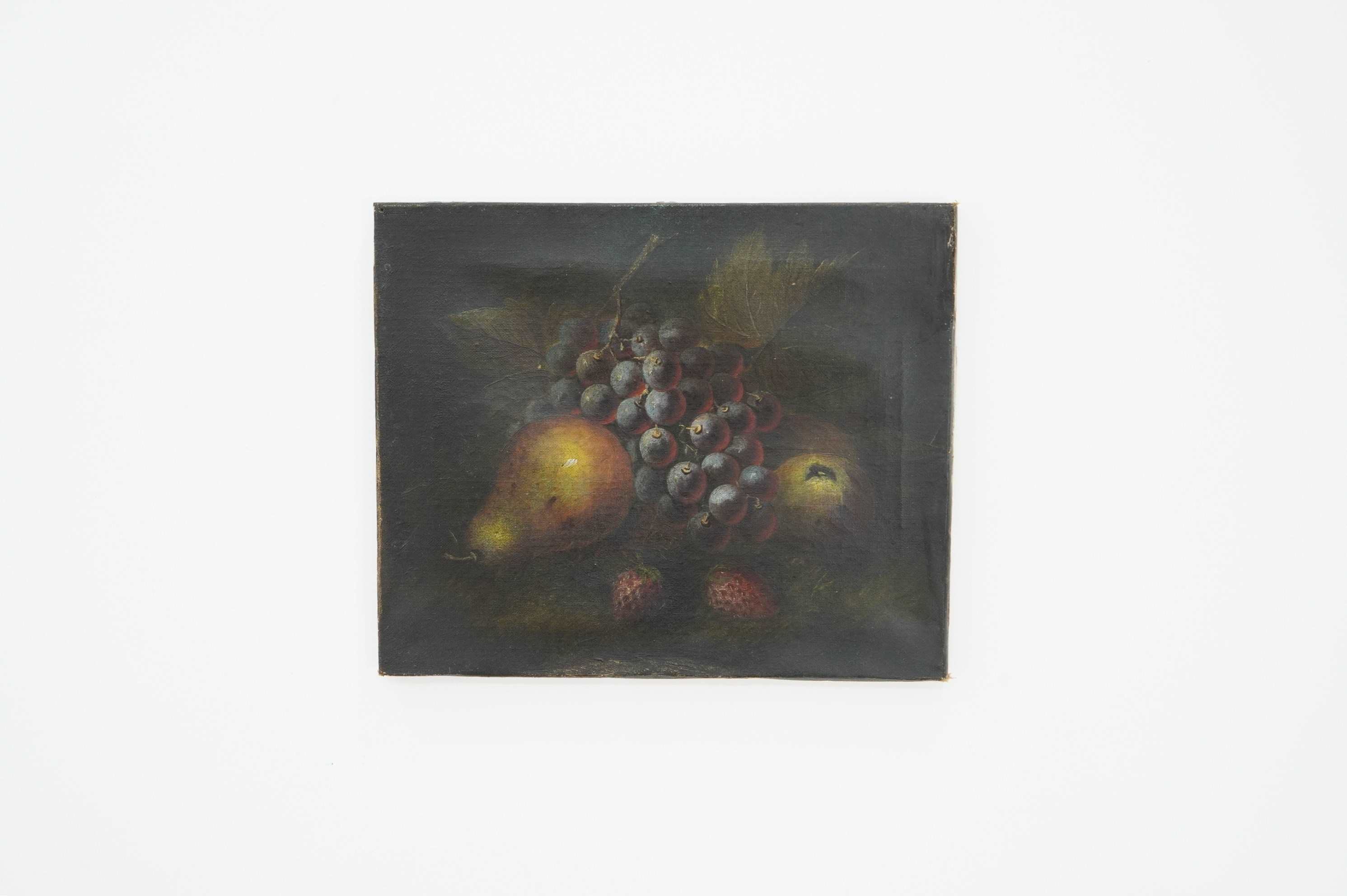A 19th century oil on canvas. Black grapes, a ripe Pear with juicy strawberries to the foreground all set against a deep atmospheric background. Good original condition with no damage to the canvas.