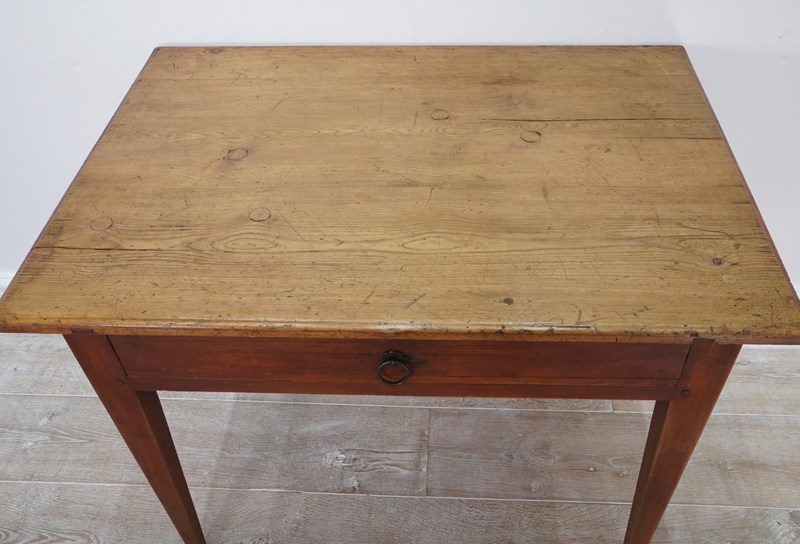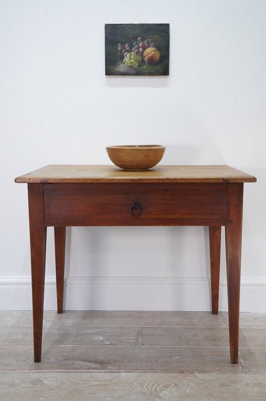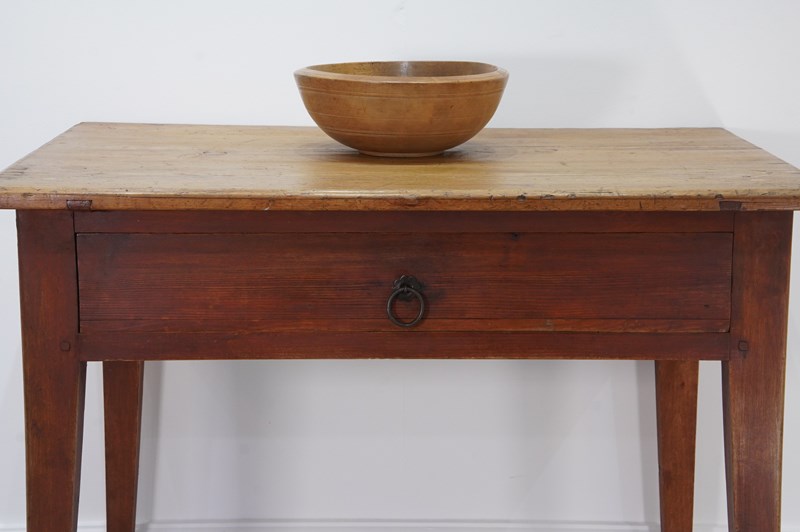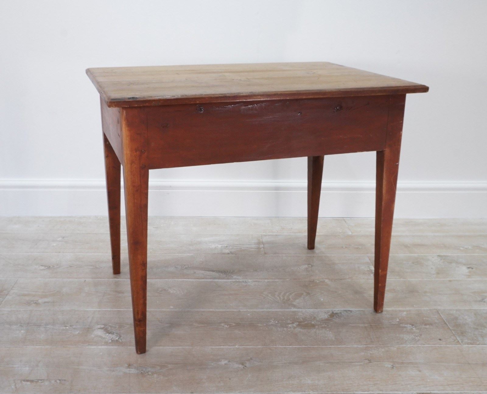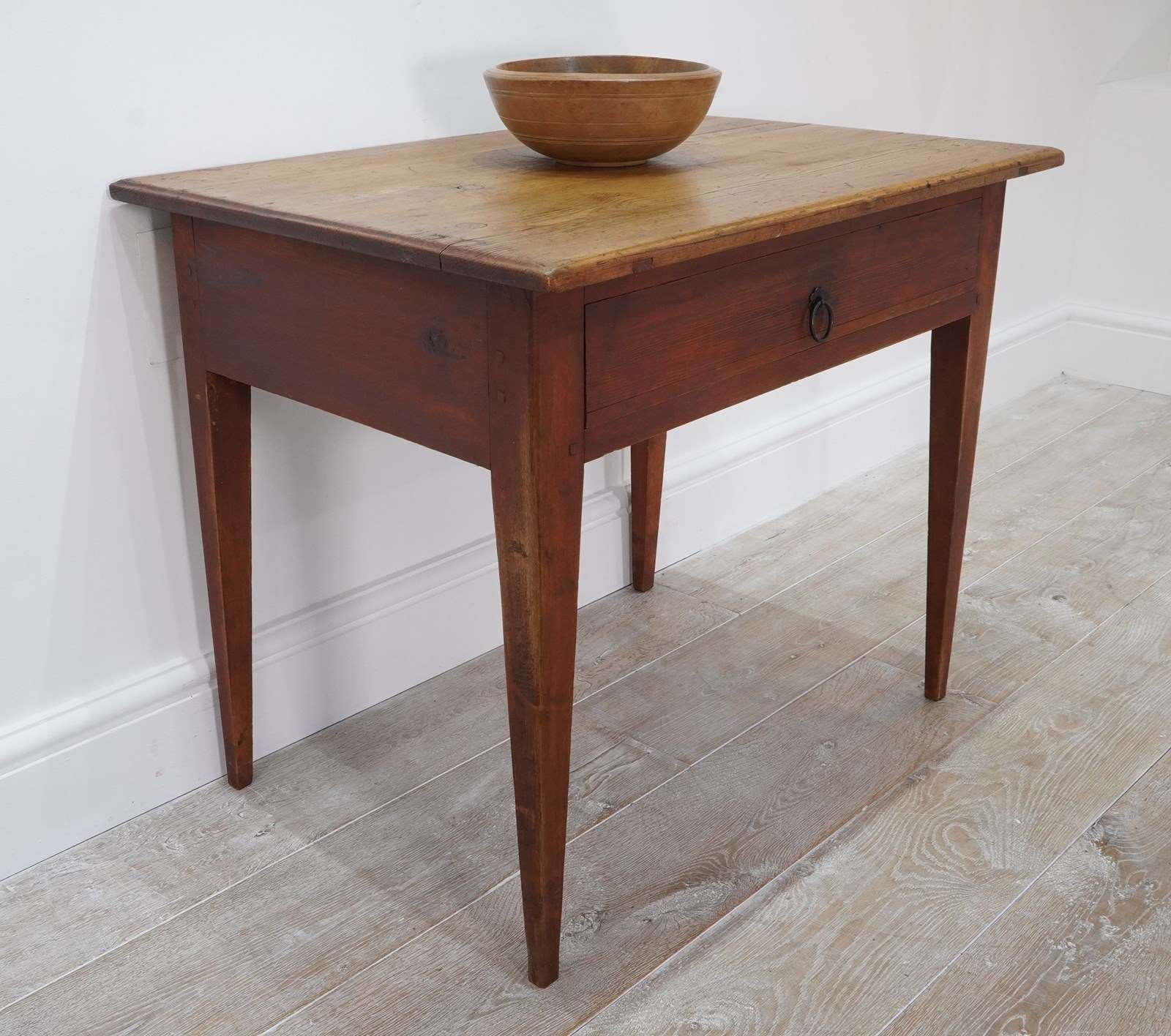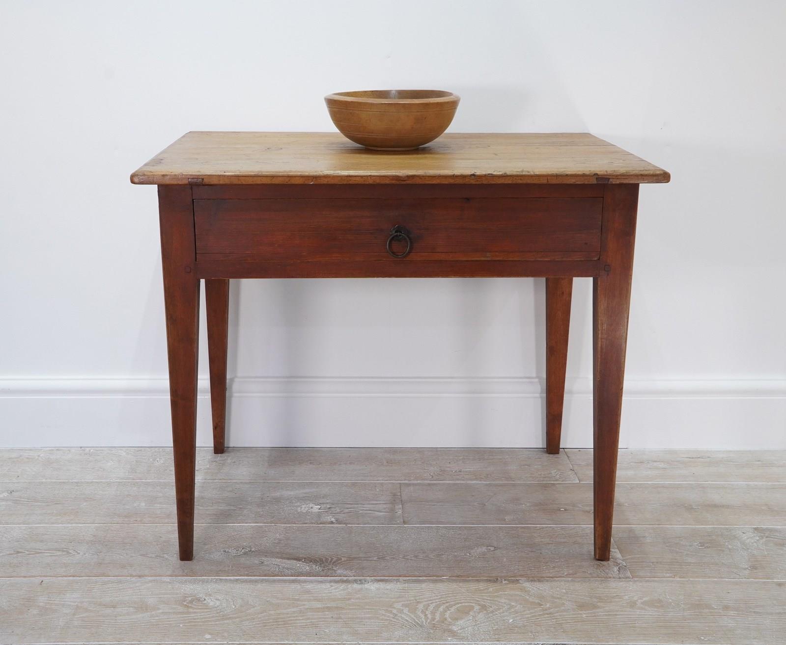 A 19th century pine side table with original painted base. The top to this pretty table boasts a richly polished surface, there are some age related scuffs and blemishes as one would expect only adding to its history and charm . It holds a wide deep drawer below with one or two obligatory ink stains inside suggesting it may have been used as a desk at some point in time. It stands firmly on four square tapering legs each retaining the original terracotta paint colour now gently worn in places revealing the seasoned pine beneath. A neat Swedish pine side table / desk.