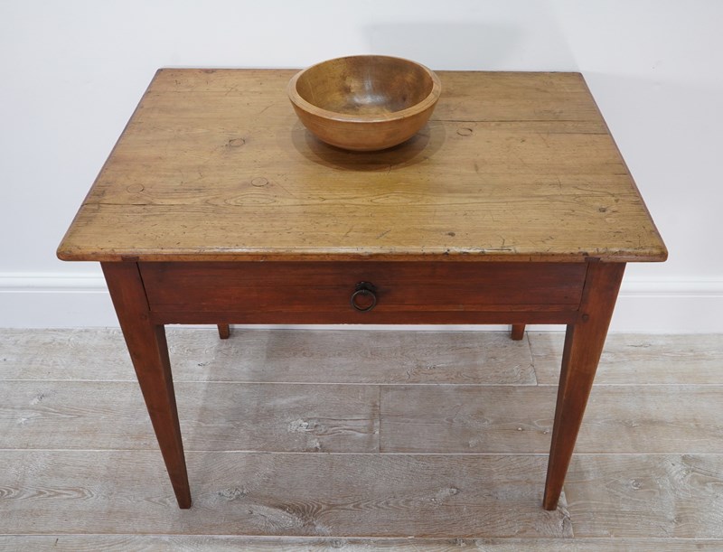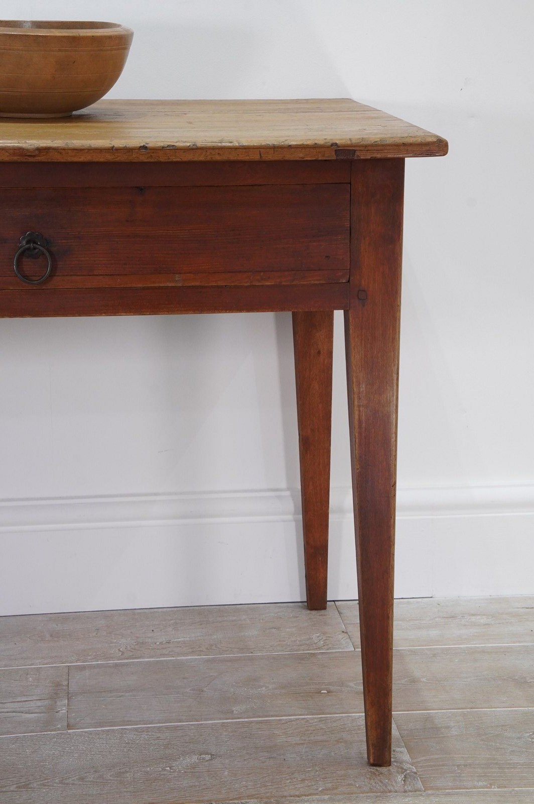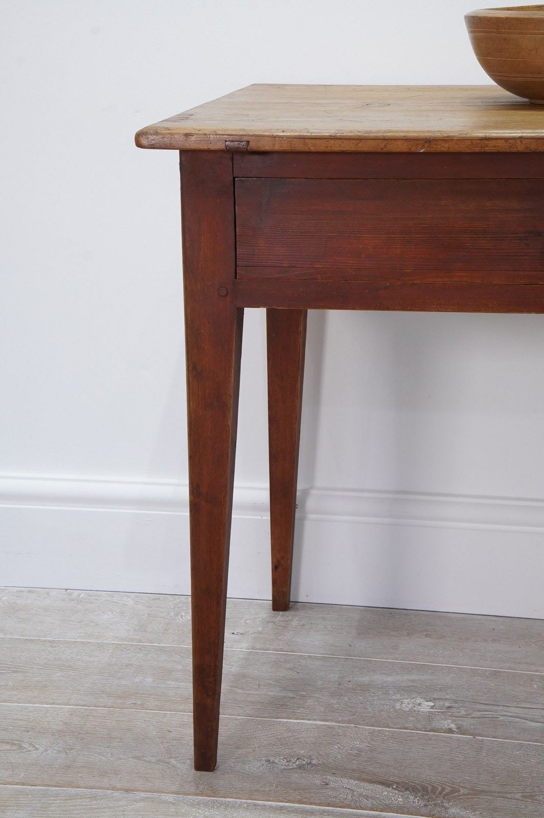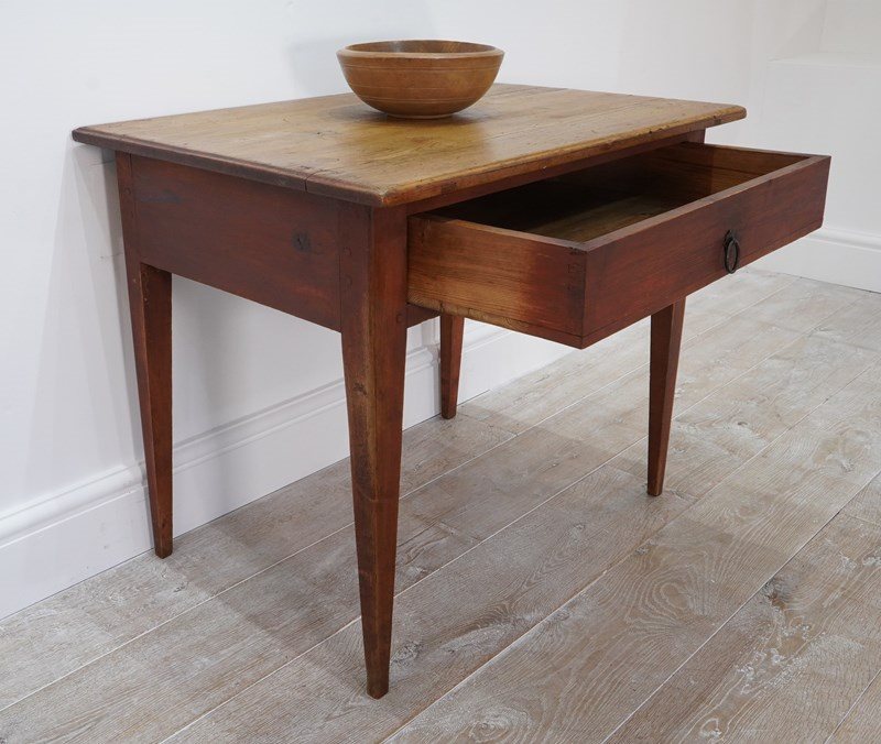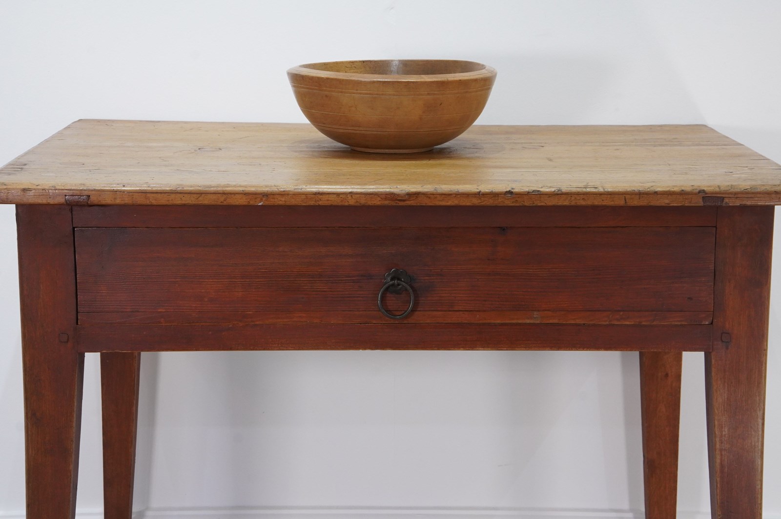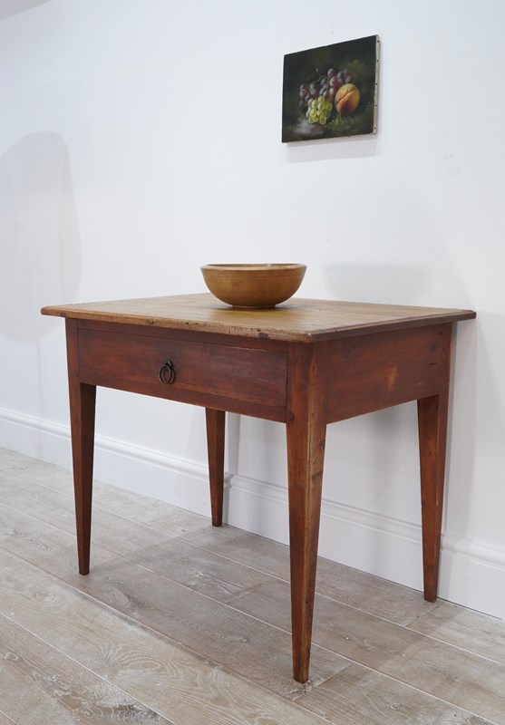 A 19th century pine side table with original painted base. The top to this pretty table boasts a richly polished surface, there are some age related scuffs and blemishes as one would expect only adding to its history and charm . It holds a wide deep drawer below with one or two obligatory ink stains inside suggesting it may have been used as a desk at some point in time. It stands firmly on four square tapering legs each retaining the original terracotta paint colour now gently worn in places revealing the seasoned pine beneath. A neat Swedish pine side table / desk.
