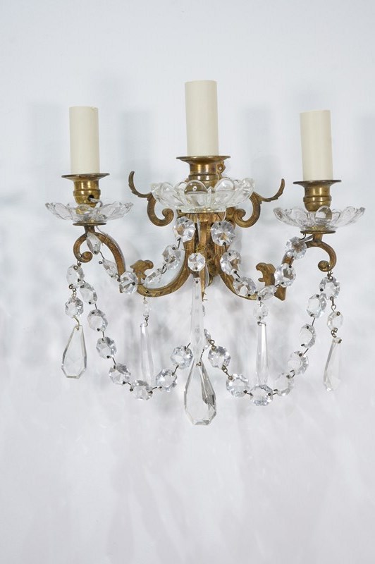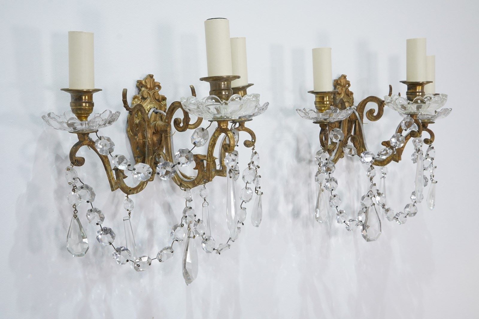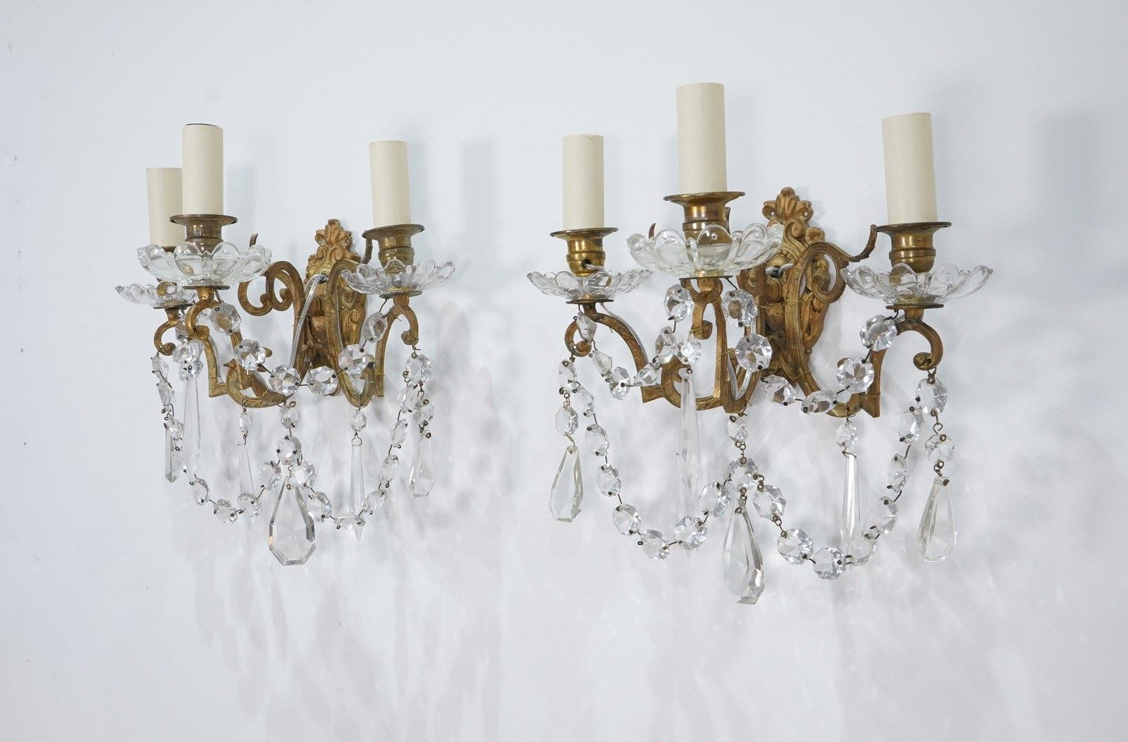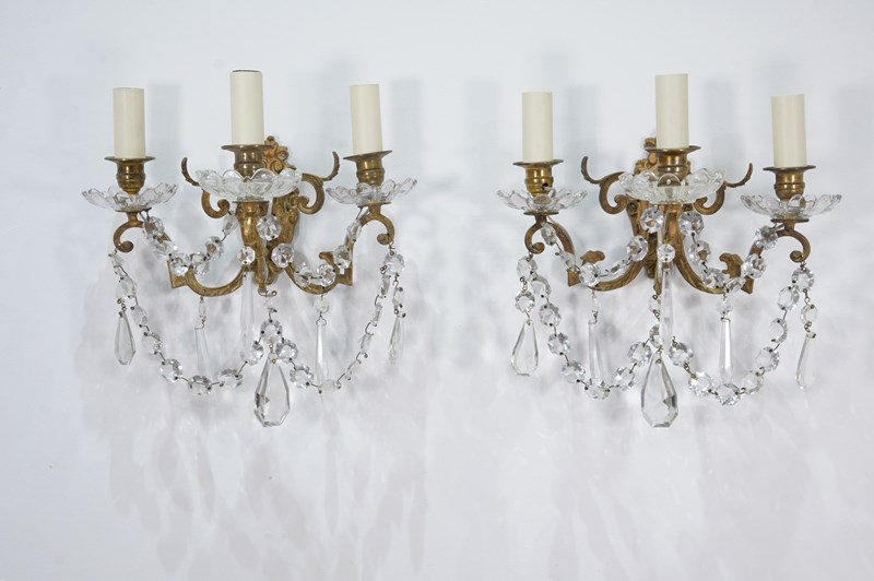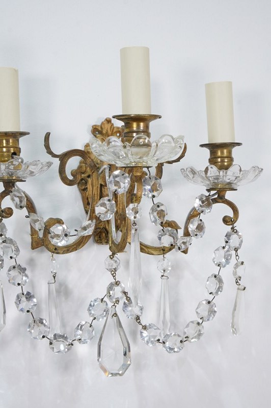A pretty pair of Napoleon 111 triple branch wall sconces. Each of the three branches terminate with a faux cream card candle light fitting with fluted glass bobèche . The sconces are dressed with swags of faceted glass beads complimented with rows of cut glass icicles and lozenges. Originally for use with candles, now wired for electricity to modern day safety standards ready for immediate installation. Patinated Gilt Bronze wall sconces. France circa 1860.