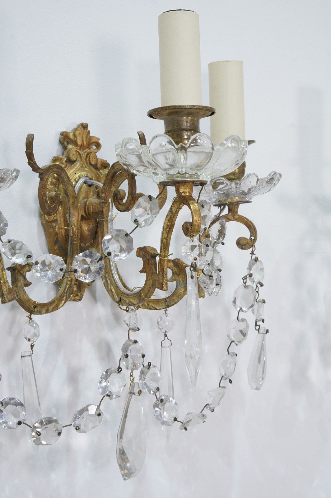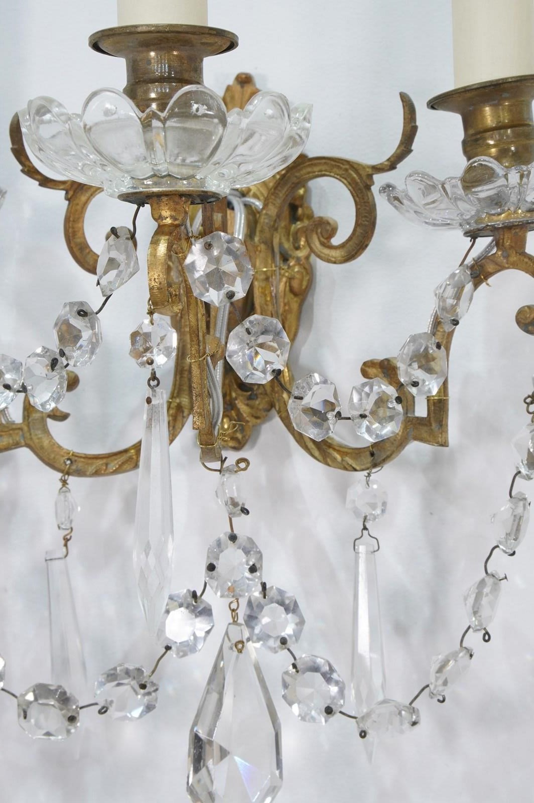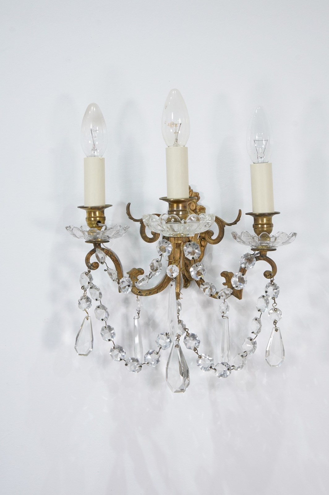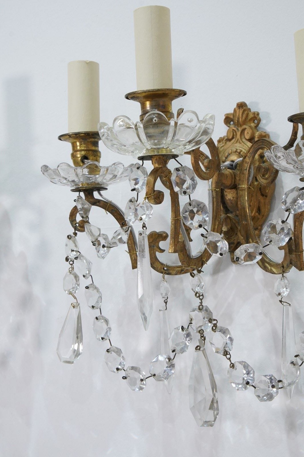 A pretty pair of Napoleon 111 triple branch wall sconces. Each of the three branches terminate with a faux cream card candle light fitting with fluted glass bobèche . The sconces are dressed with swags of faceted glass beads complimented with rows of cut glass icicles and lozenges. Originally for use with candles, now wired for electricity to modern day safety standards ready for immediate installation. Patinated Gilt Bronze wall sconces. France circa 1860.