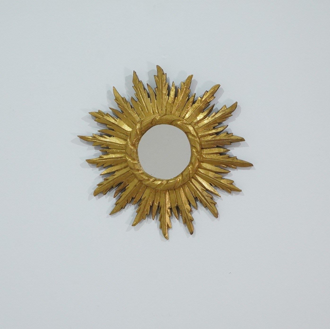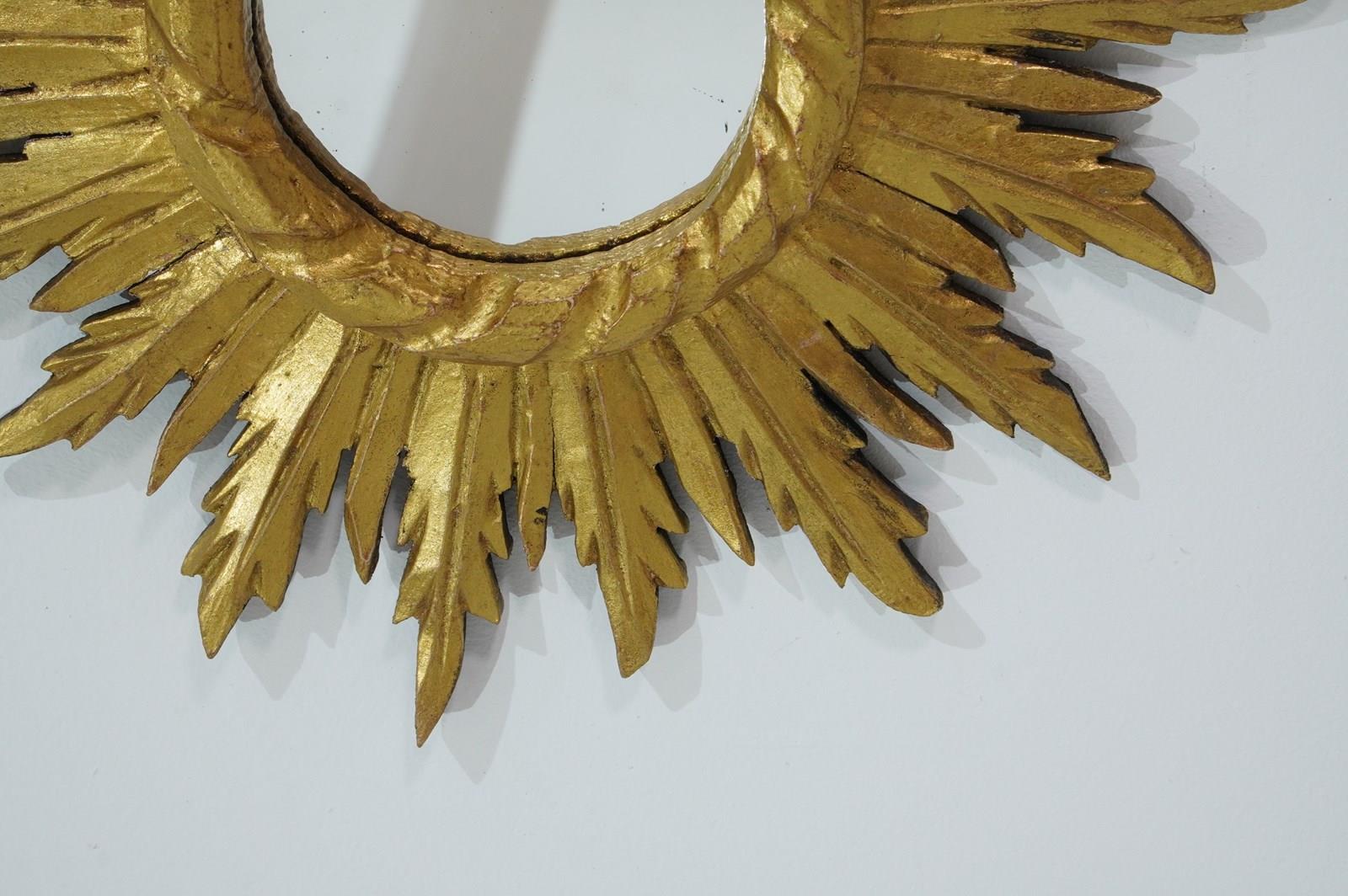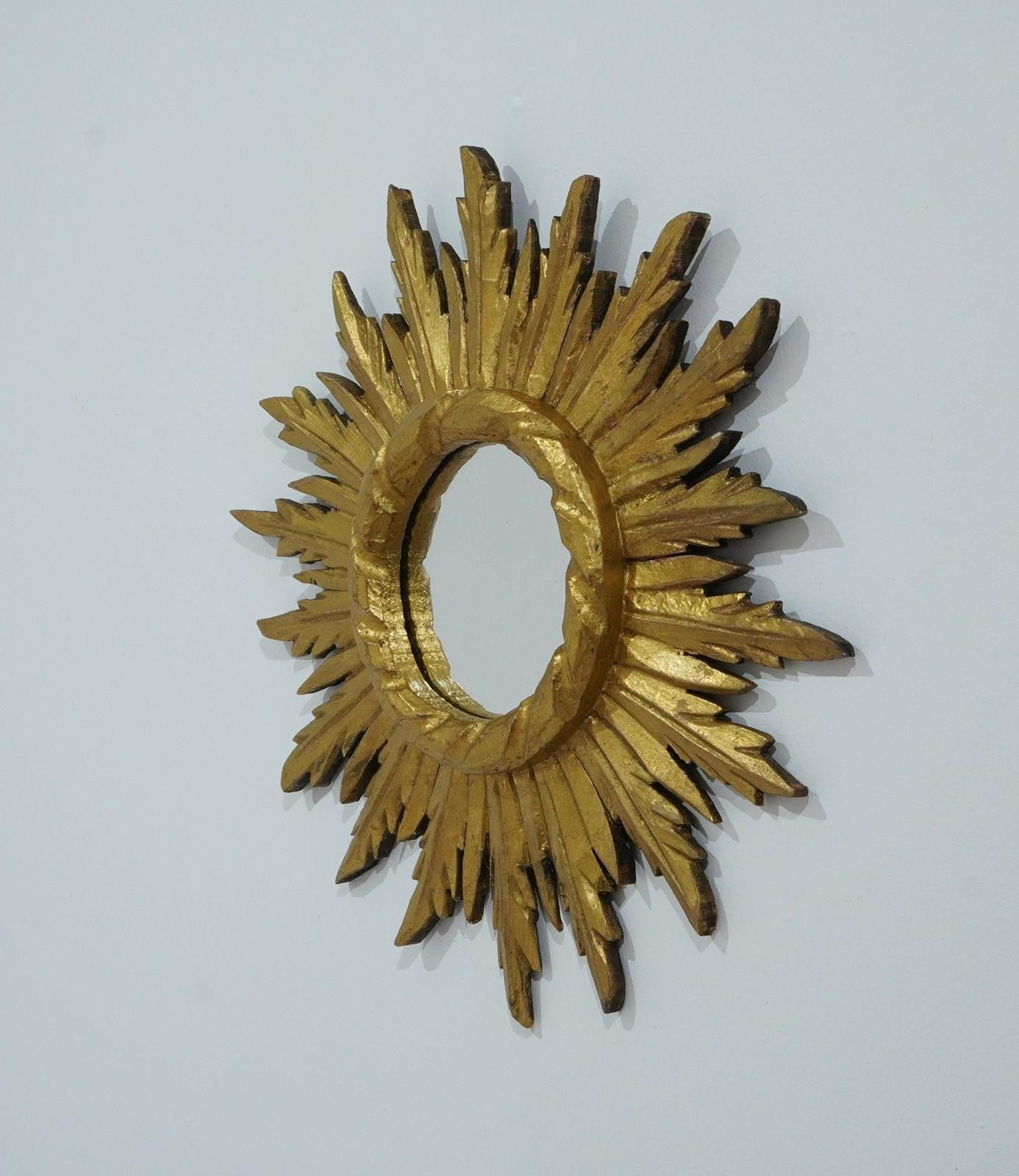 A small mid century wooden sunburst mirror with dramatic rays of bright golden fire all leaping around the original mirror plate. Gilt wood sunburst circa 1960.