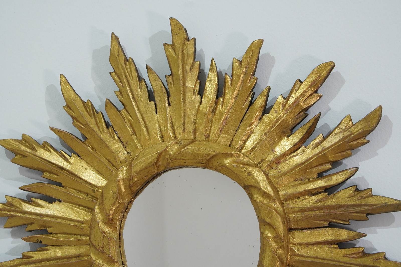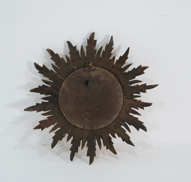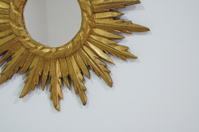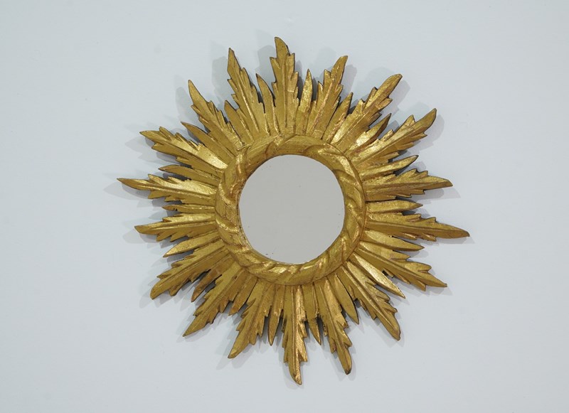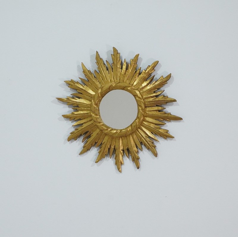 A small mid century wooden sunburst mirror with dramatic rays of bright golden fire all leaping around the original mirror plate. Gilt wood sunburst circa 1960.