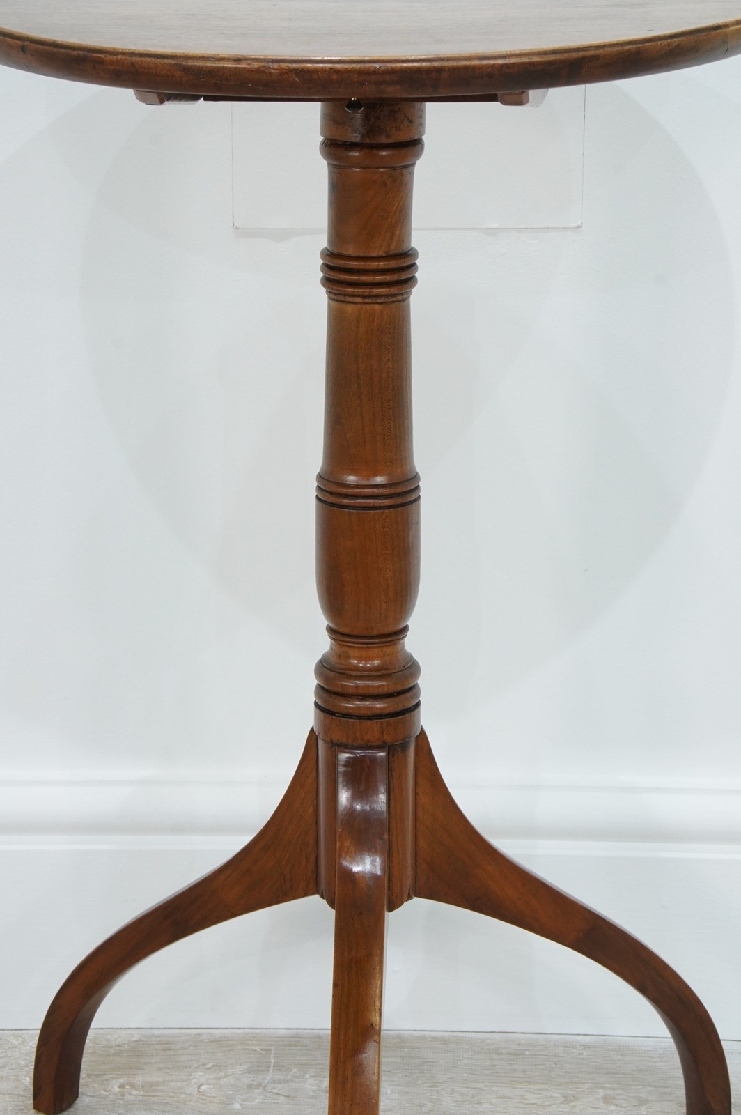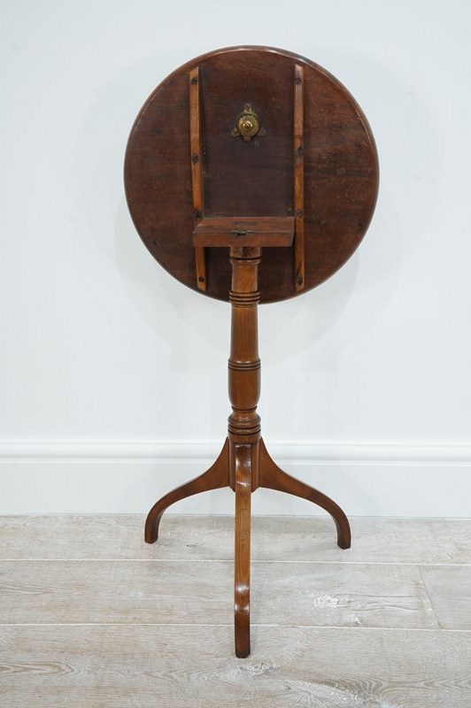 The original catch mechanism to the underside of the table top still remains and can be used to secure it when in use but will allow it to stand in the upright position when released. English mixed wood tripod table. Circa 1830.