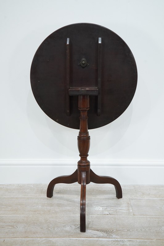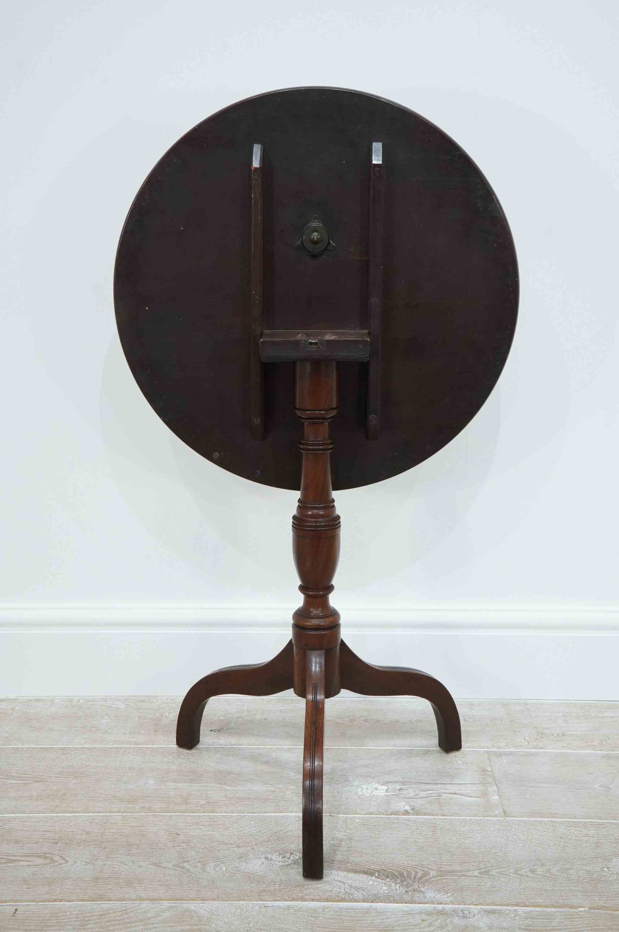 An elegant mahogany tilt top tripod table. The dished tray top was formed from a single piece of mahogany nearly two centuries ago. It is secured upon an elegant turned mahogany triform stem with its original brass catch mechanism beneath. When released the table top can be placed in the upright position. Gorgeous rich colour with a clean polished surface. English tilt top tripod table circa 1830.