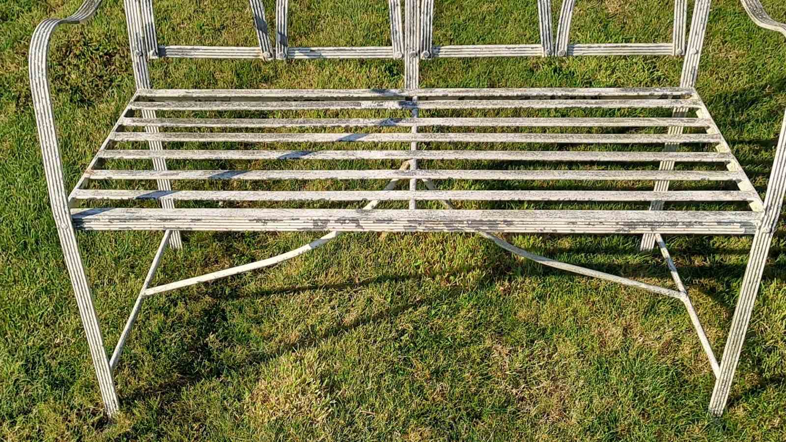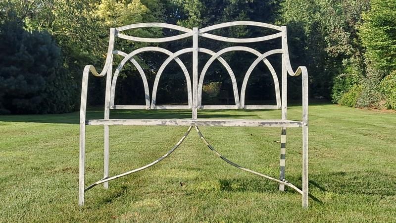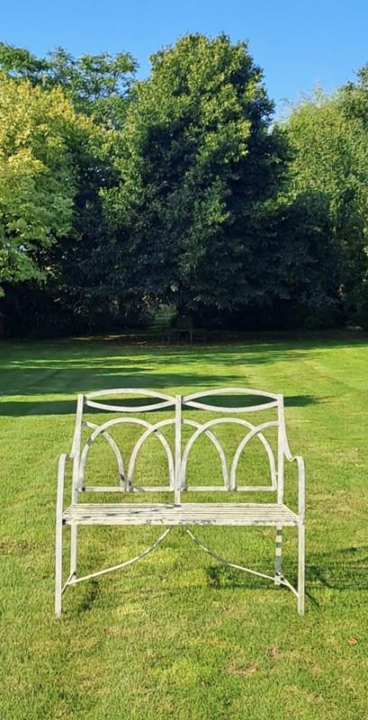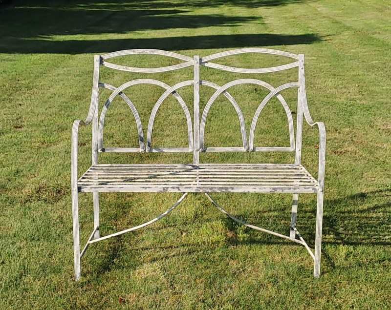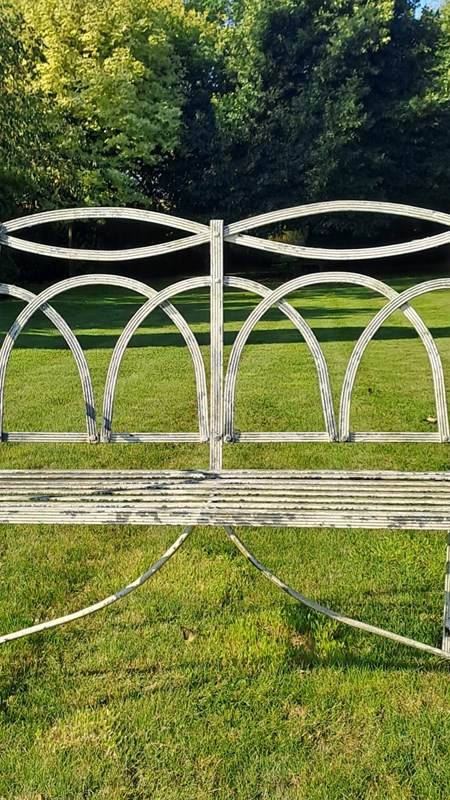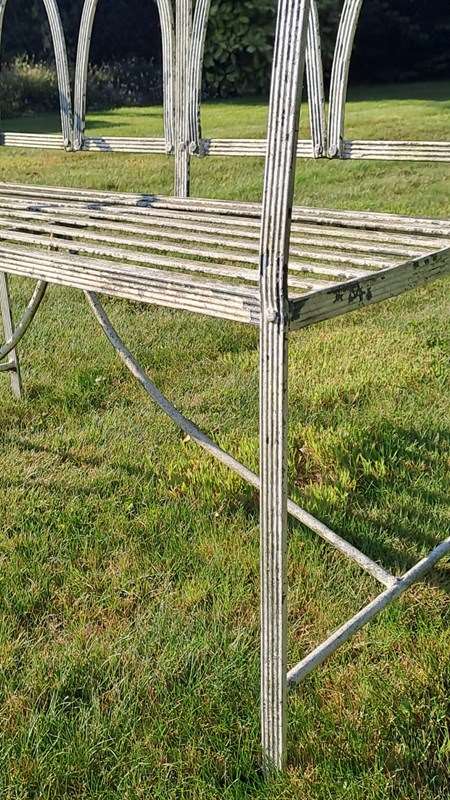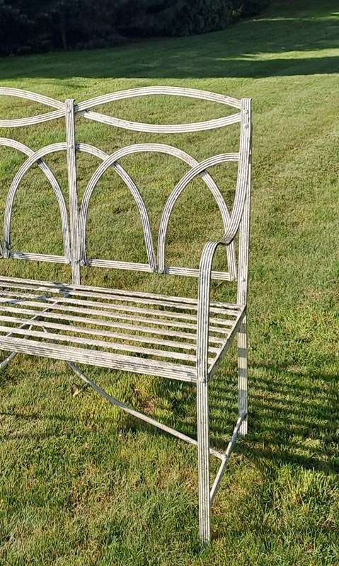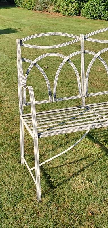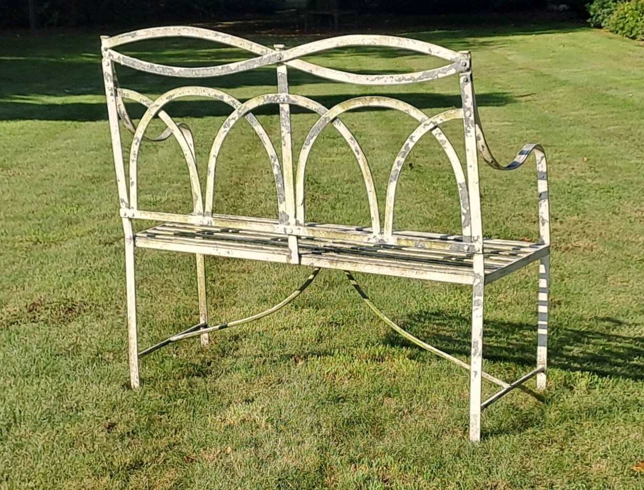 A late 19th century copy of a Regency strapwork hoop back garden bench. Superb structural condition. Heavy duty wrought iron. Old weathered painted surface. Some paint loss revealing the ribbed iron frame work beneath. An extremely pretty bench, perfect for a country lawn or a more formal setting displayed within a garden arbour. English strapwork bench in old paint.