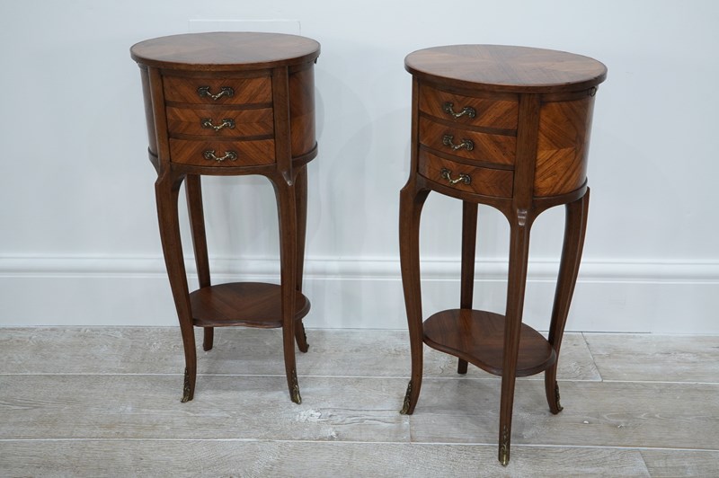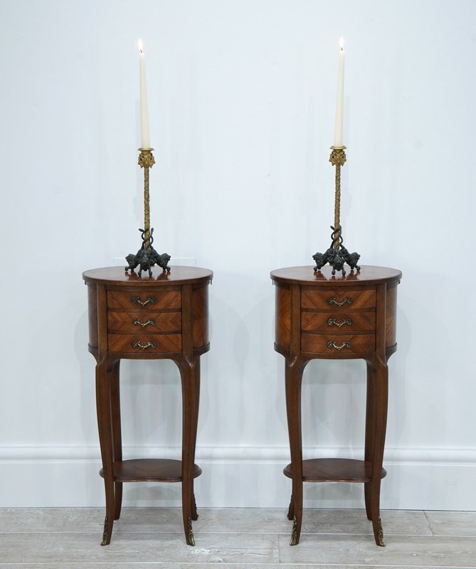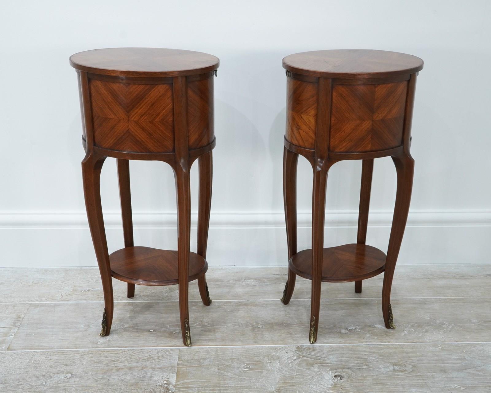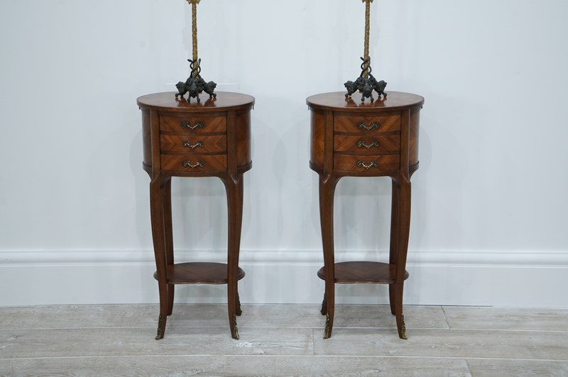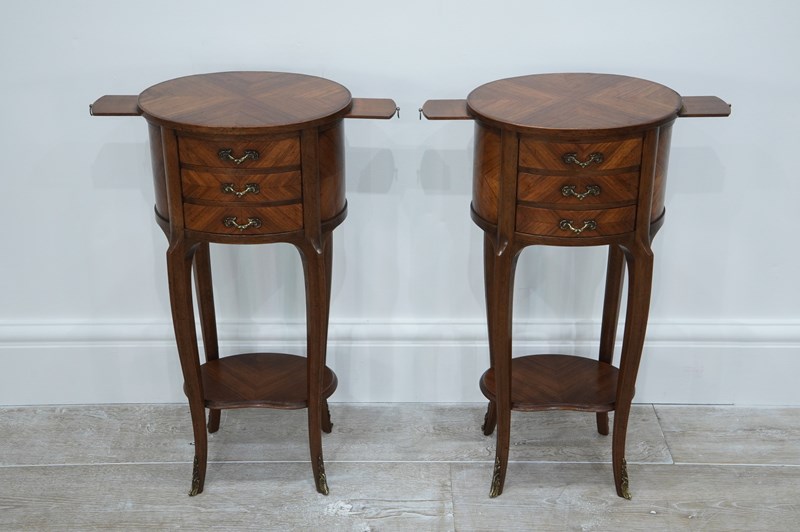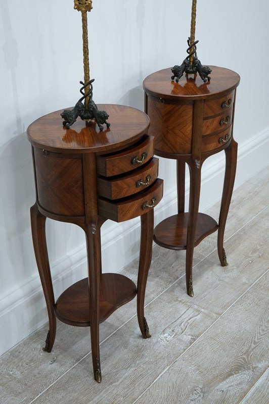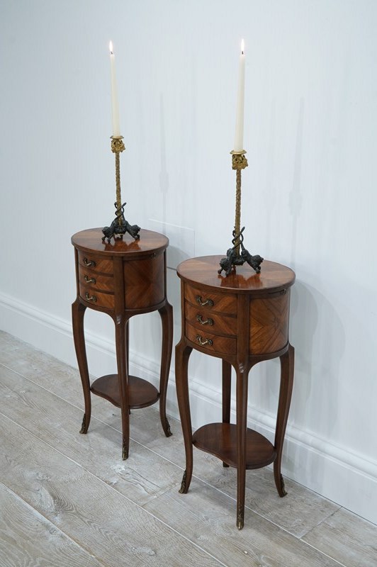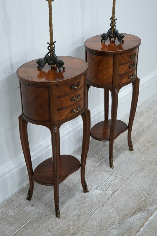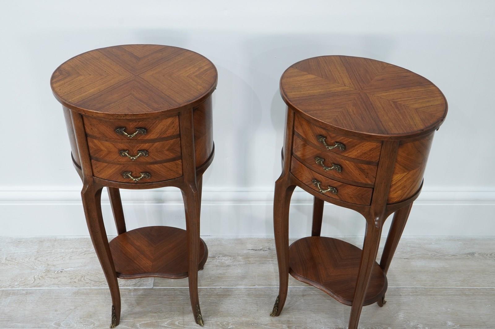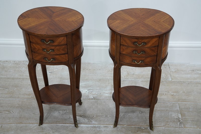A neat pair of French bedside tables with shelves beneath. The oval tops to these pretty bedsides boast a series of walnut veneers creating a uniform chevron design this being repeated on the sides, backs and drawer fronts. Each bedside has the advantage of two small pull out trays to the tops, perfect for the morning beverage! Below are three drawers, each with the original polished French brass handle.
